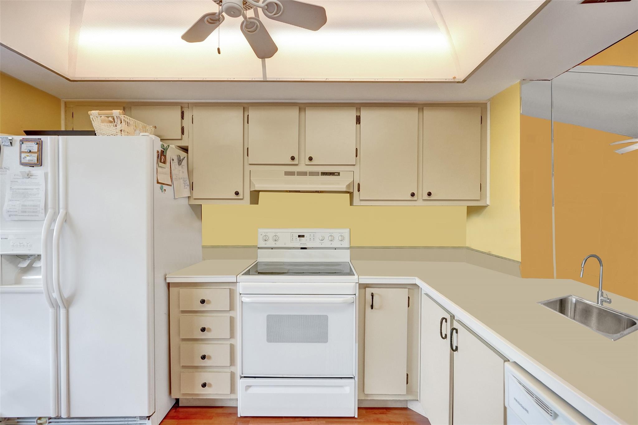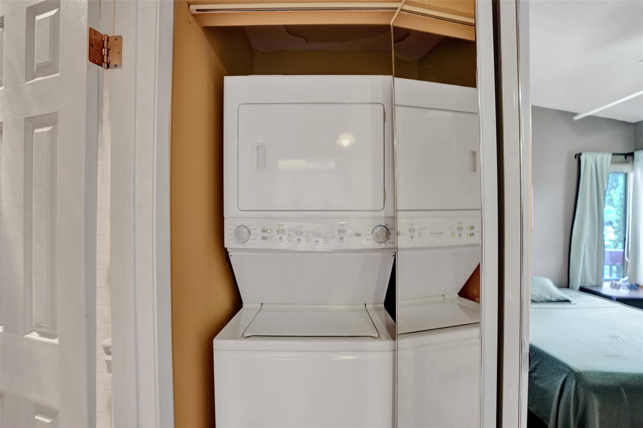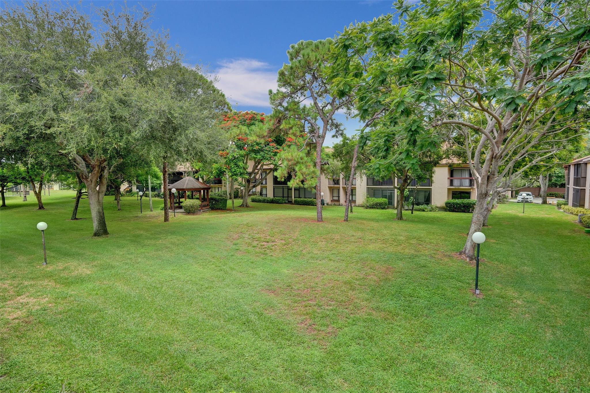 2 Bed & 2 Bath corner unit on 2nd floor w/volume ceilings. Laminate floors in main areas & carpet in bedrooms. Bright kitchen w/white appliances & atrium window. Large primary bedroom w/walk-in closet, separate vanity, & shower-only bath, plus screened balcony. Spacious 2nd bedroom. Large screened patio overlooking garden views. New washer, dryer & water heater. A/C replaced 2010. One pet allowed (under 25 pounds) & service animals welcome. No rentals allowed during first year of ownership. Building has 2024 roof, no special assessments, recently passed 40-year inspection, & association has full reserves. Amenities include large pool, hot tub, covered BBQ & seating areas, paddle ball, shuffleboard, clubhouse w/full kitchen & fitness center. Guard-gated at night w/patrol. 3% convention loan