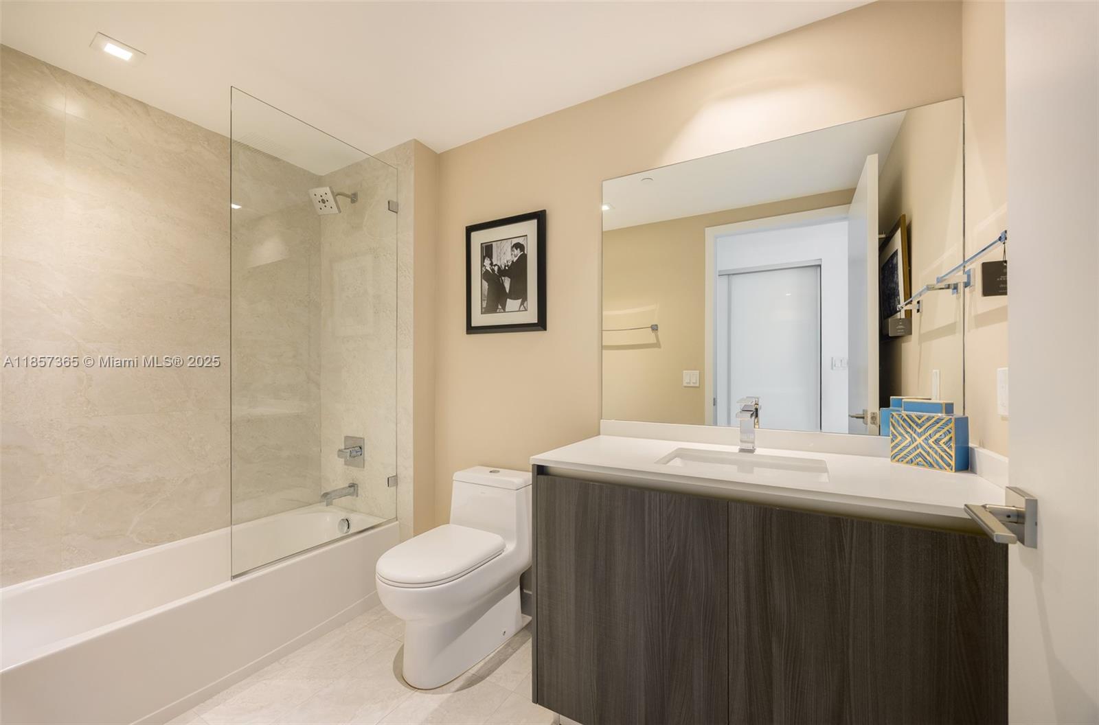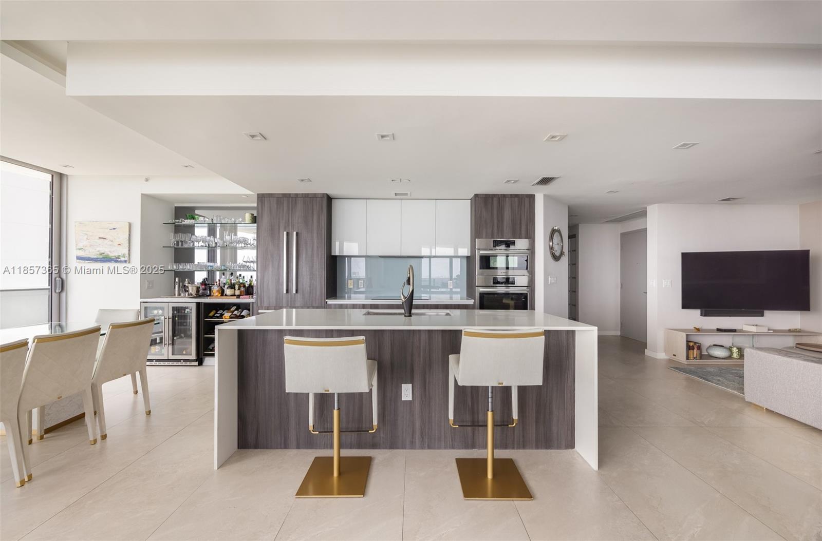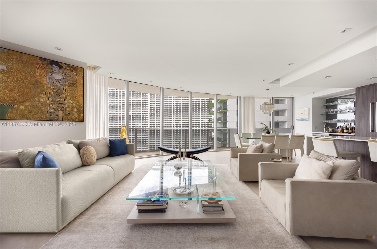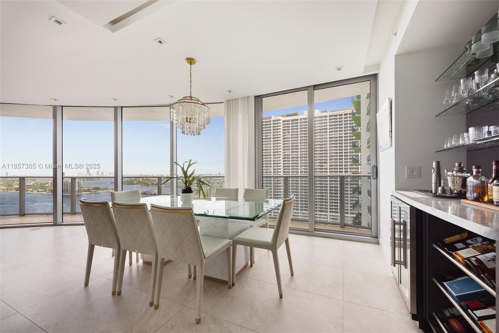 This upscale corner residence at Aria On The Bay combines luxury, comfort, and breathtaking views of the bay and Miami skyline. Featuring 3 bedrooms, a den, and 4 bathrooms, the unit offers both style and functionality. Two private elevators open to a private foyer, ensuring exclusive access and convenience. The spacious living area is enhanced by floor-to-ceiling windows, a custom drop ceiling, smart home, porcelain flooring, integrated speakers in every room and a bespoke bar area, all beautifully furnished with custom pieces by MORADA. Step out onto the expansive wrap-around terrace to enjoy panoramic city and water views. The unit features numerous high-end features. *Furniture available for separate purchase.