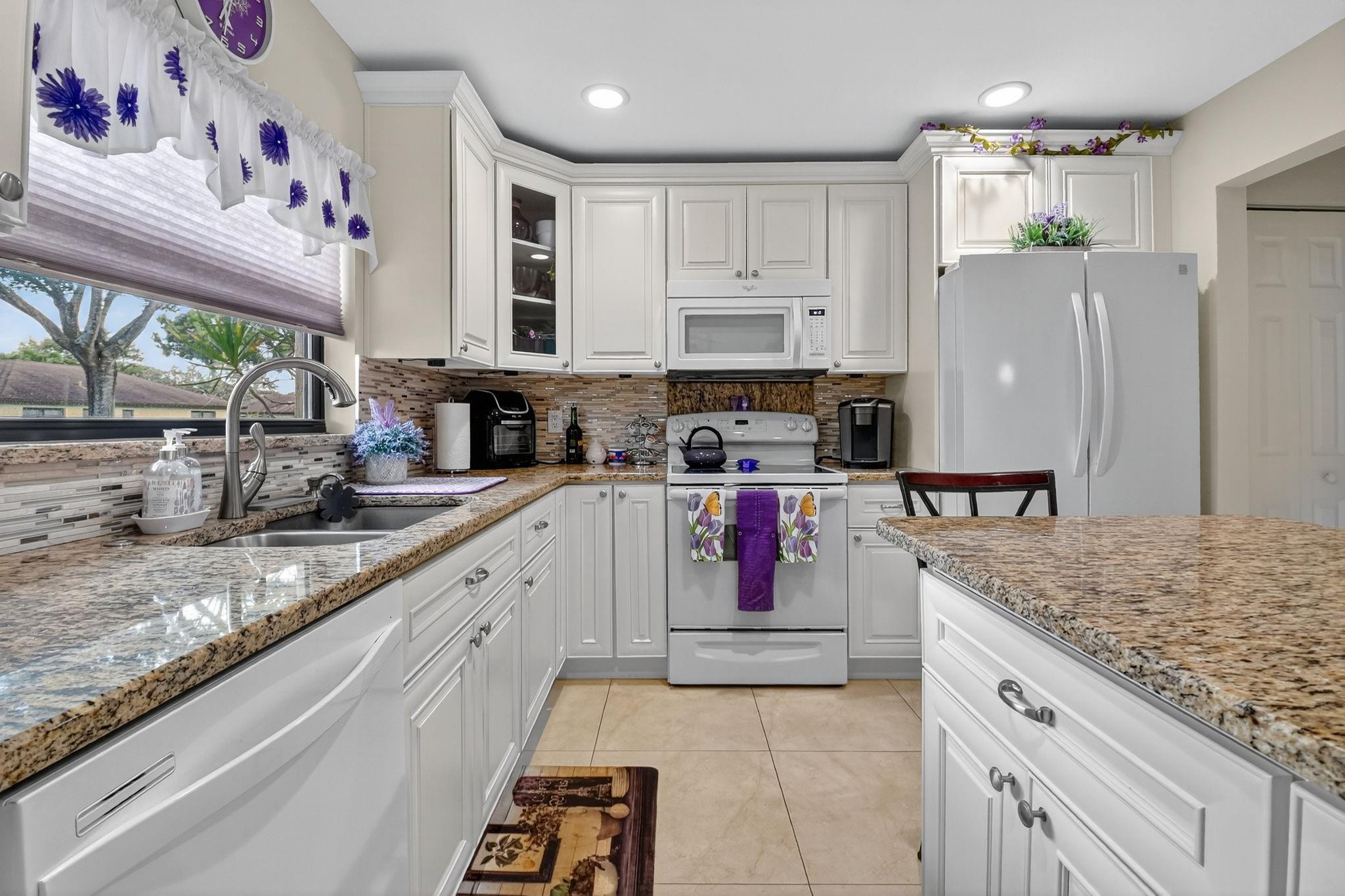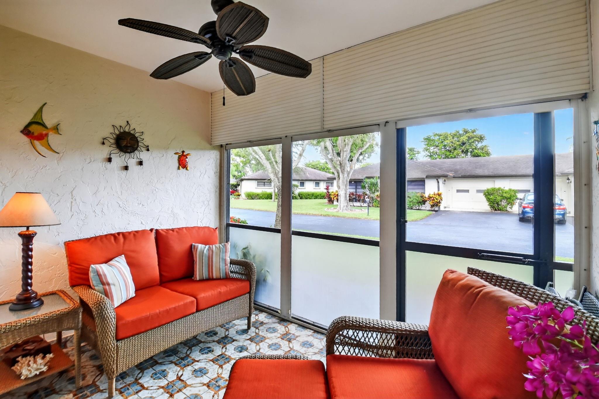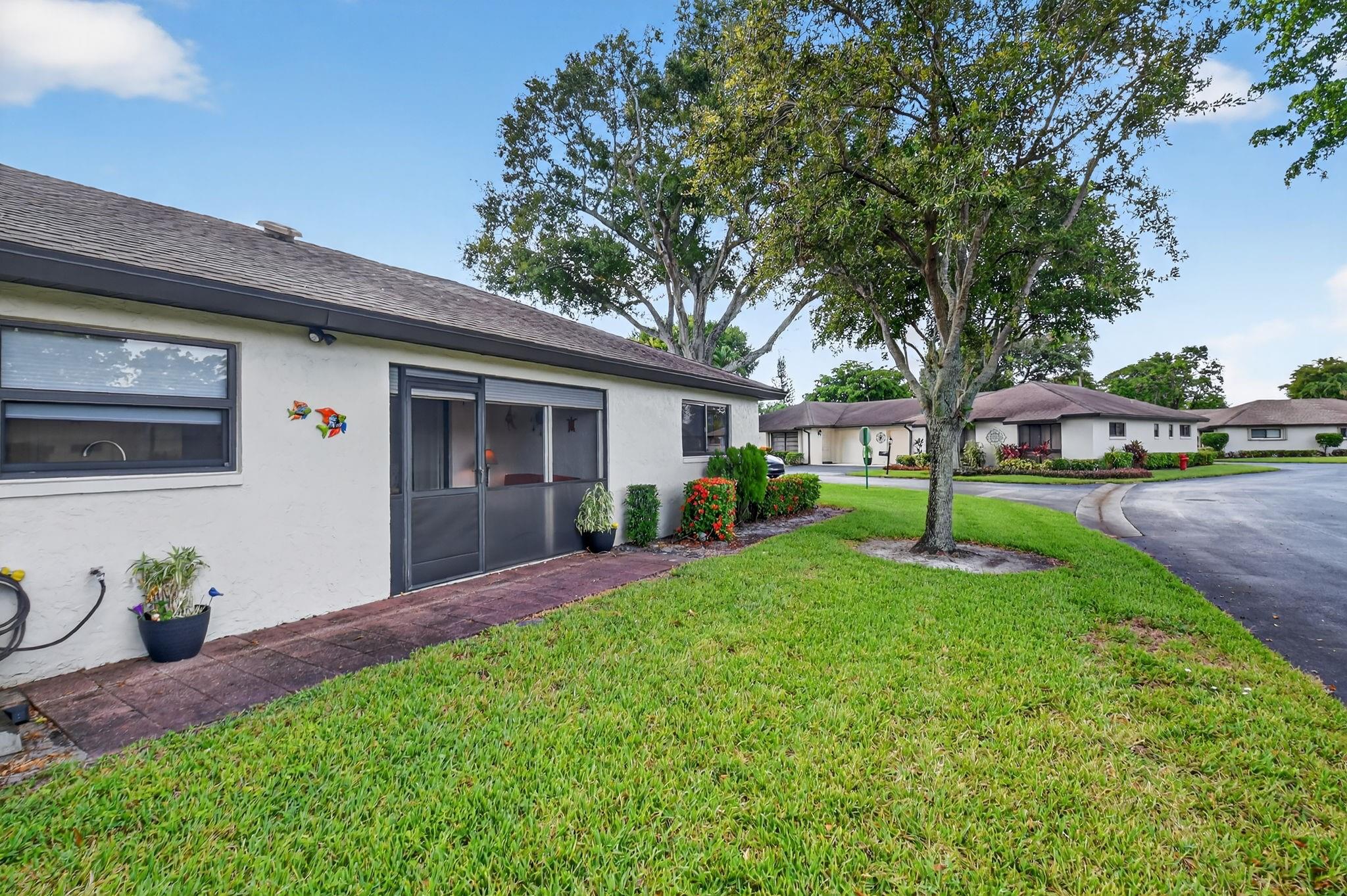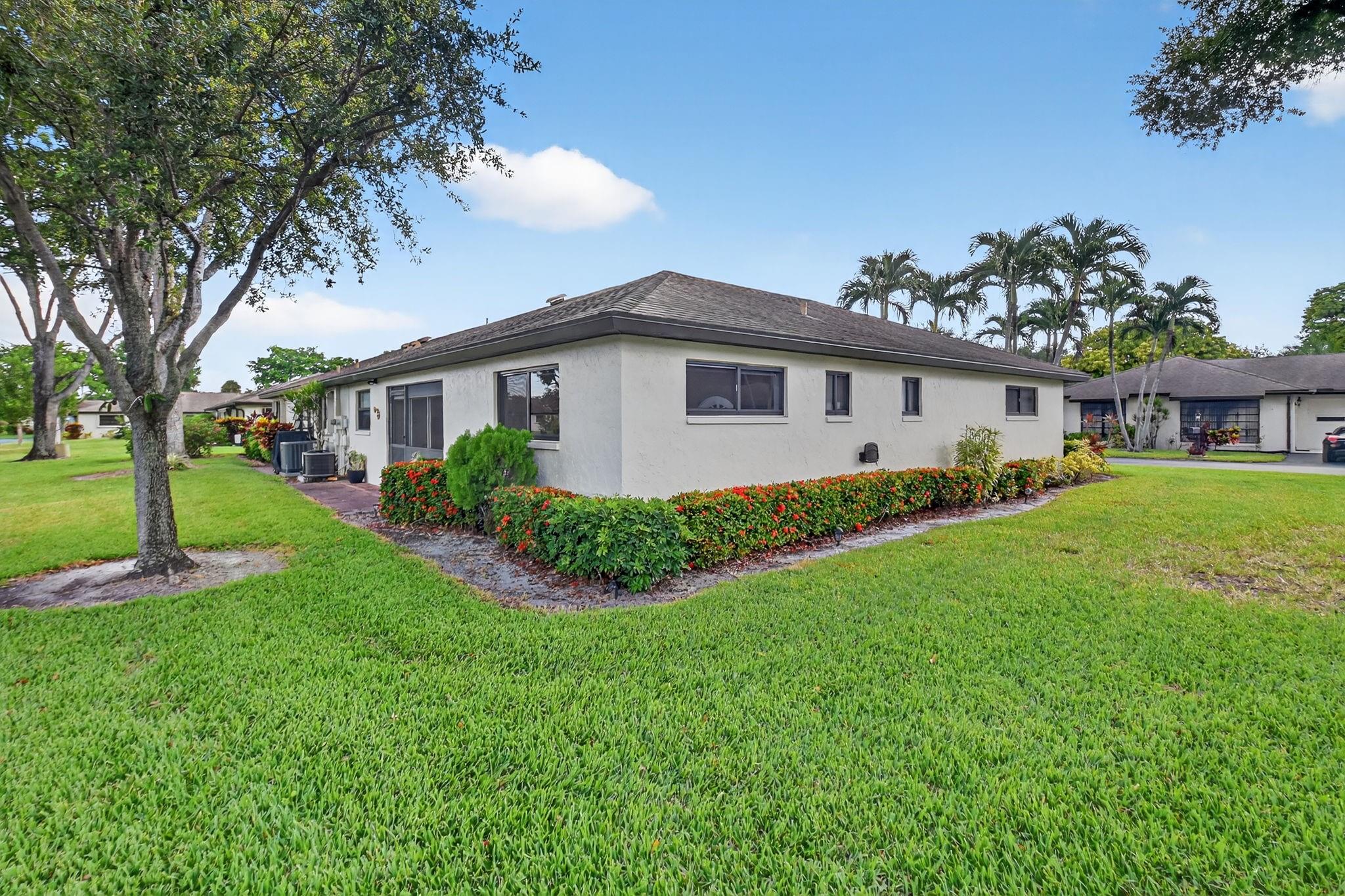 Beautiful move-in ready villa featuring wood-look tile throughout main living areas. The updated kitchen boasts granite counters, a large island, and two spacious pantries. Renovated bathrooms, plantation shutters, hurricane impact windows, and a newer AC (2022) offer comfort and style. Stacked washer/dryer in the garage with attic insulation and a new pull-down ladder. Enjoy the screened lanai with Italian tile leading to your outside patio. The community features 6 pools, 6 clubhouses, and the HOA includes exterior maintenance, roof care, building insurance, lawn care, water, basic cable, and internet. Located less than 15 minutes from the beach, shopping, dining, and vibrant Atlantic Avenue. South Florida living at its best, don't miss this one!