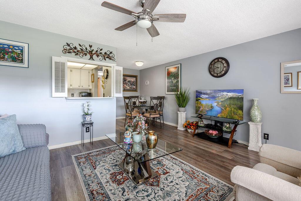 Welcome to this well-maintained second-floor condo in the sought-after gated community of Century Village in West Palm Beach. This light-filled 1-bedroom, 1-bath unit offers a comfortable and convenient lifestyle with 24/7 security. Enjoy the ease of access to nearby amenities--just a short walk to the pool, laundry facilities, and a private storage room. The condo features a kitchen with a passthrough to the living area, a large pantry, and durable laminate flooring throughout. The spacious bedroom offers generous closet space, while the screened-in patio provides a peaceful spot to relax.