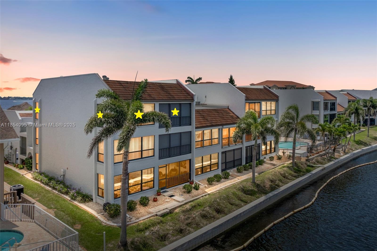 PENTHOUSE with DIRECT GULF ACCESS & STUNNING WATERFRONT VIEWS! Across from the exciting Jaycee Park renovation in SE Cape Coral, this FULLY FURNISHED 2BR/2BA top-floor condo overlooks the 200+ ft Navarro Canal with just one turn to the river & Gulf. Enjoy a private screened balcony/sunroom, vaulted ceilings, impact windows, stone feature wall, spacious kitchen, walk-in closet, and in-unit laundry. Community offers crystal-clear pool, scenic walkways, and optional dockage (assessments paid). Newer A/C, water heater, range, disposal, and re-piped plumbing. Beach Pkwy Promenade location close to SWFL’s best beaches, dining, and shopping. 55+ community, move-in ready—live the Florida waterfront lifestyle!