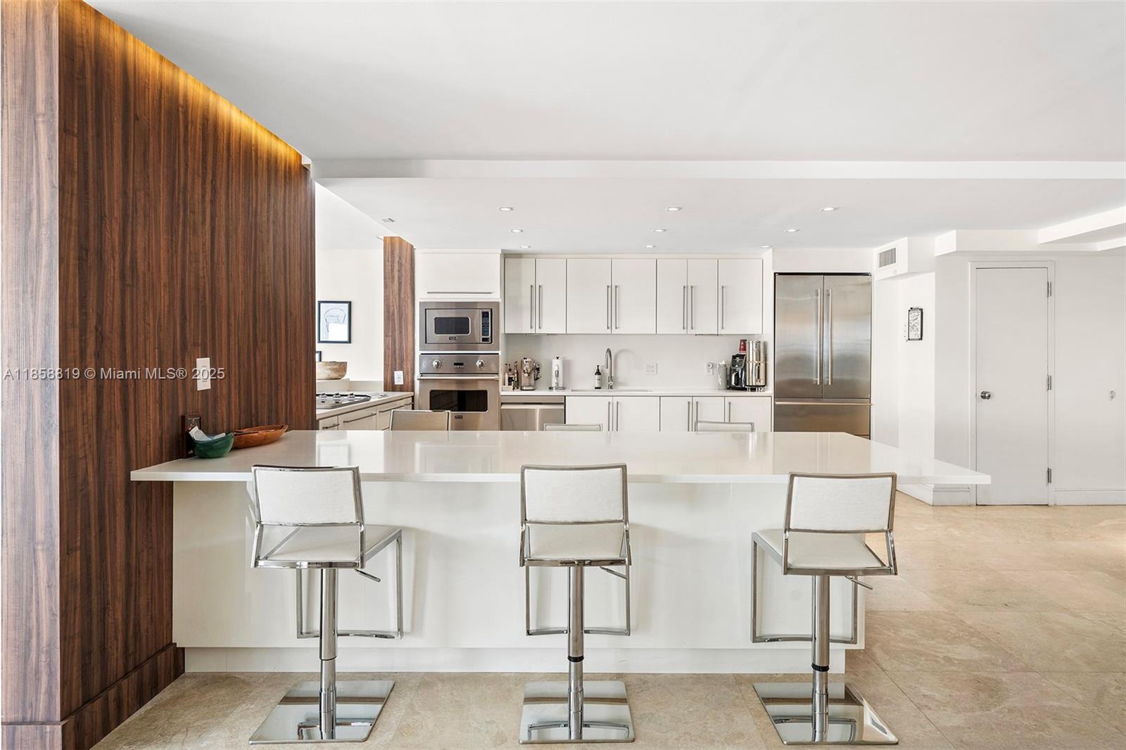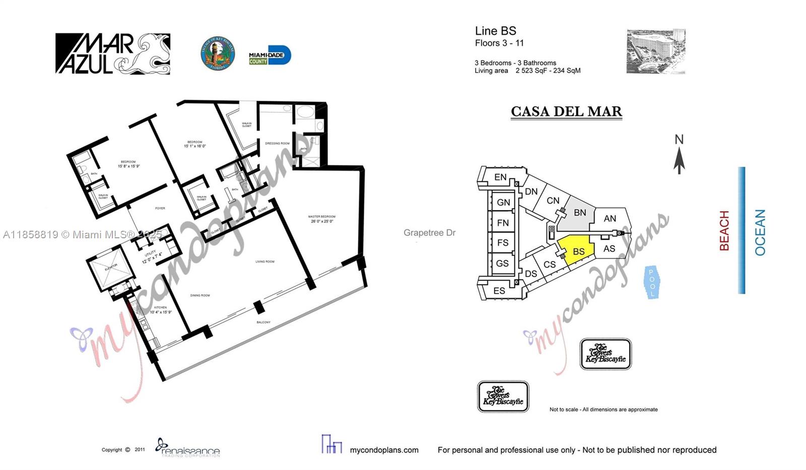 Rarely on the market! Located at the prestigious Mar Azul Condominium, an oceanfront boutique residence with only 126 units & direct beach access. This spacious 3-bedroom, 3-bath home spans 2,523 sq.ft. The elegant open layout blends a fully renovated kitchen with expansive living and dining spaces, perfect for entertaining. Each bedroom is a generous suite with modern baths, complemented by abundant storage. A wraparound balcony embraces the reception and primary suite, unveiling uninterrupted ocean vistas. Semi private elevator lobby shared with just one neighbor. The generous scale and unique layout of this residence are rarely found in Key Biscayne, making it an extraordinary opportunity.