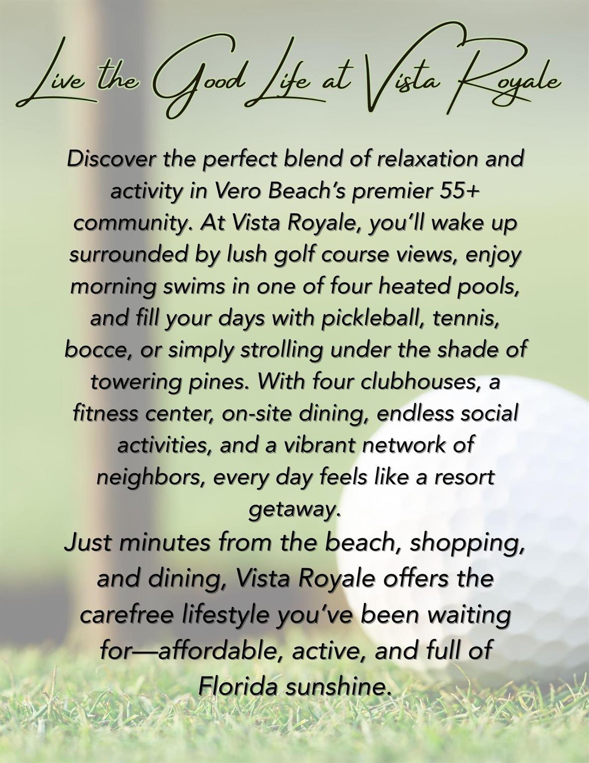 THE BEST DEAL IN VISTA ROYALE! This beautifully maintained 2-bed, 2-bath condo in the active 55+ community of Vista Royale istucked among majestic Australian Pines & the golf course, offering rare privacy while still being just a short walk to it all. Recent updates: 2022 roof + 2025 concrete restoration, w/ all assessments paid in full for peace of mind. HOA fee covers water, sewer, trash, cable, & access to endless amenities--4 clubhouses w/heated pools, fitness centers, an on-site restaurant, & so much more. Mangrove Sands- Vista Royale's on-site 27-hole course is ranked among FL's Top 10! Super convenient to everything Vero has to offer & more!