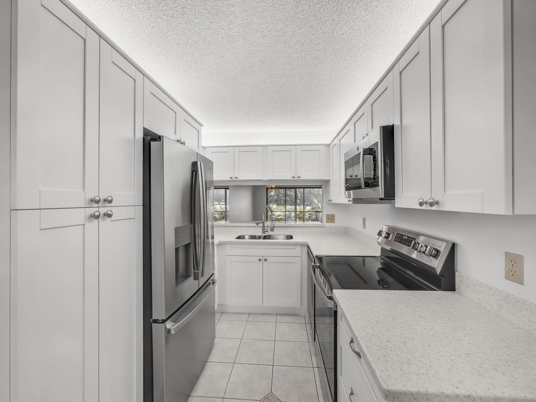 Rarely Available First Floor End Unit with views of the 7th hole fairway and green! This Condo features a Brand New Kitchen with White, Soft Close Shaker Cabinets, Stainless Steel GE Appliances, Quartz Counters and over-cabinet lighting. Other updates include new luxury vinyl plank flooring, new carpet in bedrooms, new modern vanity in the primary bath and extra windows due to the end unit location. There is a large screened patio with a door to access the golf course and a storage room. The building recently had the roof replaced which has been paid for by the current owner. Keystone is a great community with a pool, clubhouse and easy access to the areas best beaches, shopping, dining, A rated schools and the Jupiter Medical Center..