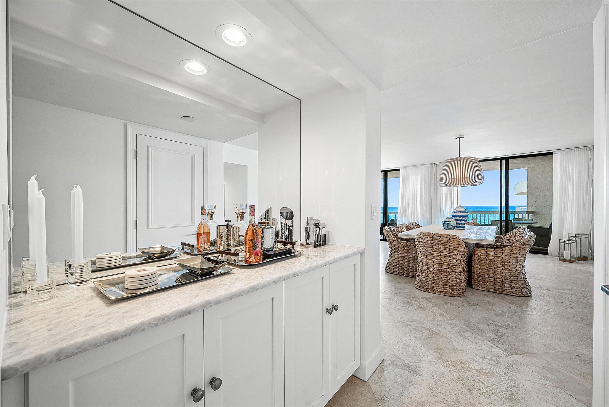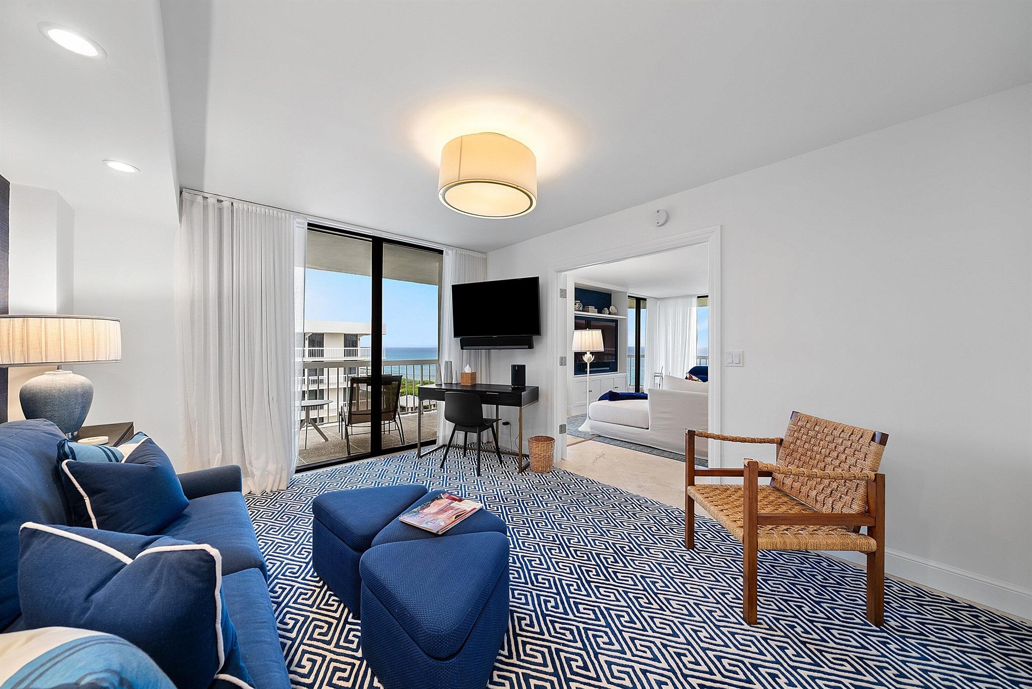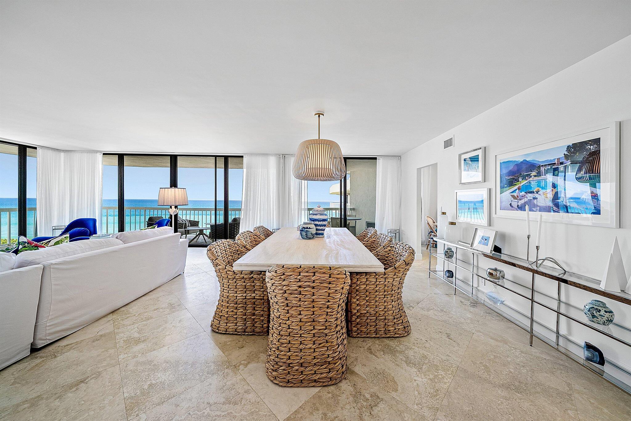 Ocean Front Penthouse with the water views everyone wants! This 3 bedroom, 2.5 bath residence is spacious and gracious & renovated, with 2 balconies that provide east and west exposures offering an abundance of light to showcase the beautiful, colorful interiors furnished by an international interior designer and is offered fully furnished/''turnkey''. The outdoor seating on the balconies offers additional living areas to enjoy the ocean views, breezes and westerly sunsets. The Meridian has completed the Milestone requirements, has a newly renovated pool area and spa on the ocean with a stairway to the beach, Entry gate is manned 24 hours, full time manager, tennis courts, garage parking. Meridian offers the best of luxury living!