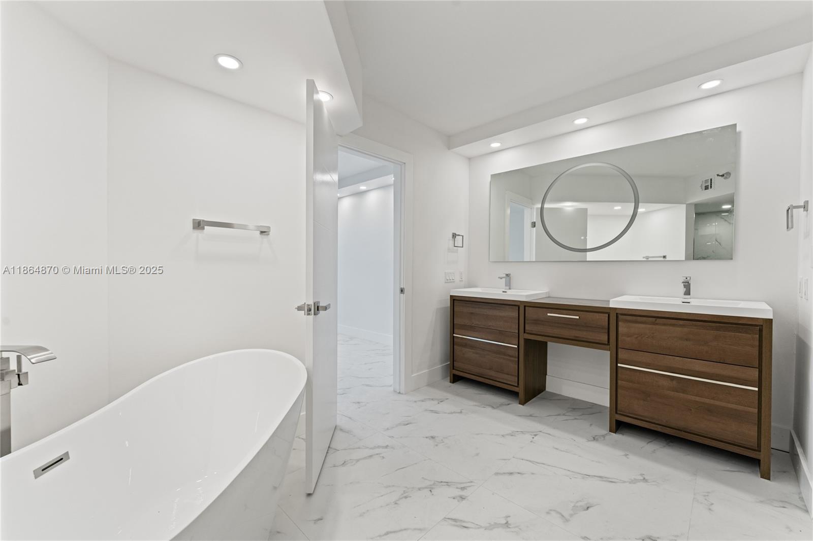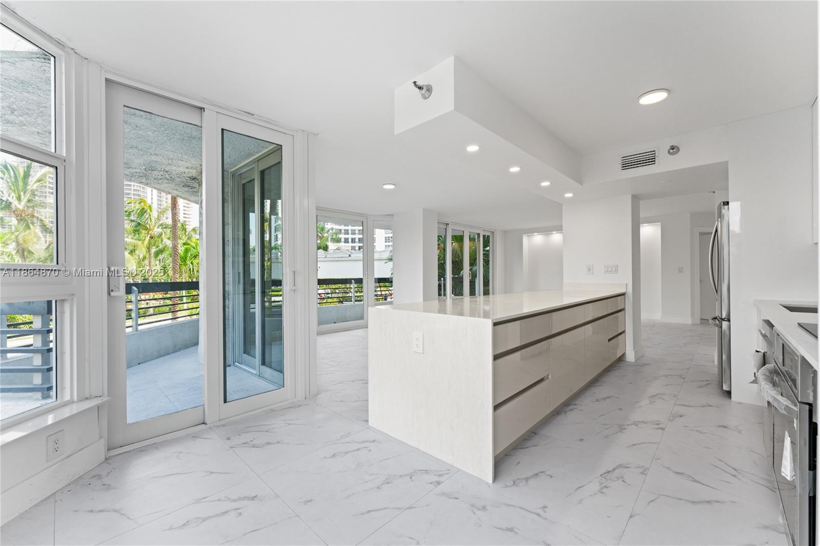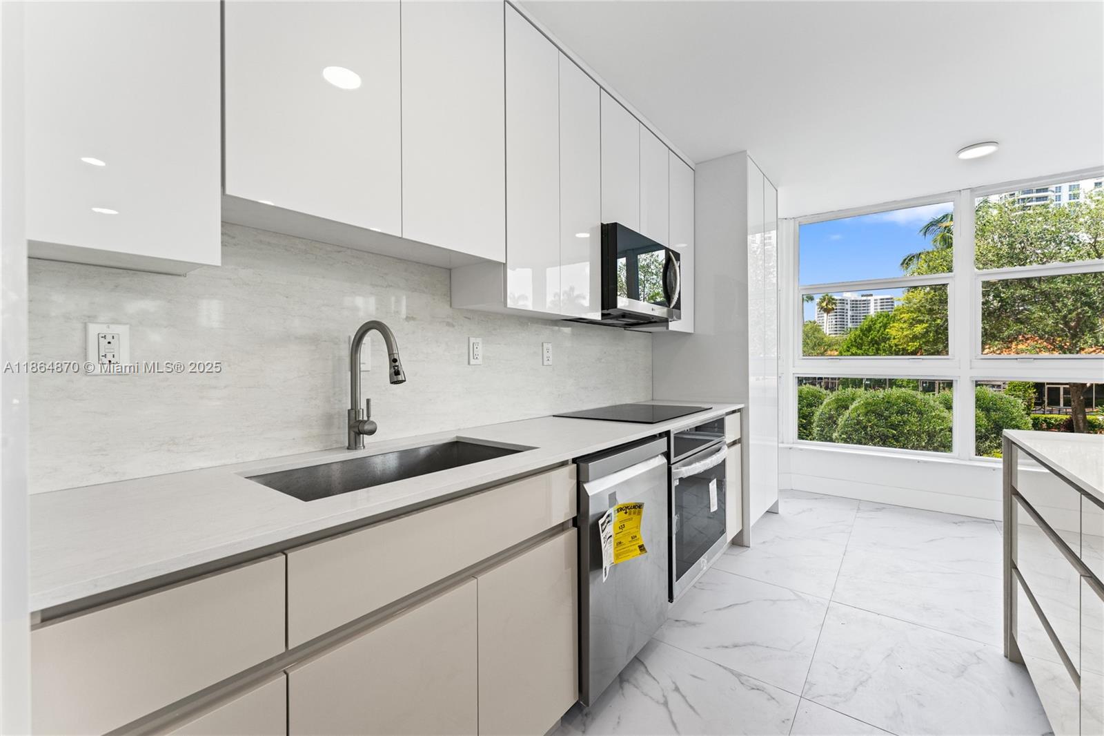 Luxurious and modern corner condo at Mystic Pointe with a spacious open floor plan, unique floor-to-ceiling IMPACT windows, and abundant natural light. This residence showcases top-of-the-line upgrades with porcelain tile throughout, a brand new open-concept kitchen designed with premium finishes, and new state-of-the-art appliances. The primary suite features an updated en-suite bath with dual vanities, antifog mirror, linear drain, and freestanding soaking tub. New washer and dryer. Designer style custom closets provide ample storage. Additional improvements include upgraded electric and plumbing. Community amenities include gym, tennis, pickleball, restaurant, marina, dog park, EV stations, and more. Close to houses of worship, beaches, Don Soffer Trail, Aventura Mall, and airports.