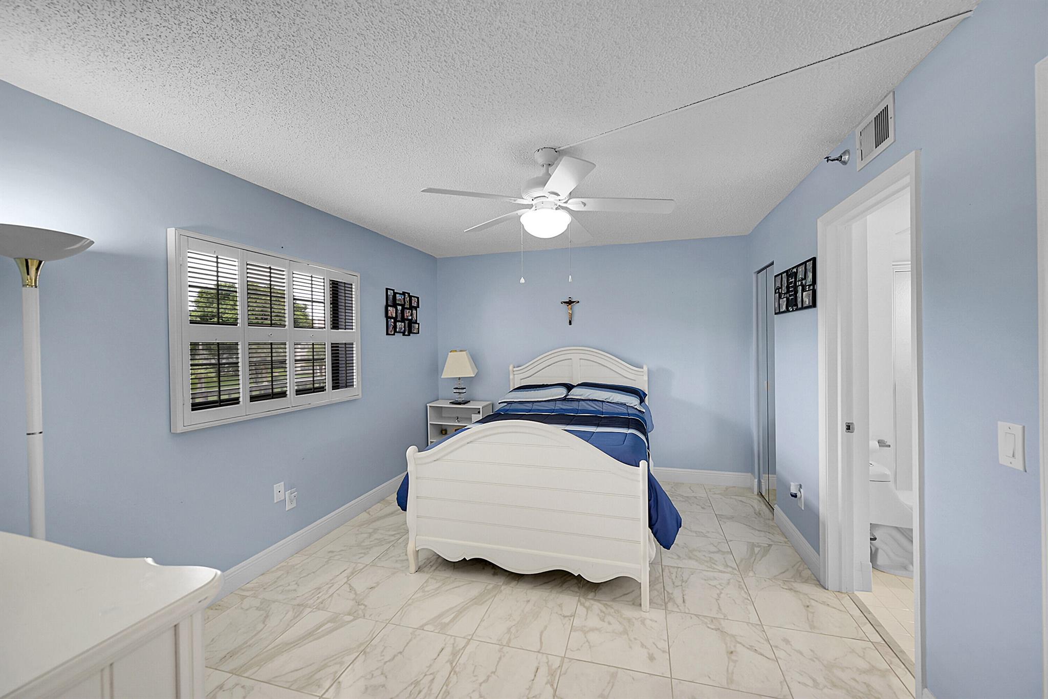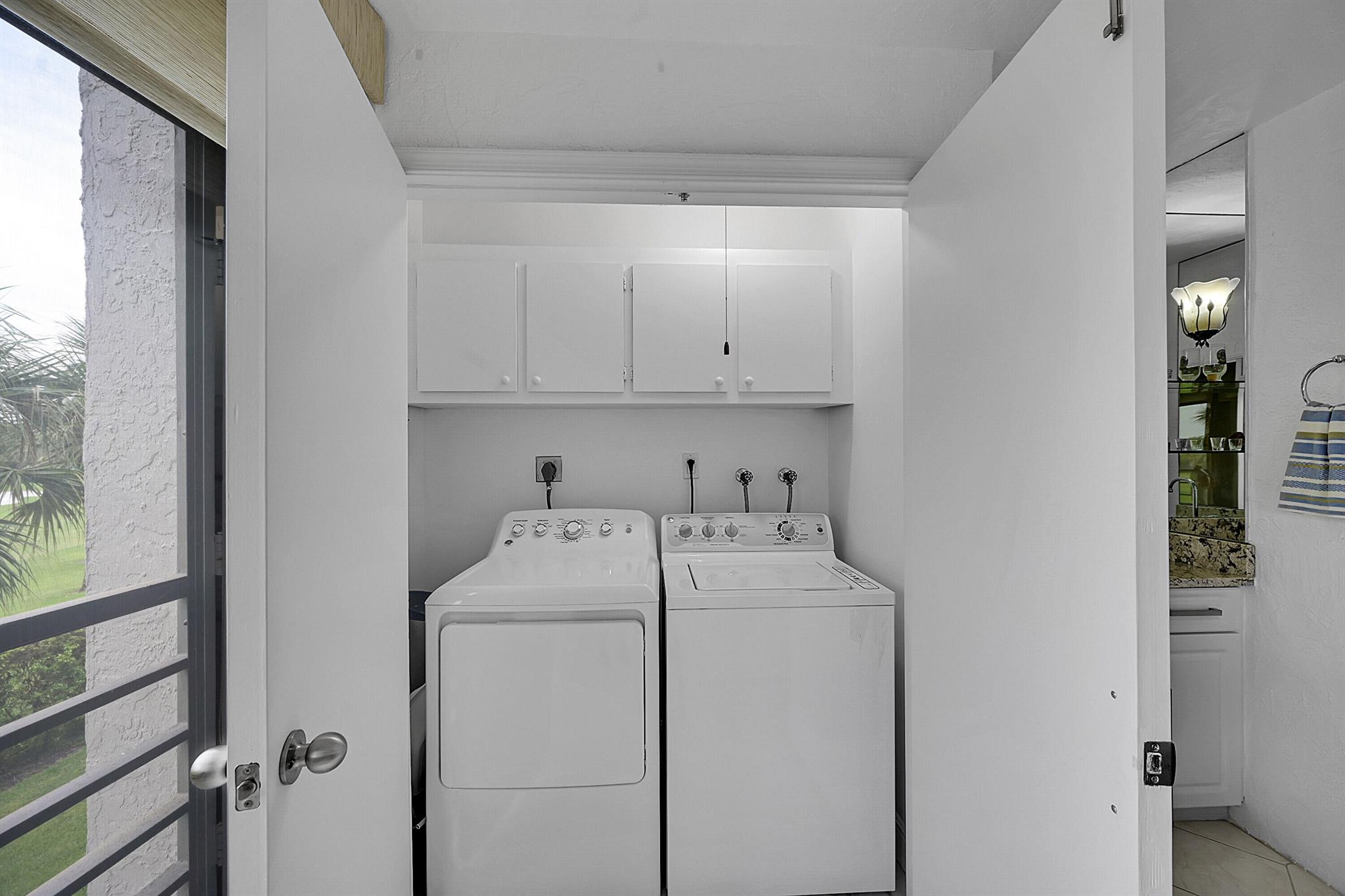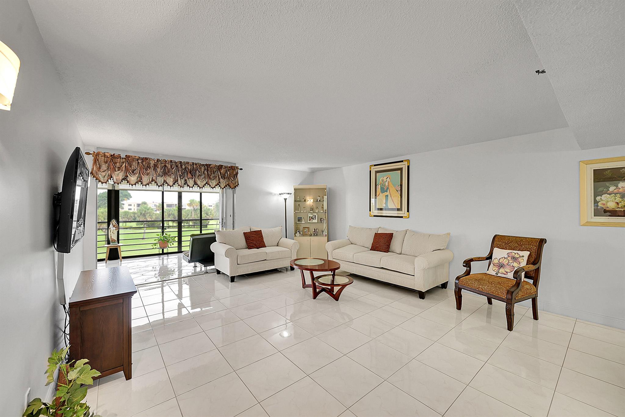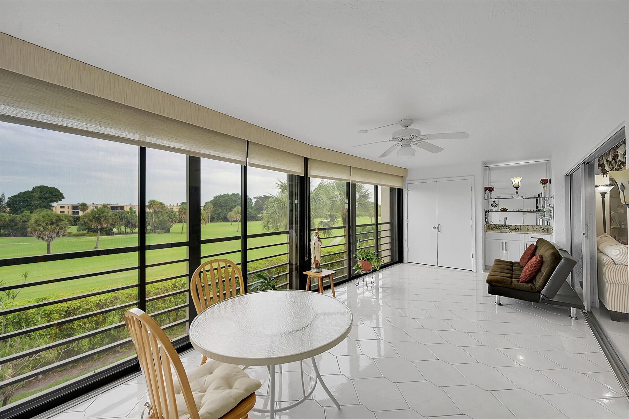 This wonderful updated 55+ condo will not disappoint. The minute you walk in and see the beautiful golf course view you will want to make this your next home. Unit has over 1500 sq ft of living with tile throughout that continues to glassed Patio that also features roll down shutter, added cabinets and sink. Lots of closets and storage in unit plus additional storage on Patio and designated cage by elevator. Updated bathrooms w/ granite, a new over-sized shower and white cabinetry are all beautifully done. The Patios includes 2 heated pools w/Jacuzzi, tennis, clubhouse, gym & BBQs. One covered parking spot is yours plus ample parking for guests. The Patios have completed concrete, painting and passed the inspection! 2026 Budget attached under documents