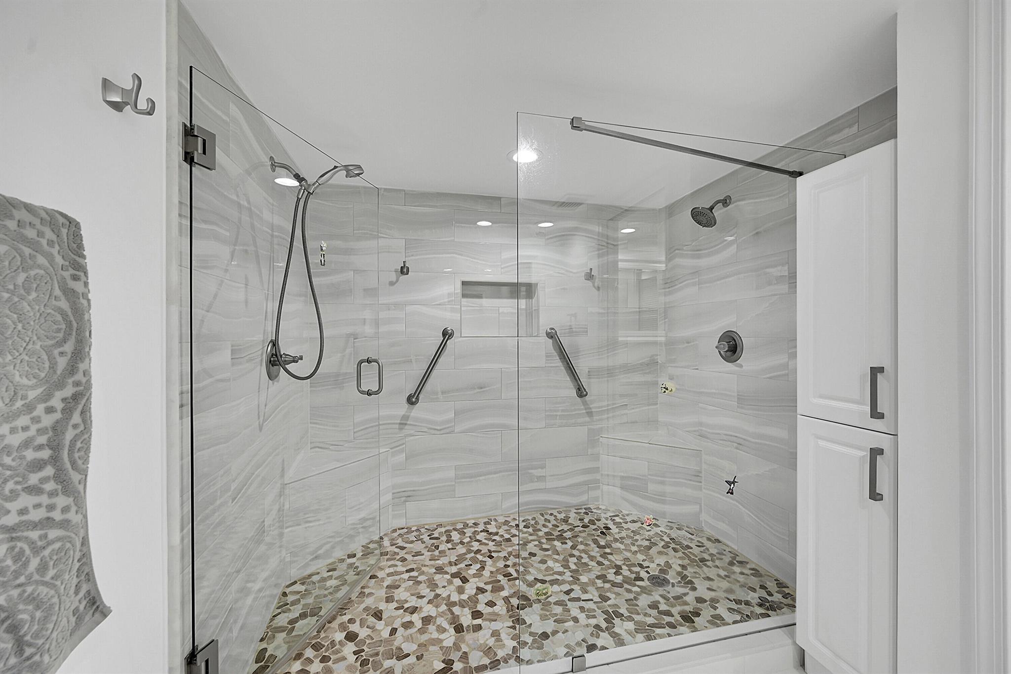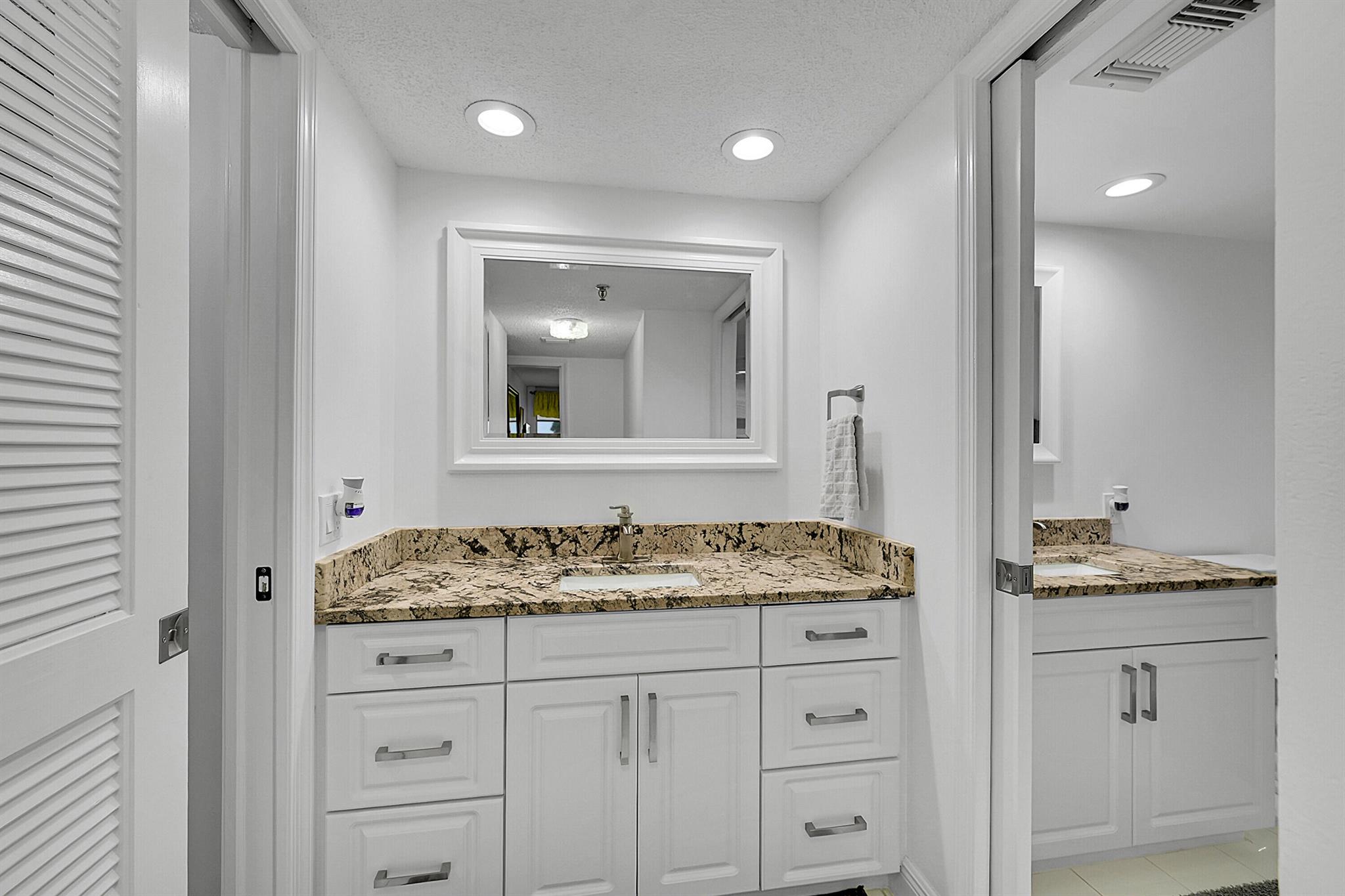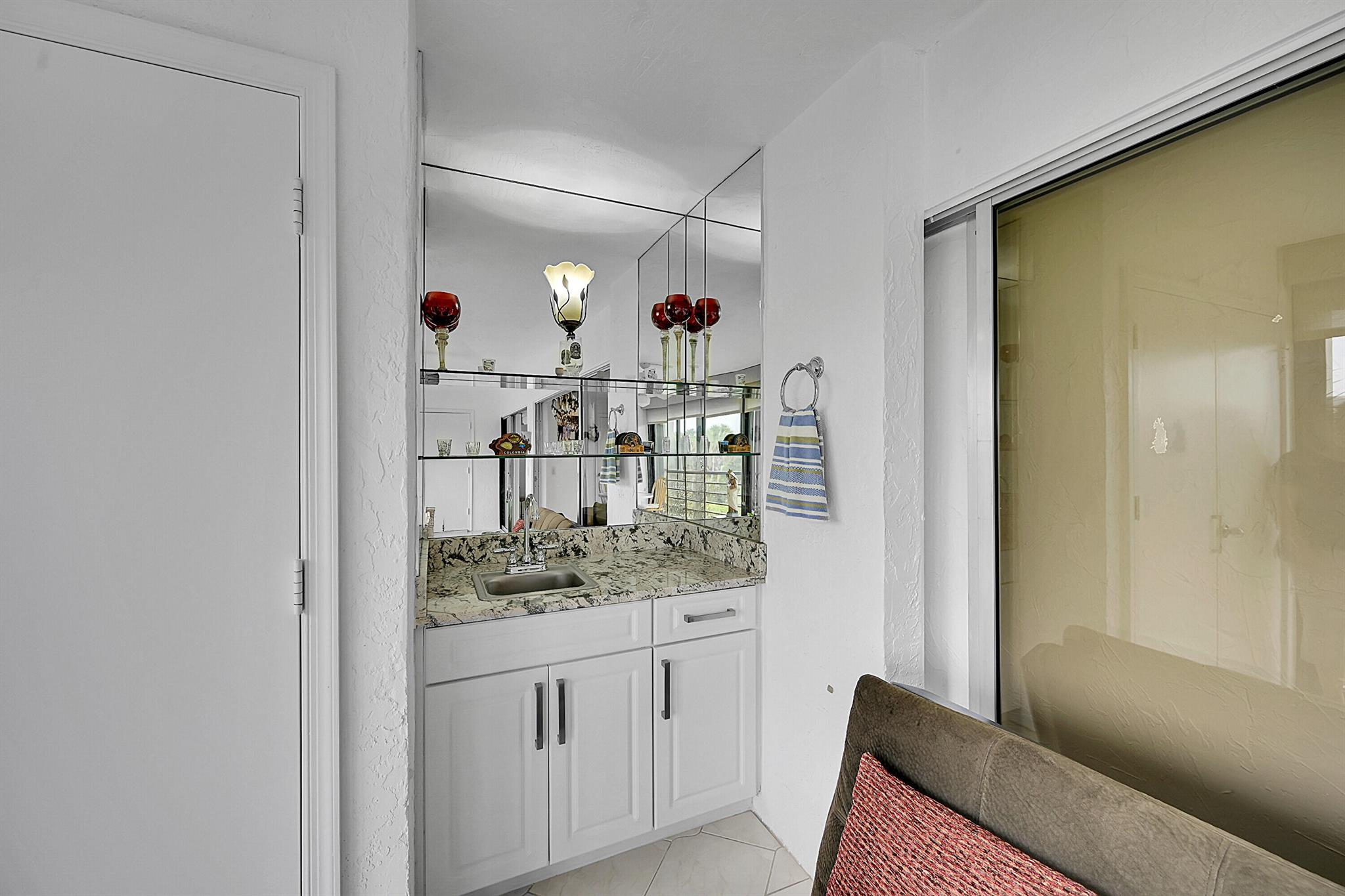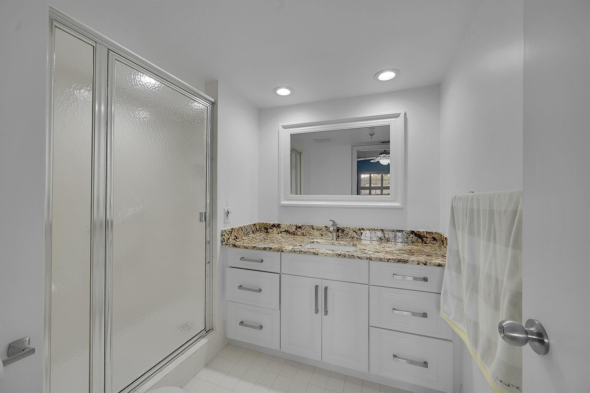 This wonderful updated 55+ condo will not disappoint. The minute you walk in and see the beautiful golf course view you will want to make this your next home. Unit has over 1500 sq ft of living with tile throughout that continues to glassed Patio that also features roll down shutter, added cabinets and sink. Lots of closets and storage in unit plus additional storage on Patio and designated cage by elevator. Updated bathrooms w/ granite, a new over-sized shower and white cabinetry are all beautifully done. The Patios includes 2 heated pools w/Jacuzzi, tennis, clubhouse, gym & BBQs. One covered parking spot is yours plus ample parking for guests. The Patios have completed concrete, painting and passed the inspection! 2026 Budget attached under documents