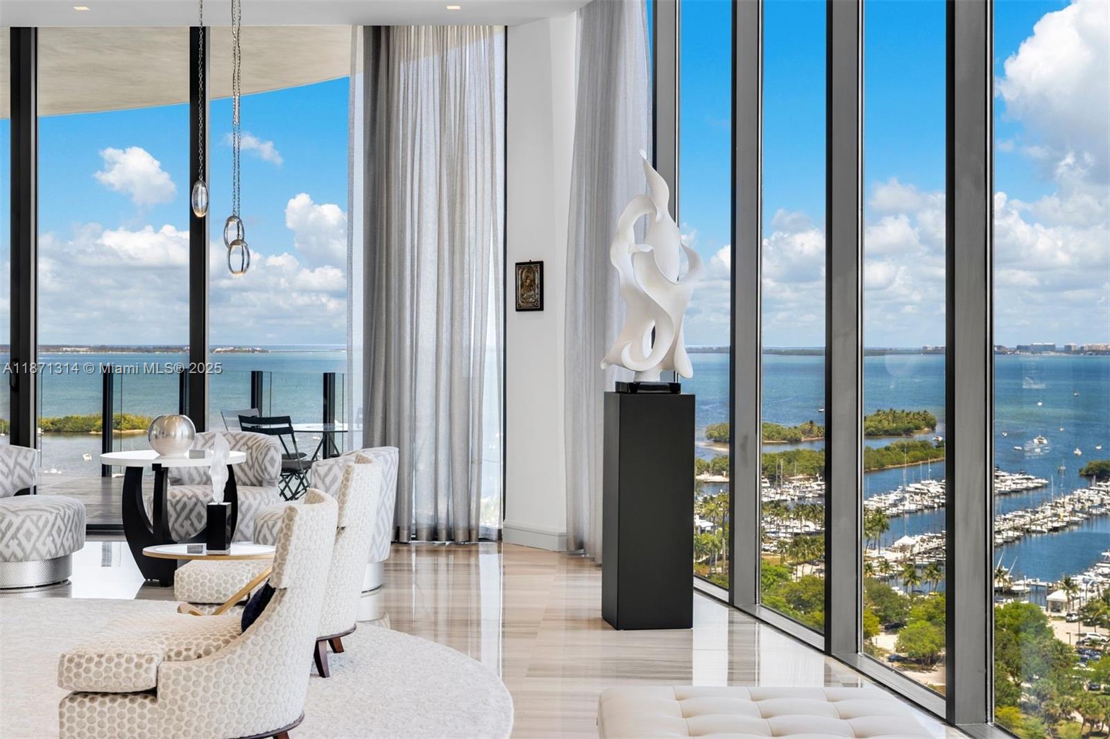 Designed by Pritzker Prize–winning architect Rem Koolhaas/OMA, One Park Grove defines luxury living. This rare 4-BD, 4.5-BA combined residence spans 5,257 SF with 2 private elevators and coveted A & B line positioning. Enjoy unobstructed sunrise-to-sunset views of the ocean and Biscayne Bay from floor-to-ceiling windows and expansive terraces. The renovated home features a principal wing with custom-made en suite closets and spa-like bath, a gourmet eat-in kitchen with Italian cabinetry, premium appliances, and water filtration, plus high-end finishes including Venetian plaster, marble/wood floors, custom office, automated shades, and laundry/utility room. Includes 2 garage spaces and an 8x19 storage room. Resort-style amenities: bayfront pool, spa, fitness center, screening room & more.