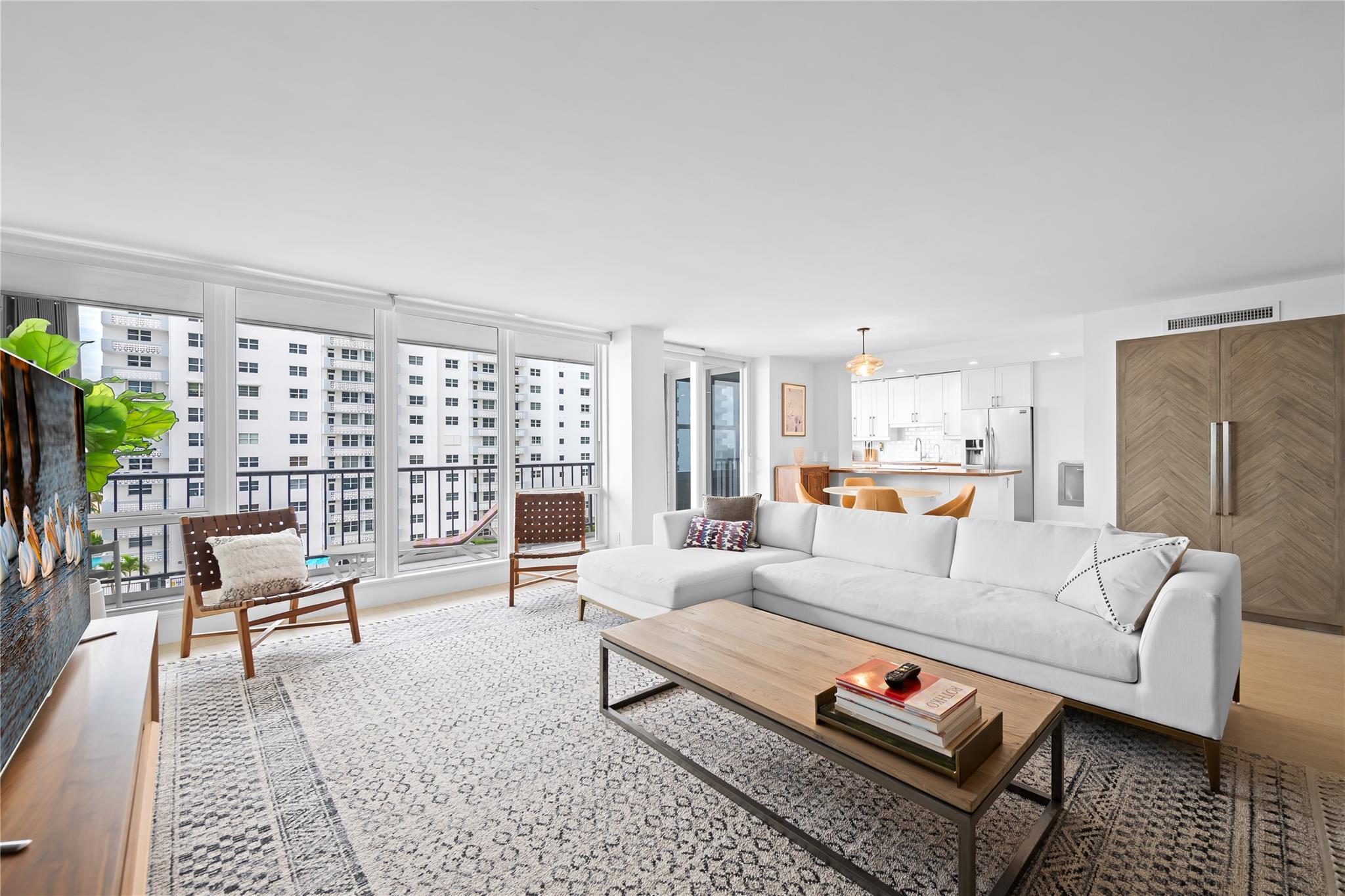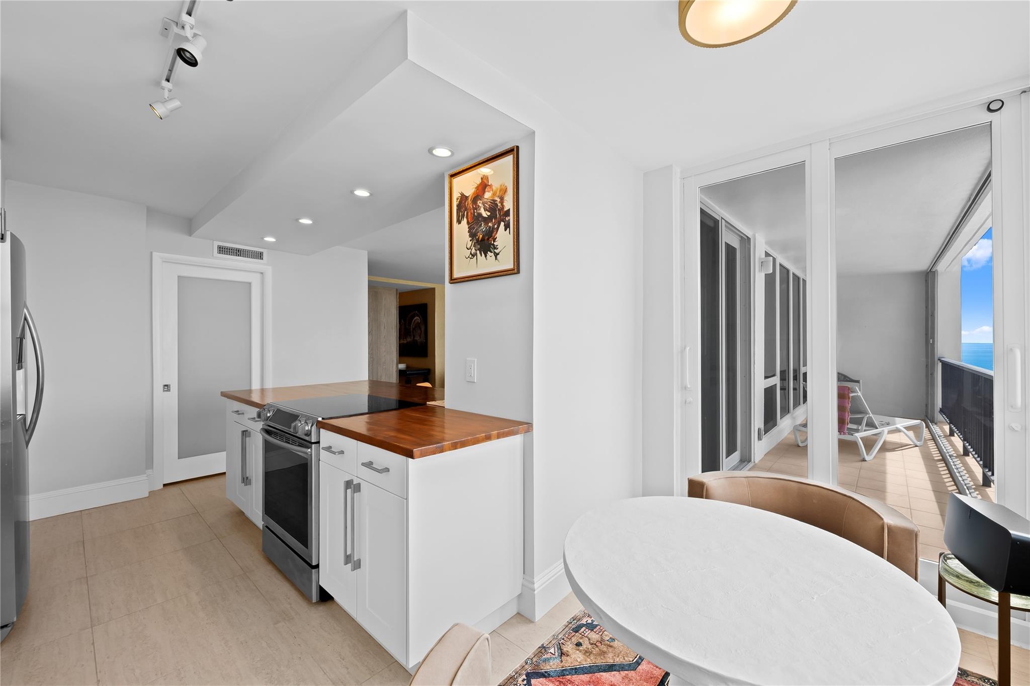 Arrive at your stunning, fully renovated beachfront condominium via semi-private elevator & foyer. Enjoy breathtaking direct ocean views as soon as you enter. Brand new floor to ceiling impact windows and doors with custom electric shades throughout. Open concept with bright white kitchen , stainless steel appliances, butcher block–style countertops, breakfast area, plus a laundry room. Both bathrooms are fully remodeled—the primary with floating vanity, double sinks, oversized shower w/ multiple attachments, and a custom walk-in closet. Imported 24 inch porcelain tiles throughout. Large balcony overlooks the pool and ocean. This flow-through unit feels like a home, with resort-style amenities: Saltwater infinity pool, private beach access, grilling deck, sauna, gym, 24hr security & more.