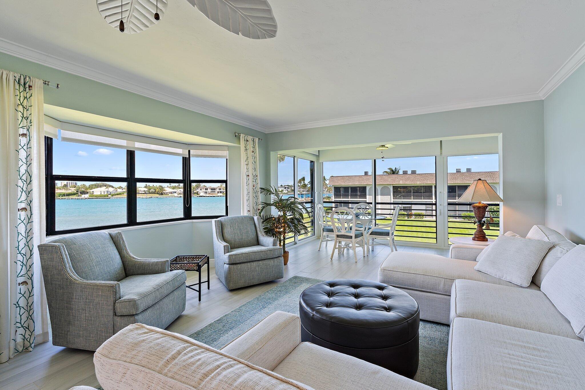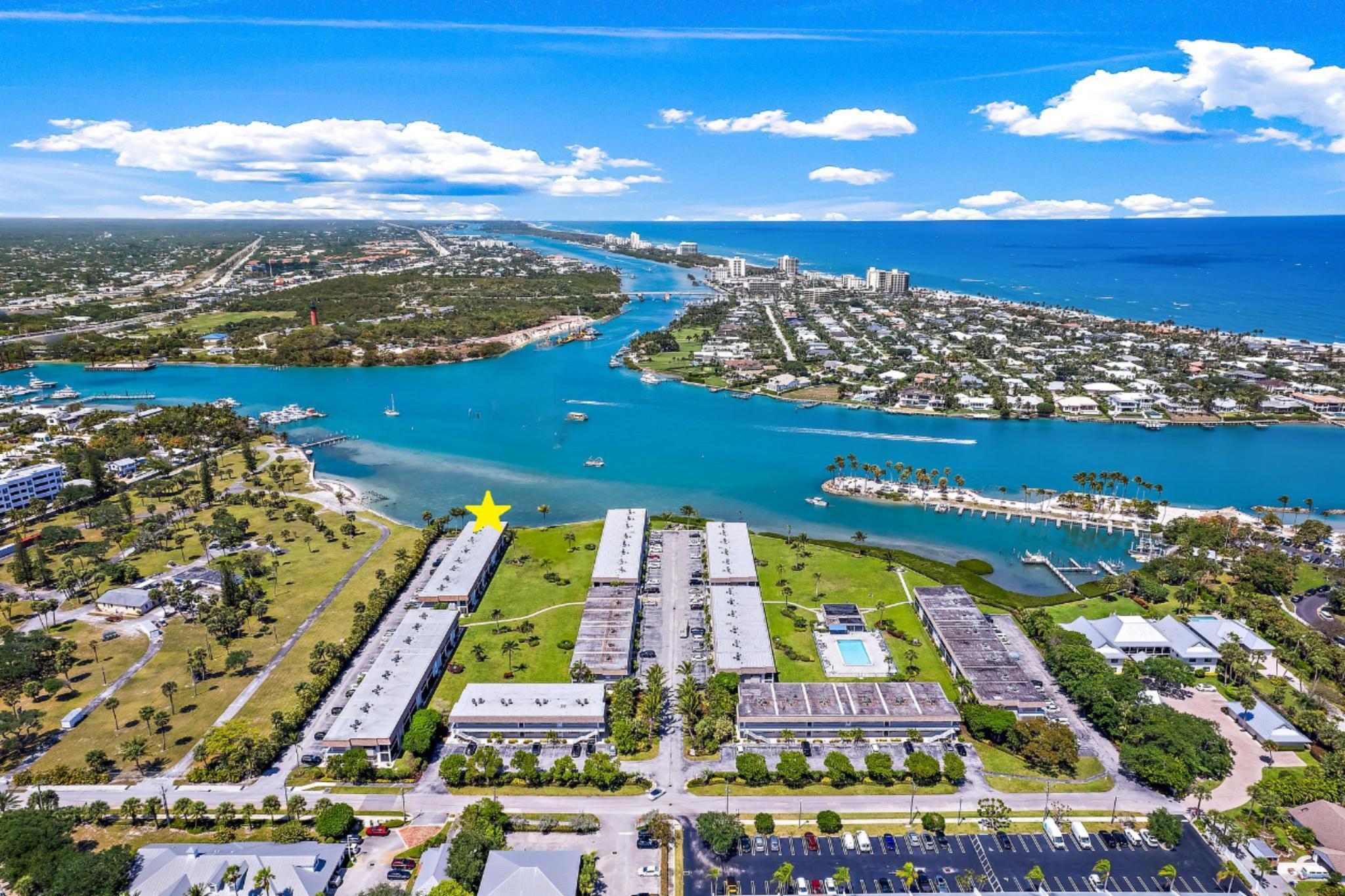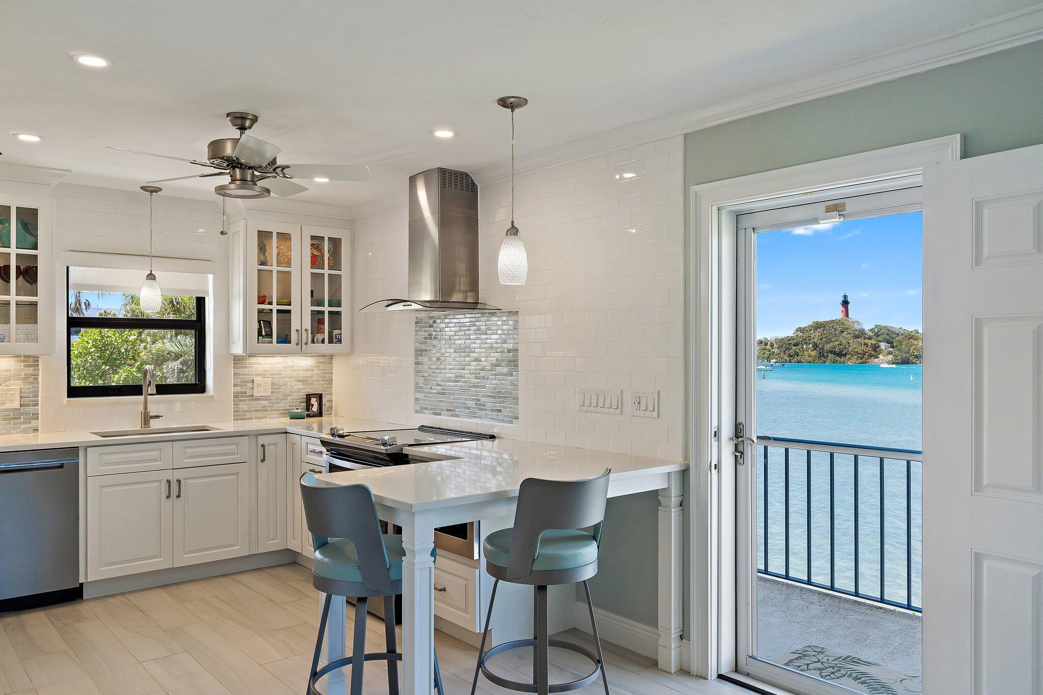 Looking for Million Dollar Views and ''Lock + Go'' convenience that is just around the corner from beautiful beaches, Jupiter's finest Waterfront Restaurants, shops, Boat Slips for lease, golf and more? This condo delivers all 3! Unrivaled Jupiter Lighthouse views + Unforgettable Lifestyle. Truly enjoy this completely renovated end unit with private entry and 180 degree views of the Jupiter Inlet. Entertaining is easy from the gorgeous kitchen that offers plenty of cabinet space, pots and pans drawer, Quartz counters, luxury appliances + breakfast bar. Wonderful open concept with ''Oak'' plank tile flooring, and Impact glass windows + doors that showcase the incredible view. Renovated baths are as pretty as a picture with high-quality tile work, walk-in showers w/ barn door enclosures.