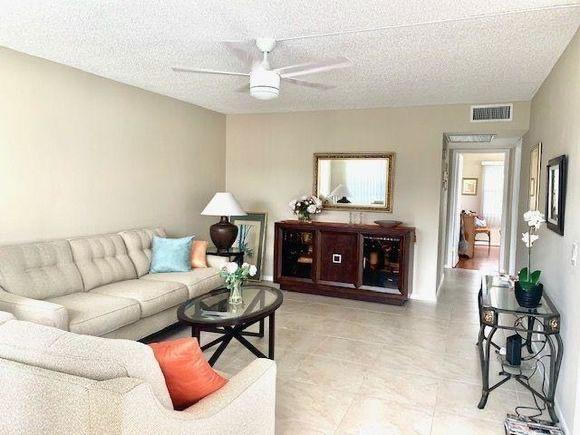 2-bedroom, 2-bathroom second-floor corner unit with tile flooring in the living areas. Light and bright interior with a screened patio overlooking the Suffolk pool. Just a short walk to the clubhouse and house of worship. Century Village offers resort-style living with amenities including a fitness center, live shows, movies, buses, classes, bingo, card rooms, tennis, trips, and more. HOA now includes internet and Wi-Fi. Conveniently located near shopping and dining. Per association, this is a 55+ community.