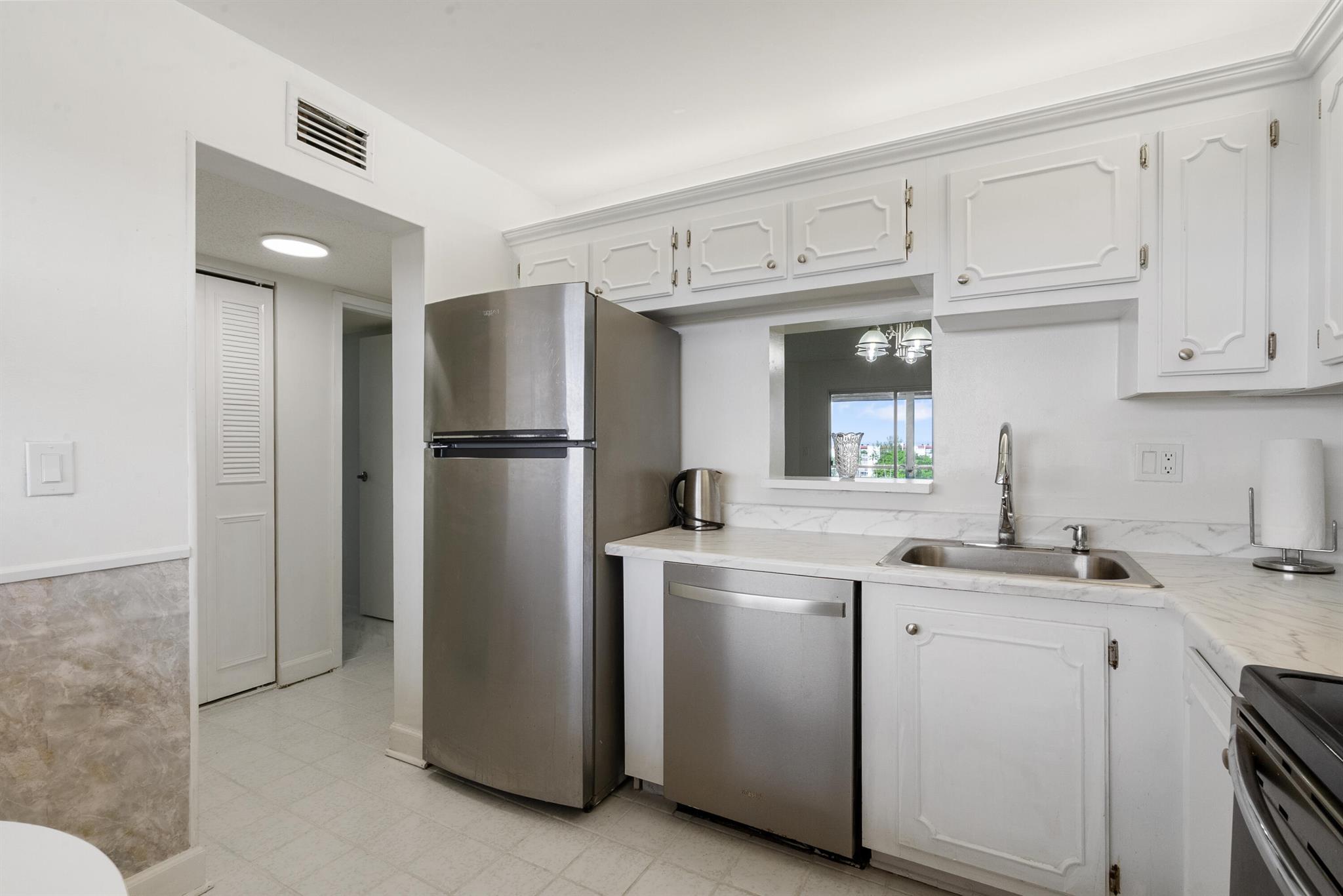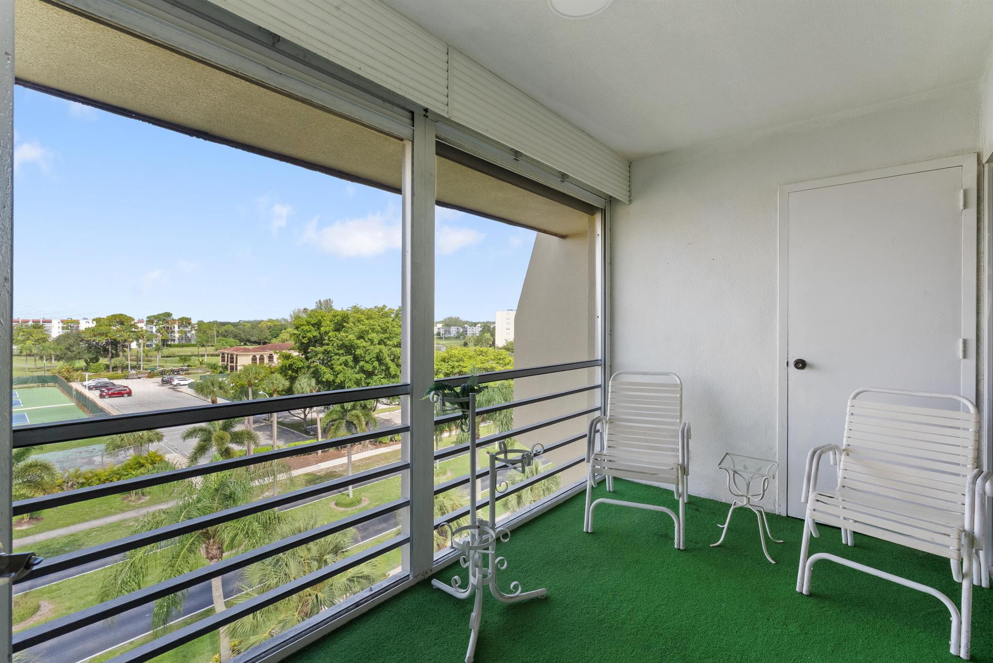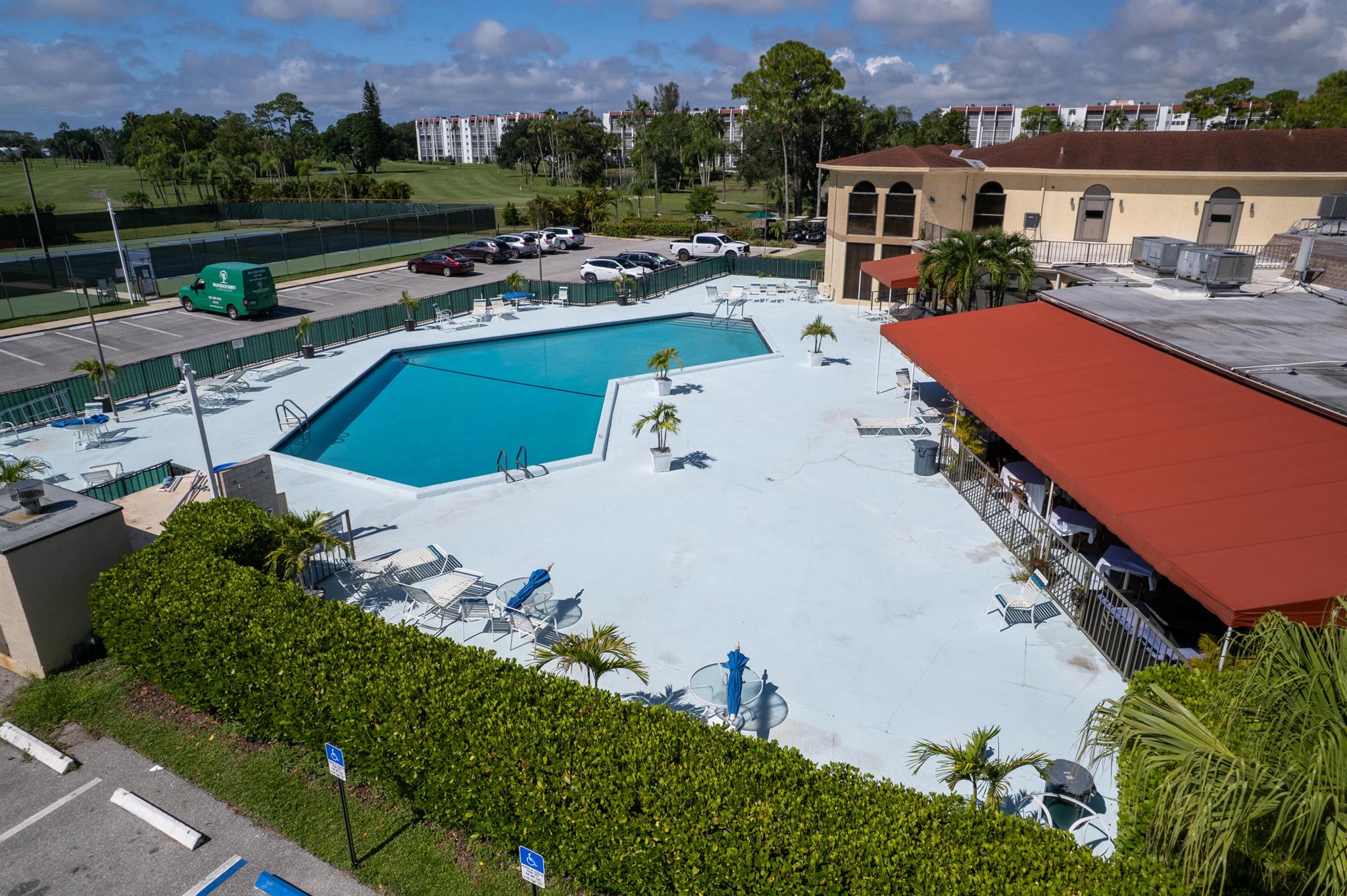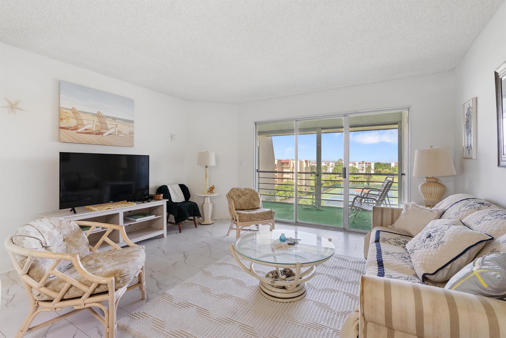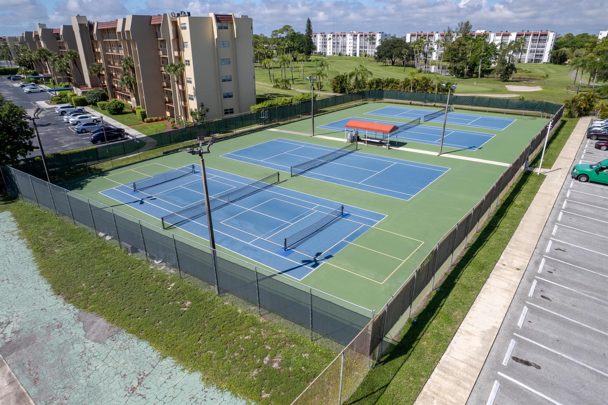 Wake up to gorgeous sunrise skies and wind down with glowing sunset views from this top-floor condo in Poinciana Place, a 55+ active adult community. Overlooking the tennis courts and golf course, this unit offers a serene setting with everyday convenience. The living area features updated tile flooring, and the kitchen boasts timeless white cabinetry. Added perks include a 2018 HVAC with 2025 newly installed condenser coils, in-unit washer/dryer hookup, and the convenience of two elevators in the building. The monthly fee covers water, basic cable, and internet. Residents enjoy abundant amenities including a clubhouse, pool, tennis, and golf. Whether you're seeking a warm winter getaway or a year-round retreat, this inviting home delivers the perfect blend of relaxation and activities