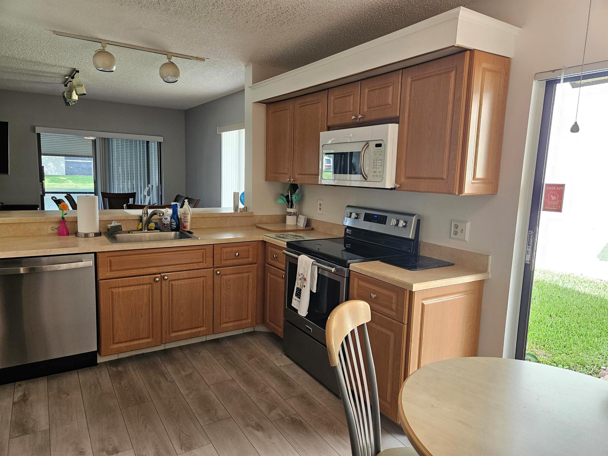 Beautifully updated first-floor condo with lake views in the gated community of Palm Chase! This spacious 2-bedroom, 2-bathroom home with a den offers an oversized screened-in patio overlooking the water. The open layout features a large living room, separate den/office, dining room, and an eat-in kitchen. The primary suite includes both a walk-in and standard closet, plus a private en-suite bath with a walk-in shower. Enjoy peace of mind with newer luxury vinyl flooring throughout, stainless steel appliances, washer and dryer, and A/C. A perfect blend of comfort, style, and functionality! The HOA has strong reserves, no assessments, and is approved for low down payment financing. Best of all, the monthly fee covers almost everything including Hotwire cable/internet, water and trash.