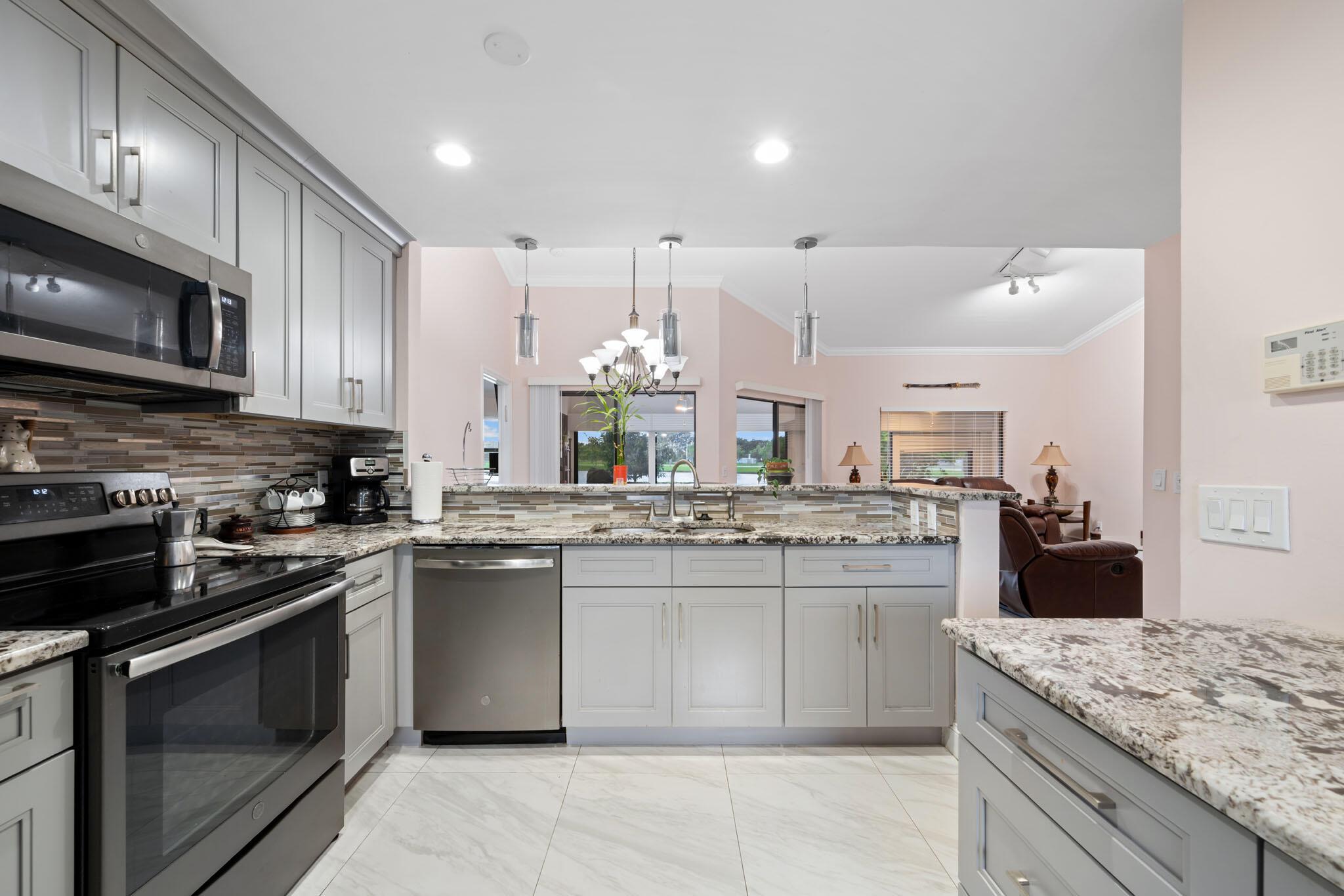 Welcome to resort living without mandatory membership. Lakeview villa in the desirable golf community of Aberdeen. Home highlights and custom renovations - extended driveway, epoxy garage floor, fully renovated kitchen with granite countertops, porcelain tile and laminate flooring, new bathroom vanity's (his & her) custom closet shelving, beautiful master bathroom shower, custom bar, hurricane impact windows and roll down shutters, pantry, stainless steel appliances, no popcorn, crown moulding, new thermostat, new AC, washer & dryer, roof is covered by the association, outdoor grill. $95,000 in upgrades and renovations. One owner/ occupant 55+ minimum 19 yrs old. Go for a swim at the community pool, or tennis match. Come watch the sunset from 3 different areas of your new home.