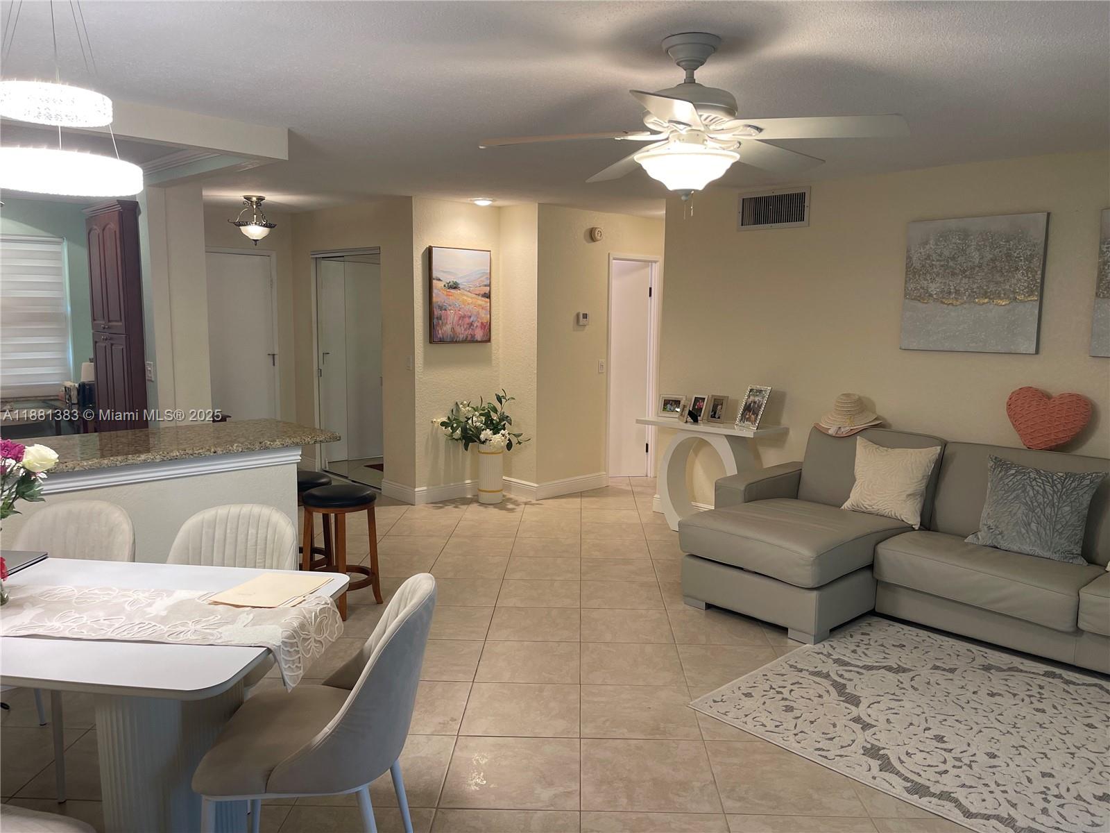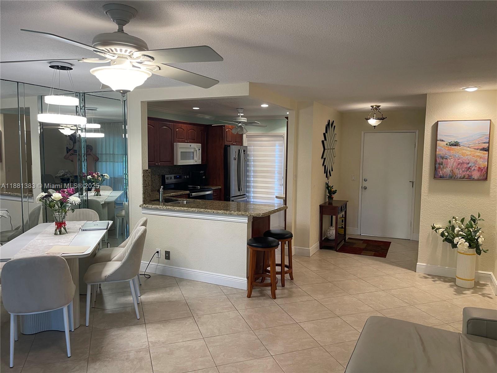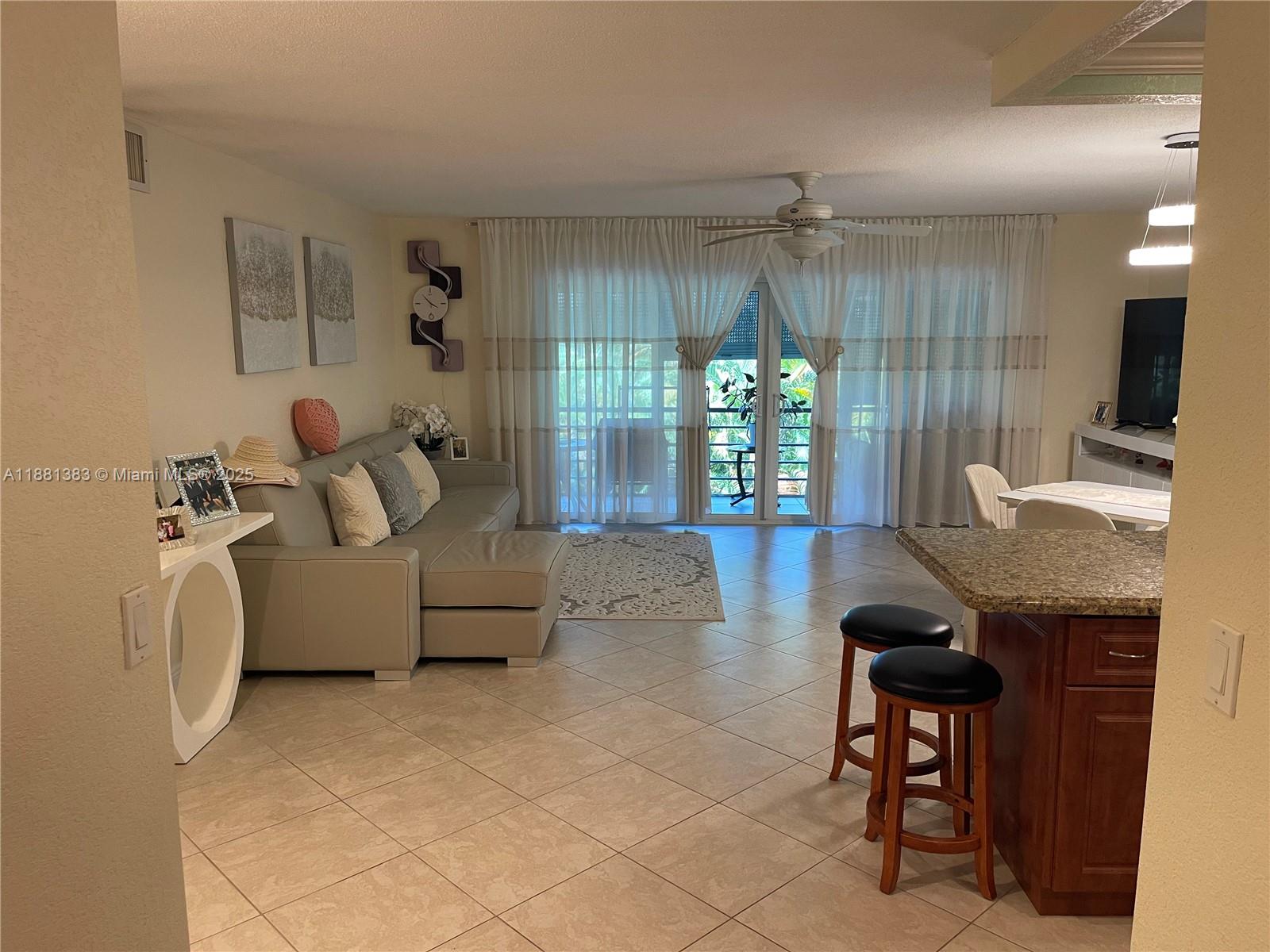 Spacious apartment with renovated open style kitchen in a quiet 55+ co-op community. Enjoy tropical garden views from your screened in private balcony. Impact windows and sliding glass doors for your peace of mind. Huge primary bedroom with walk in closet and ensuite bathroom. Conveniently located near shopping, dining, houses of worship and minutes to the beach! Secured building with assigned covered parking and extra storage space. Low maintenance cost!