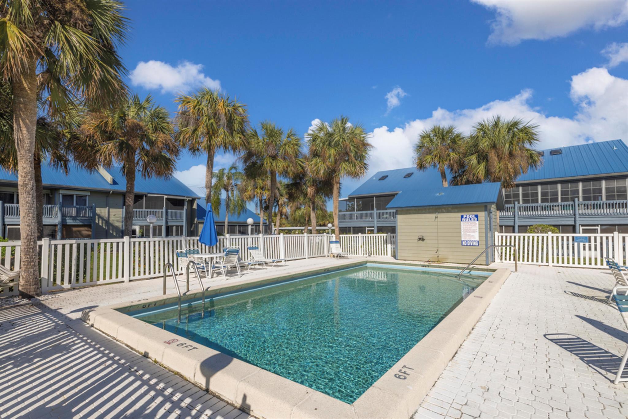 Step into this cozy Florida light & bright 2nd floor, 2-bedroom 1 bath condo boasting 13 ft cathedral ceilings, plus two fabulous porches with back deck over looking Warner Creek and native trees. Located just minutes from beaches, stores & restaurants, Dolphin Village is an all-age/pet friendly community, with 2 pools, 2 club houses, indoor shower, sauna, billiard room, marina, 21' boat slips, boat storage, tennis/pickleball court and metal roofs (2021) offering peace of mind. Don't miss the opportunity to live your best Florida lifestyle. Able to rent immediately! Perfect for year-round, seasonal living, or an investment. Reach out today to schedule a showing.