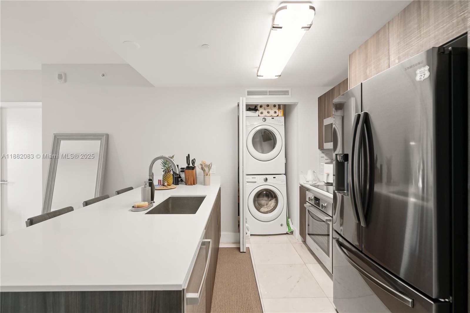 Experience luxury living in this upgraded 1-bedroom plus den fully enclosed as a second bedroom residence featuring a private elevator entrance in a stunning, newly built high-rise. This elegant unit boasts white Uber marble flooring throughout, sleek stainless steel Bosch appliances, custom-designed closets, and motorized window treatments.The spacious primary bathroom offers both a soaking tub and a walk-in shower, along with dual vanities.Step onto the generously sized balcony and take in the breathtaking water views, perfect for relaxing or entertaining.Enjoy world-class amenities including two resort-style pools, a state-of-the-art fitness center, spa, hot tub, BBQ area, theater room, party lounge, and more. Rented until December for $4100/M Great for investors! Easy to show.