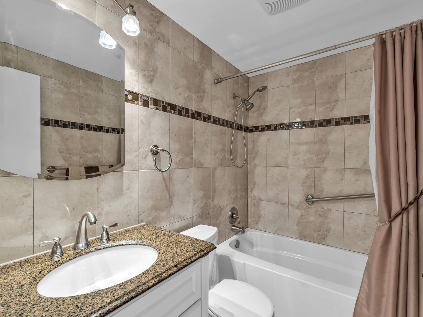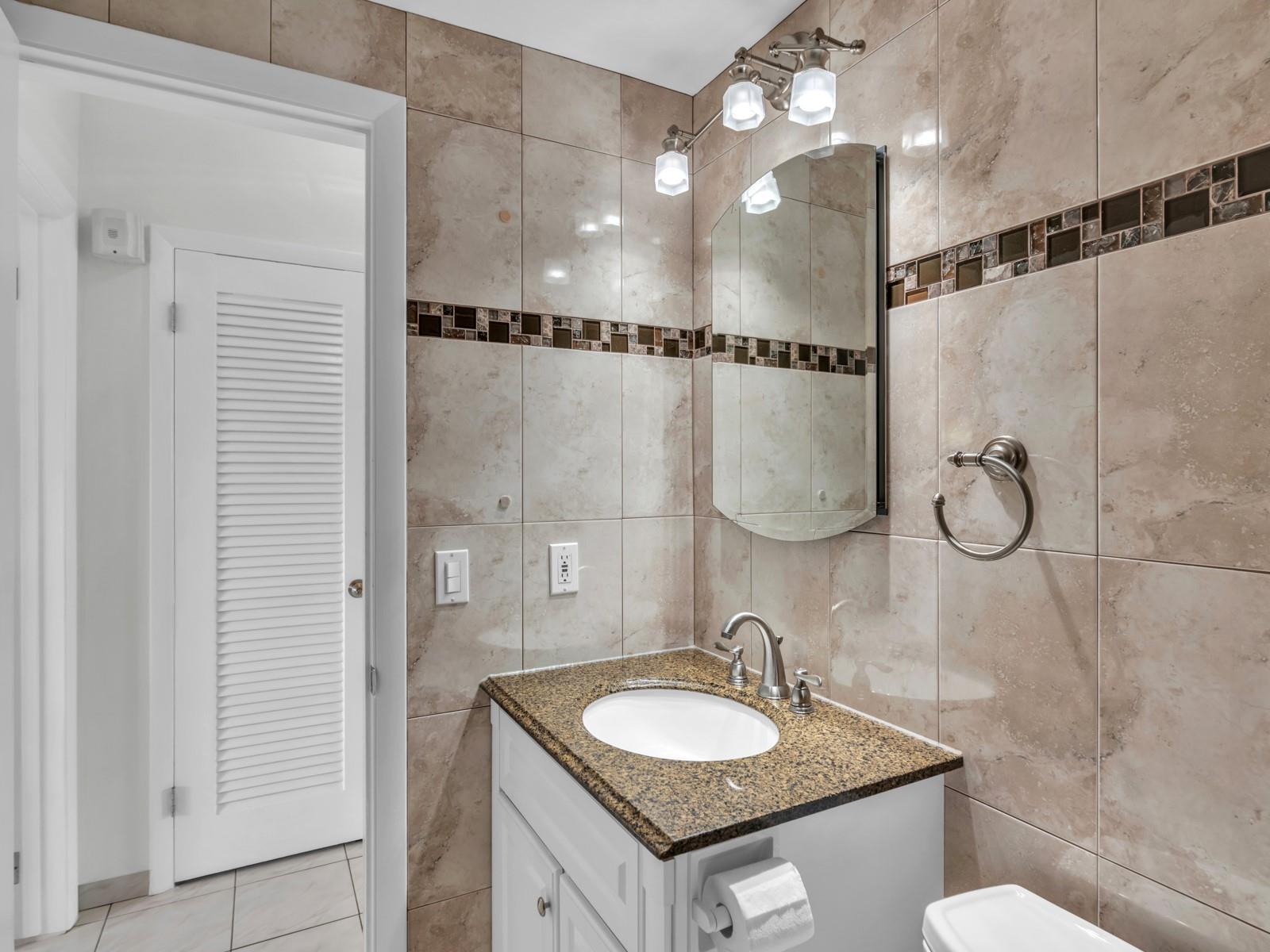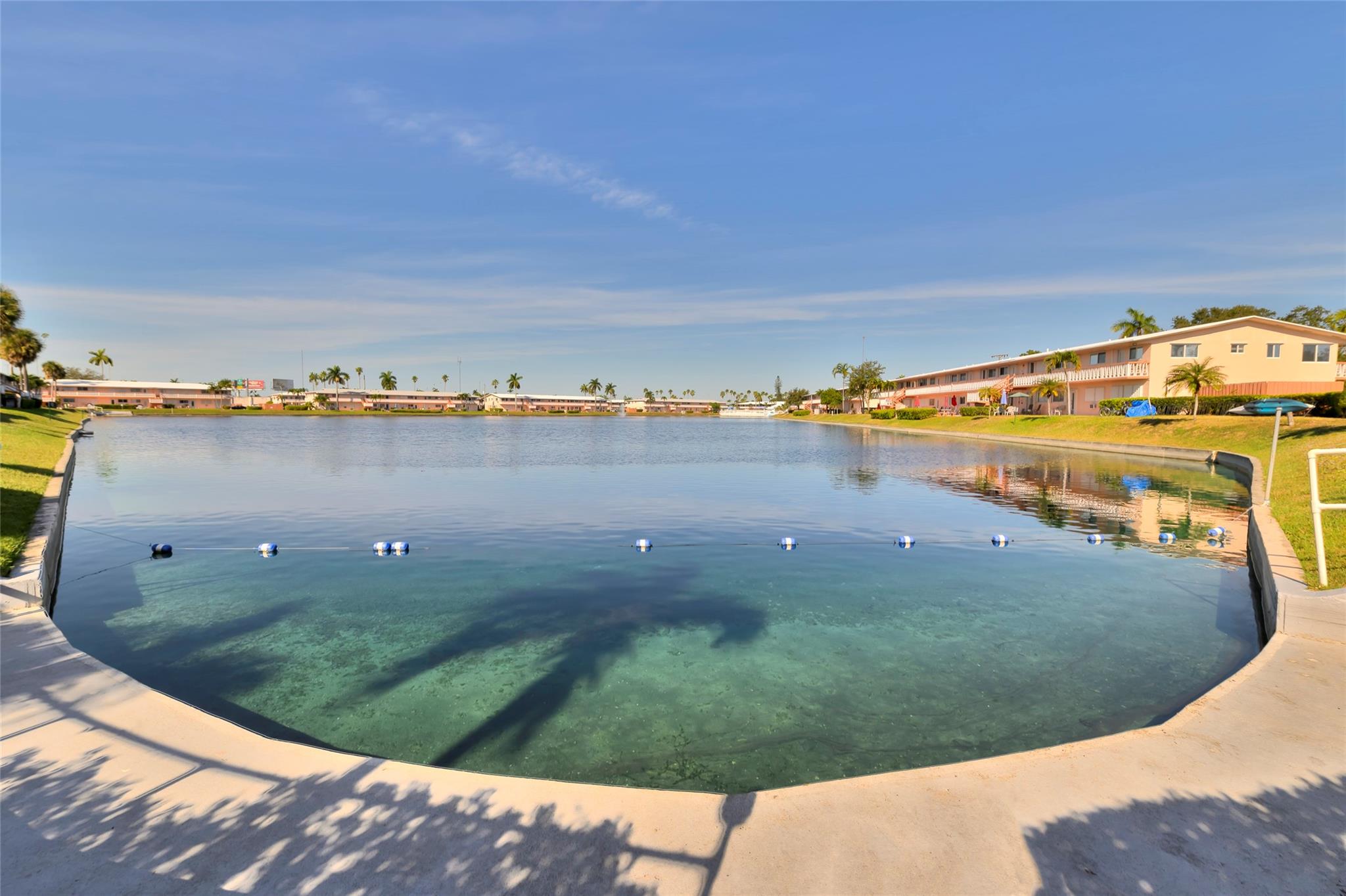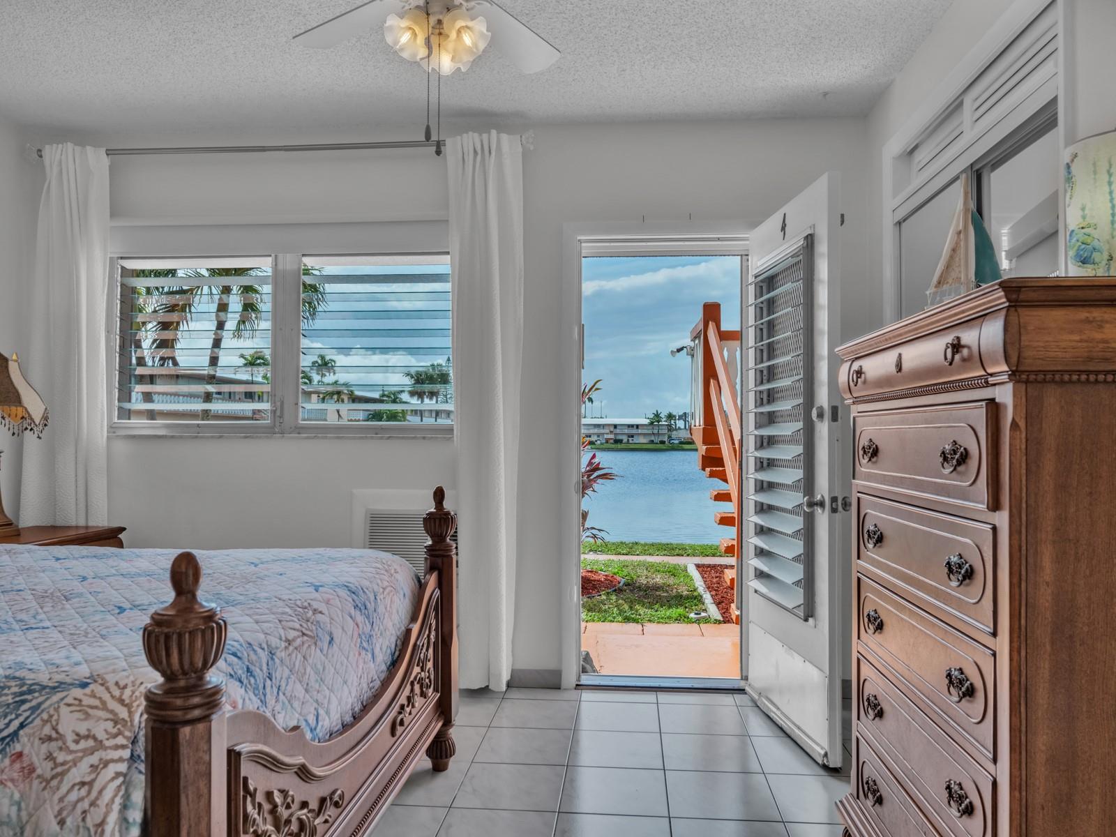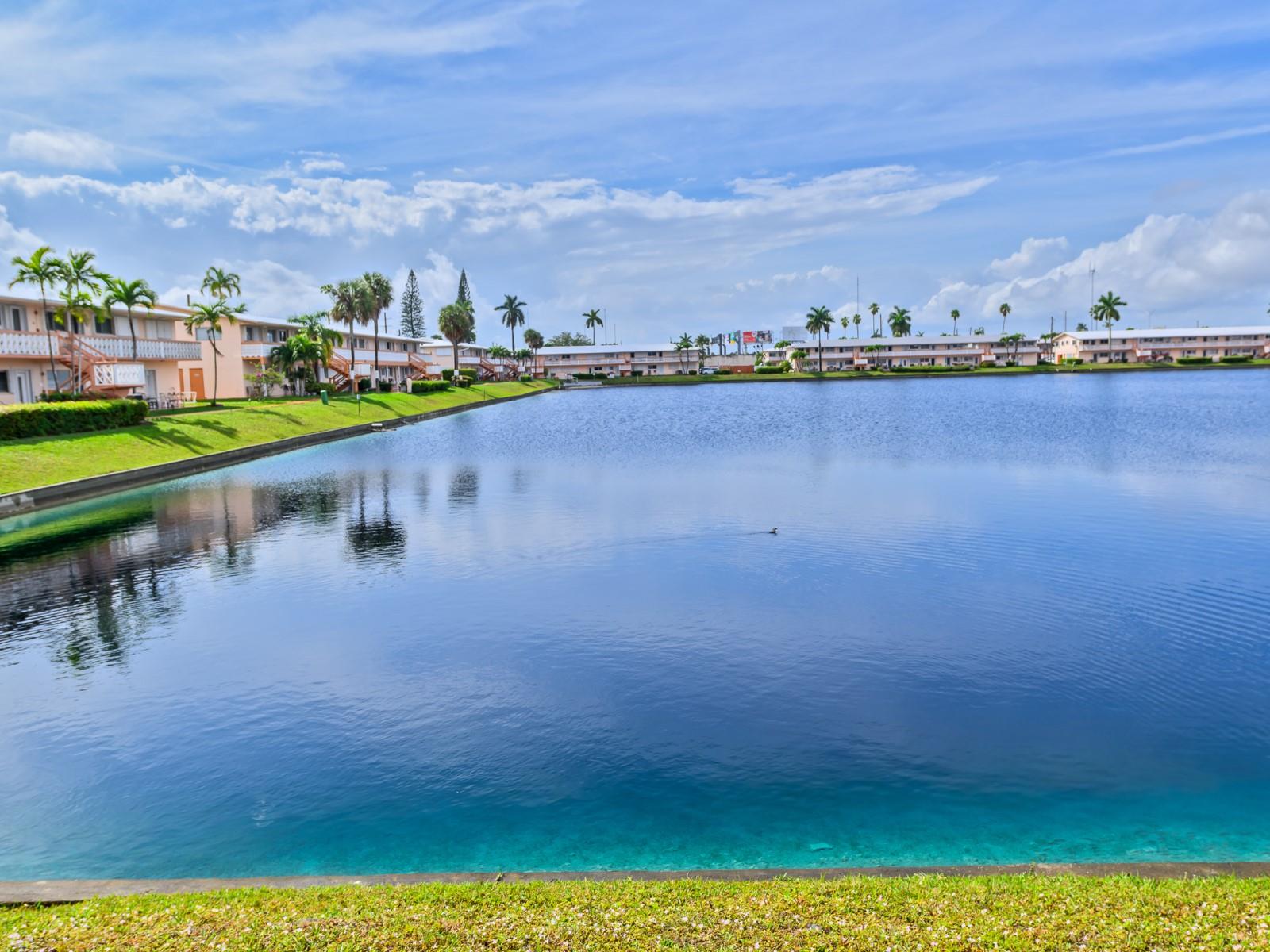 LOOKING FOR A WATERFRONT UNIT? Open the front door of this unit and you will see the " BLUE WATER " from THE LAKE! This fantastic GROUND FLOOR unit is selling FURNISHED TURNKEY! OPEN KITCHEN with new VENEER WOOD POLYESTER cabinets, GRANITE Countertop & newer appliances. New plumbing and lighting fixtures throughout the unit. NEW WATER HEATER (2024). 13" tile ceramic floor. Large pantry inside the unit. Cozy new dining table set (2024). Gorgeous new REMODELED NEW BATH. Two wall a/c (2021). Spacious bedroom well furnished with wall-to-wall mirror closet doors that led to private terrace with BBQ. Shutters on all openings. Great 55 + community with clubhouse, pool, gym, library, billiard, bocce, pétanque, and more. Cash only. Rent right away, seasonal only. Building with large reserve.