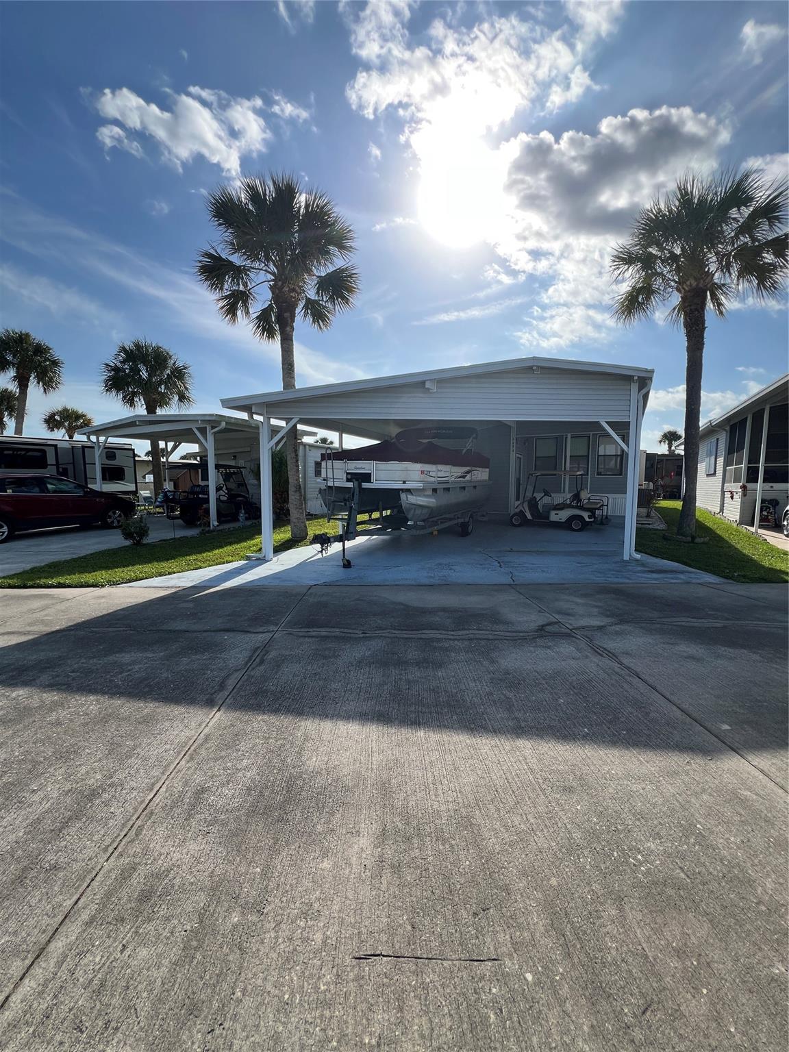 ~Ancient Oaks~ 55+ Community. 2 Bed 1 Bath Park model w/addition. Furnished- on a double street. Huge carport for Truck & Boat or 2 vehicles. Outside shed with washer & dryer, Golf cart included