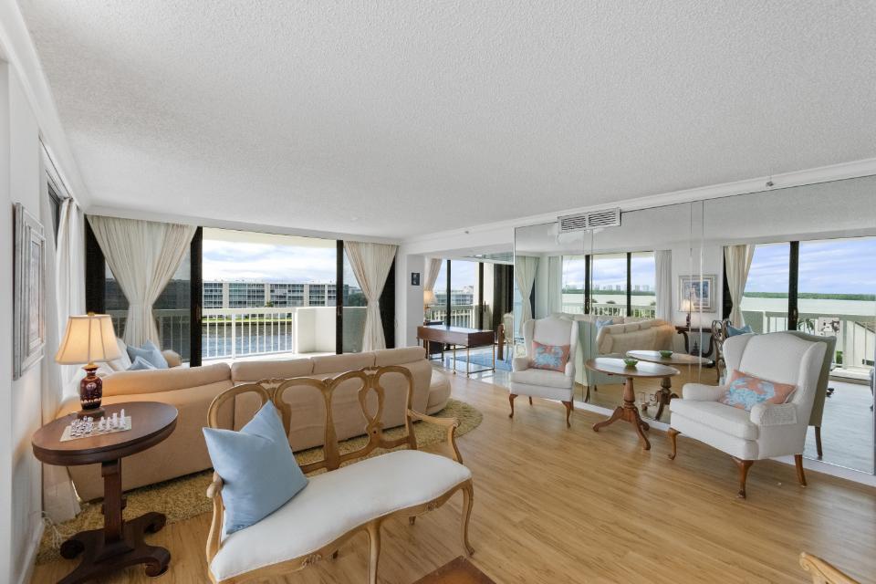 Southeast unobstructed Waterfront Views from every room in this very spacious 3 bedroom and 2.5 bath condo with wrap-around balcony. The location cannot be beat. For the buyer that does not want to be too high up, but high enough to get spectacular views. See the boats going by all day long. Enjoy sunrises and sunsets from your sunny balcony. This building is in good financial shape. Enjoy Belle's waterfront restaurant, 2 mile waterfront walking path and 24 hour manned gatehouse. Great shopping & restaurants nearby. Jack Nicklaus Signature Golf and Tennis across the street. 5 minutes to the beach. Everything is here and 20 minutes to the Palm Beach International Airport. The third bedroom was opened up to the living room, but could be put back easily.