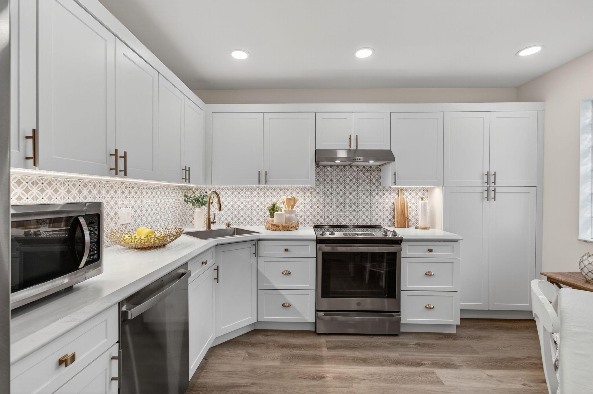 Exquisite three bedroom, two bath condo in Platina's Illustre Village offers a picturesque lake view from every window. This immaculate condo is is right out of an episode of HGTV! Beautifully decorated with extensive contemporary wood trim, high hat lighting and updated kitchen. The spacious master bedroom features a walk-in closet, plus updated master bathroom. The split floor plan provides privacy, while luxury vinyl flooring makes clean up a snap. Full-size washer and dryer (2023), a water heater (2022), and a recently updated air conditioning system (2024). The screen-enclosed balcony is ideal for enjoying morning coffee or relaxing while gazing at the serene lake. Perfect for all year or seasonal living.