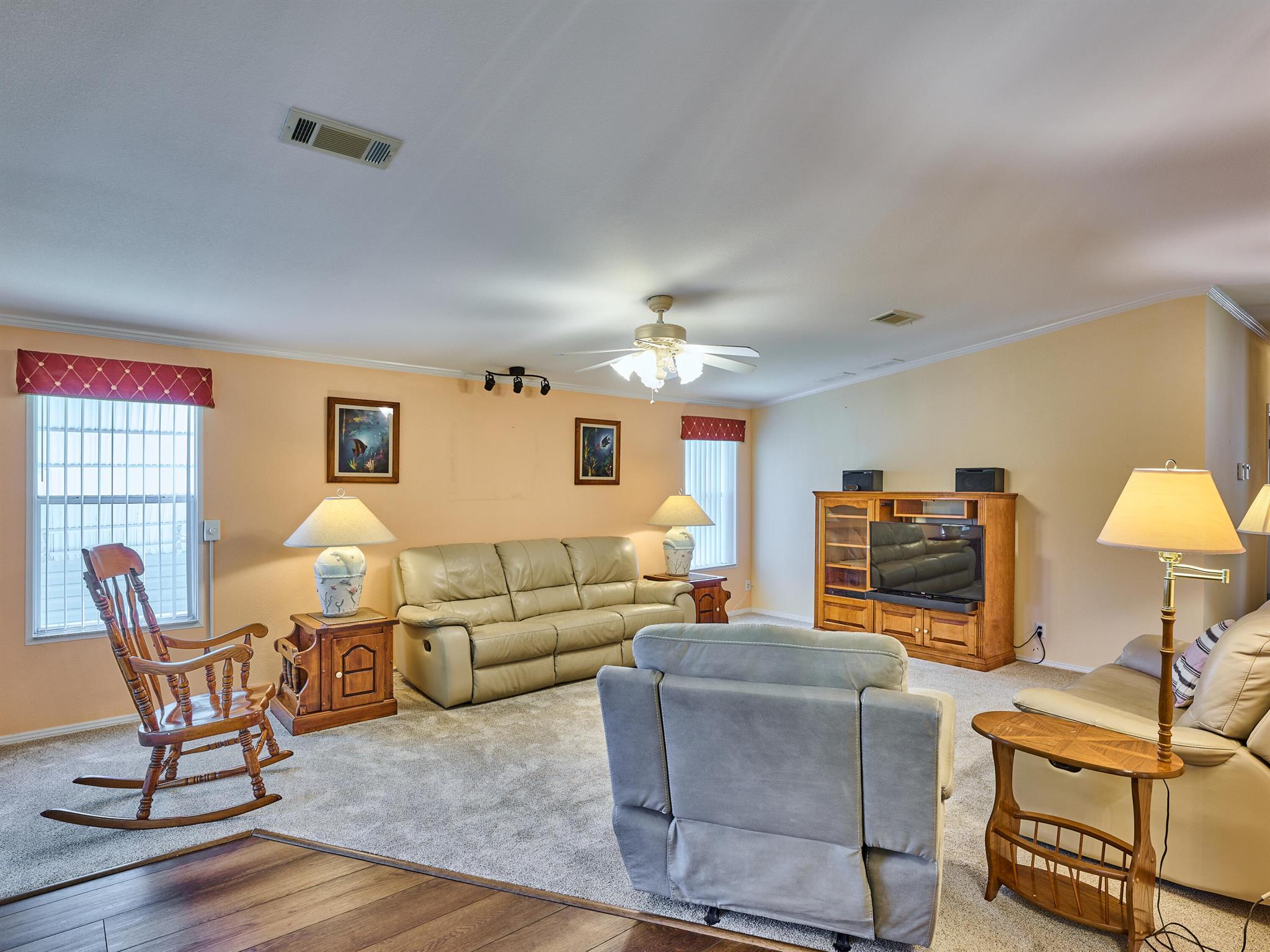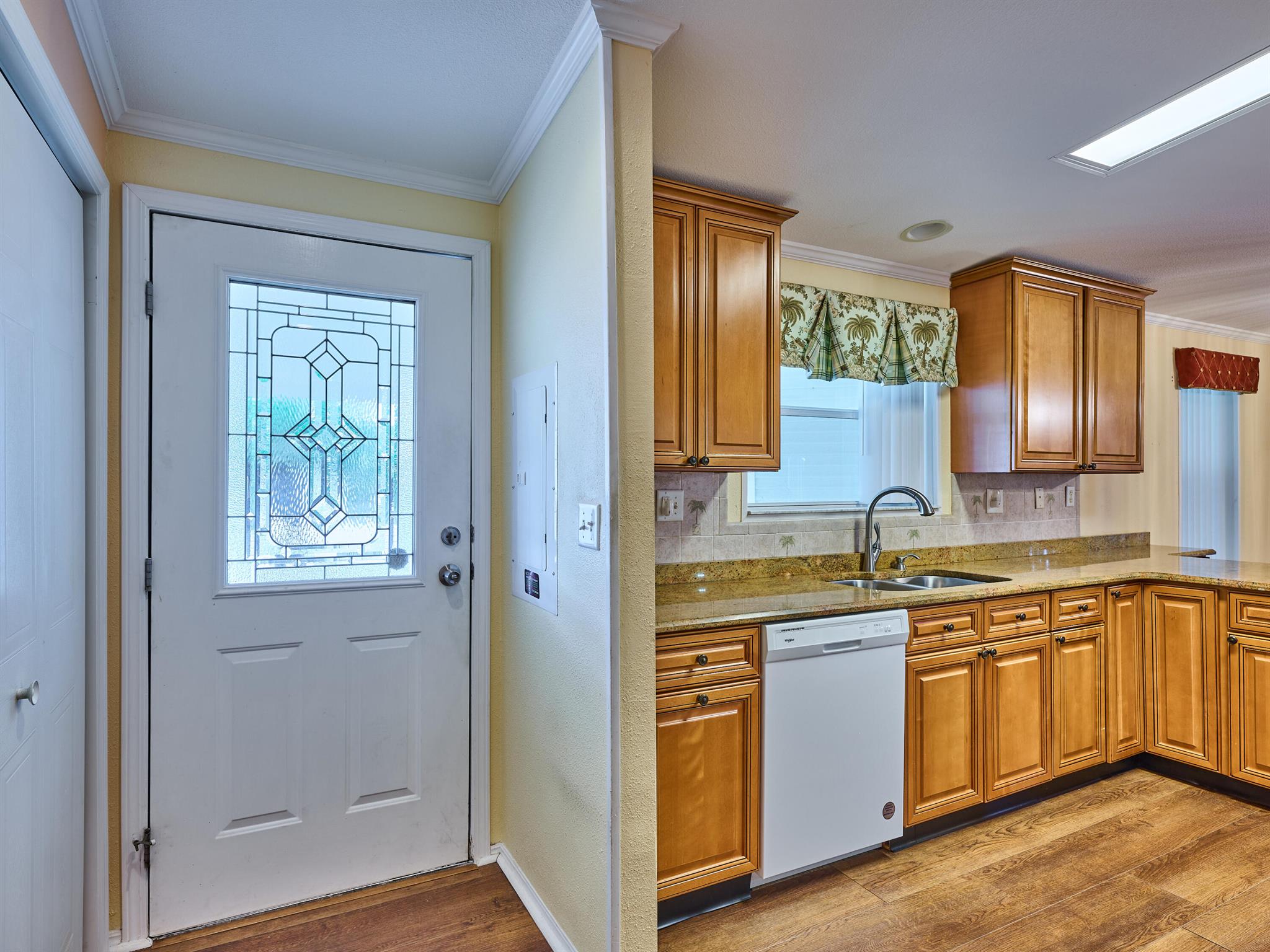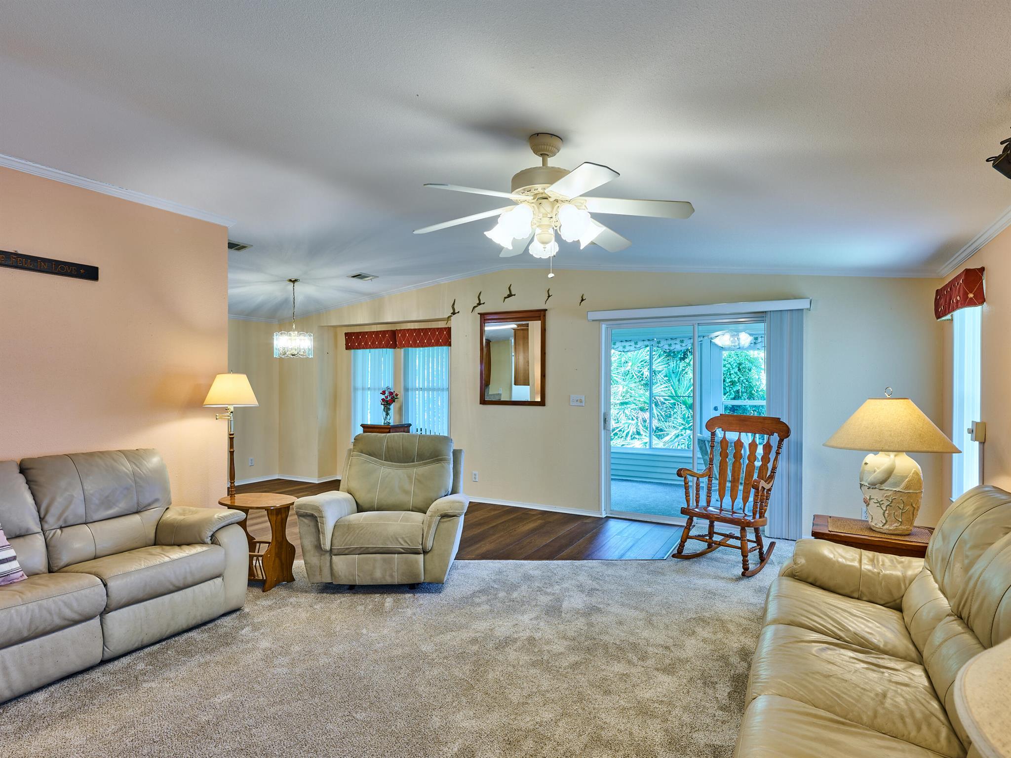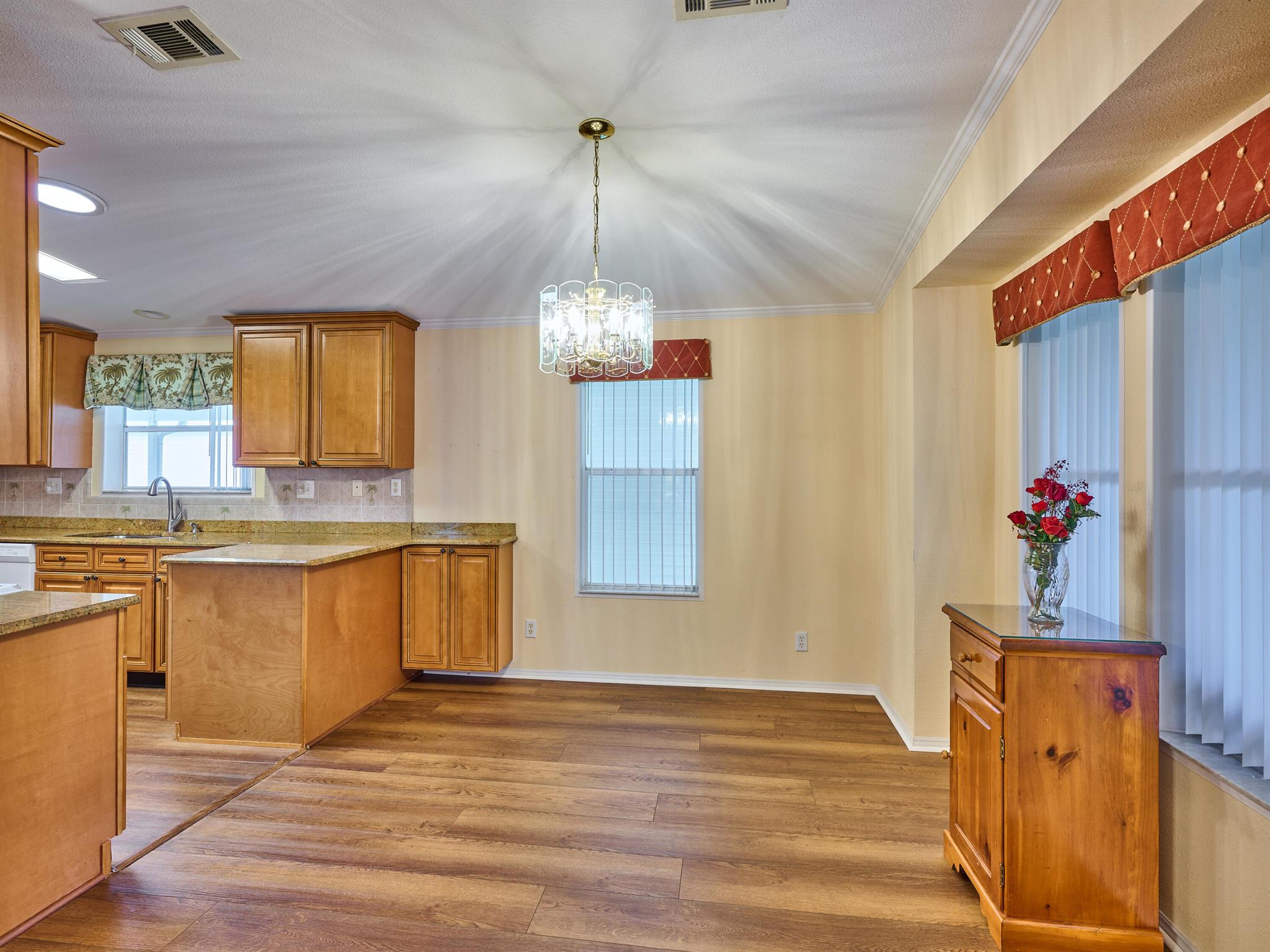 Welcome to this beautifully maintained 3 bedroom 2 bath Palm Harbor manufactured home in the sought-after 55+ community of Pinelake Gardens & Estates. This spacious residence blends modern updates with comfort and convenience.Featuring a new 2024 metal roof and a 2023 A/C system, the major updates are already done for you. Inside, the kitchen has been tastefully renovated with rich wood cabinetry, sleek granite countertops, and newer white appliances--perfect for cooking and entertaining. The adjoining dining area boasts new flooring, while the living room has fresh carpet, creating a warm and inviting atmosphere. Pinelake Gardens & Estates is a vibrant, active community offering resort-style amenities, including two clubhouses, pools, tennis, shuffleboard, and a social