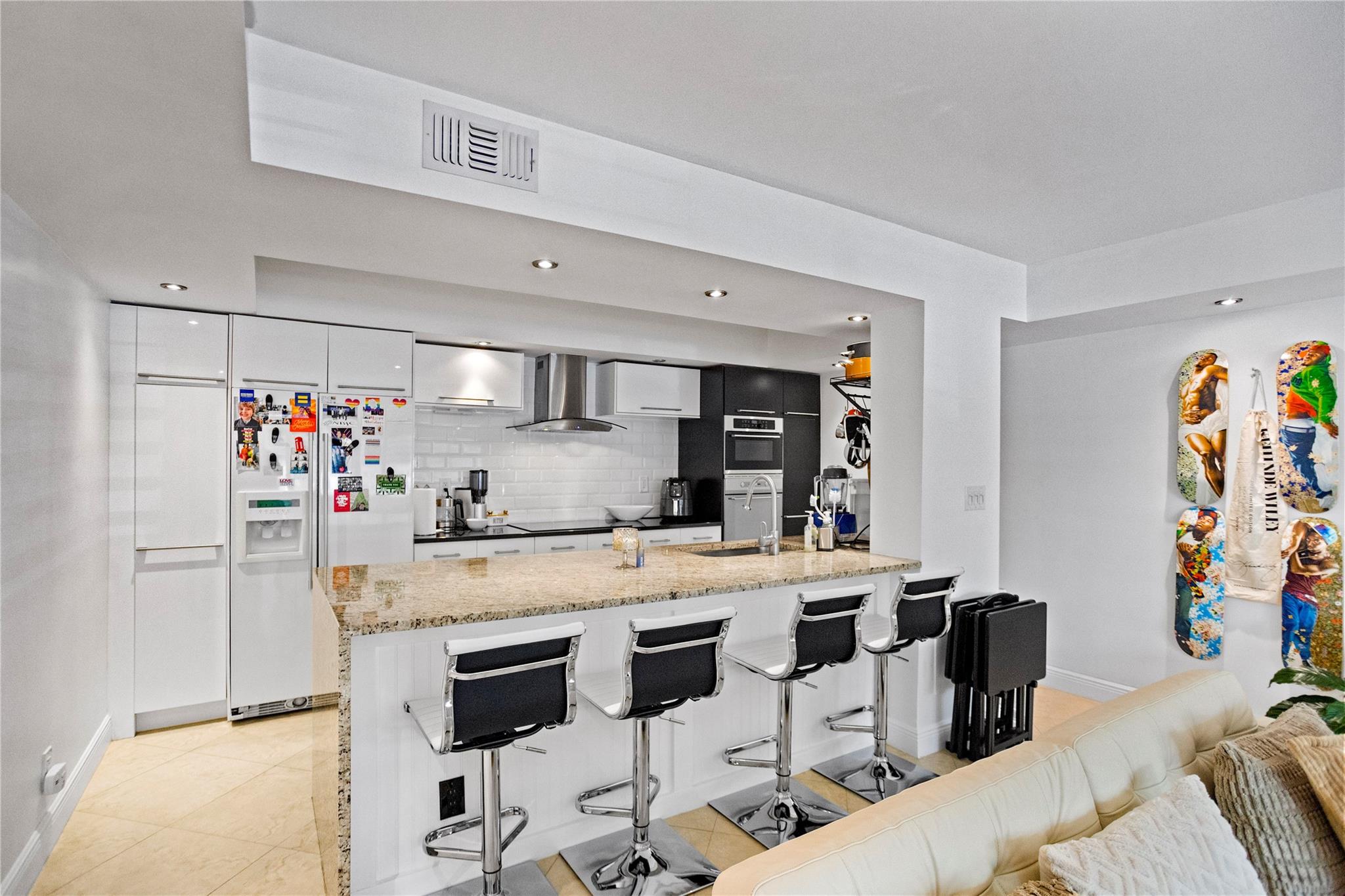 Beautifully remodeled 2 beds/2 baths condo for SALE, located in desirable Lauderdale Tower on the Intracoastal. Unit features updated tile, impact windows, plantation shutters, renovated bathrooms & kitchen. Kitchen includes wall oven, built-in microwave, glass cooktop & wine cooler. The oversized island opens to the living room & features bar seating for four. The expansive living area is over 270 sq. feet and features dimmable soffit lighting. Adjacent to the living area is a large 11x14 ft guest room & renovated bathroom across the hall. The oversize main suite measures in at 11x17 ft. and has dual sliding glass doors that lead to the master bathroom and walk-in dressing area. Building 40yr Cert Completed. It features waterfront pool, exercise room, community dock and BBQ.