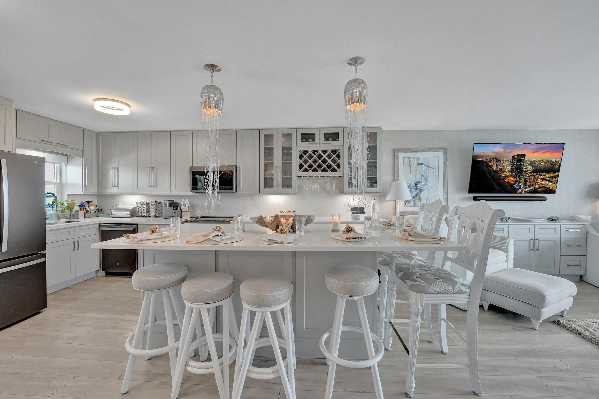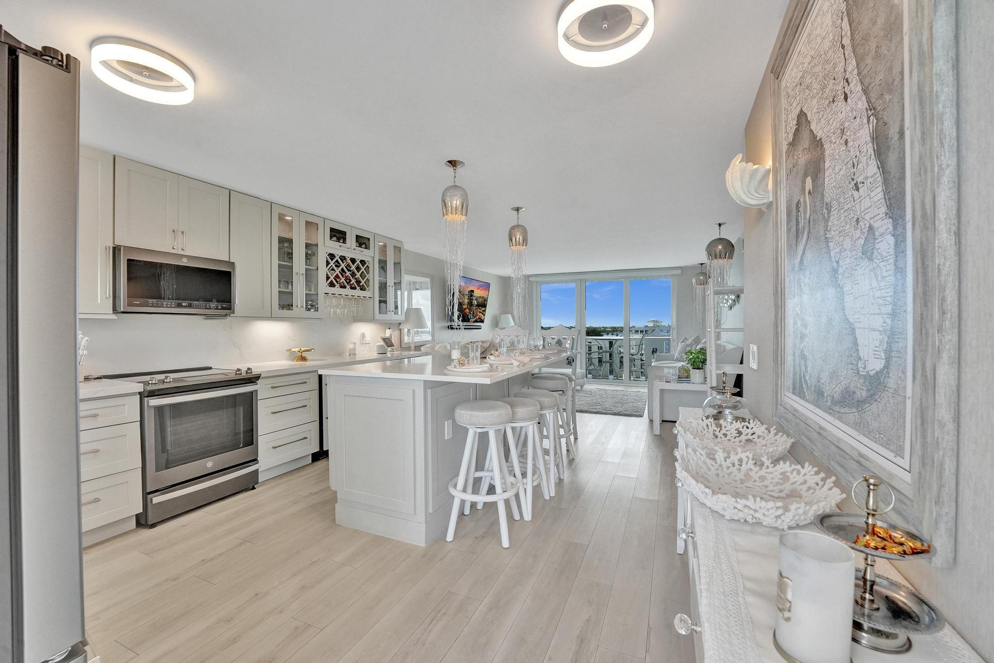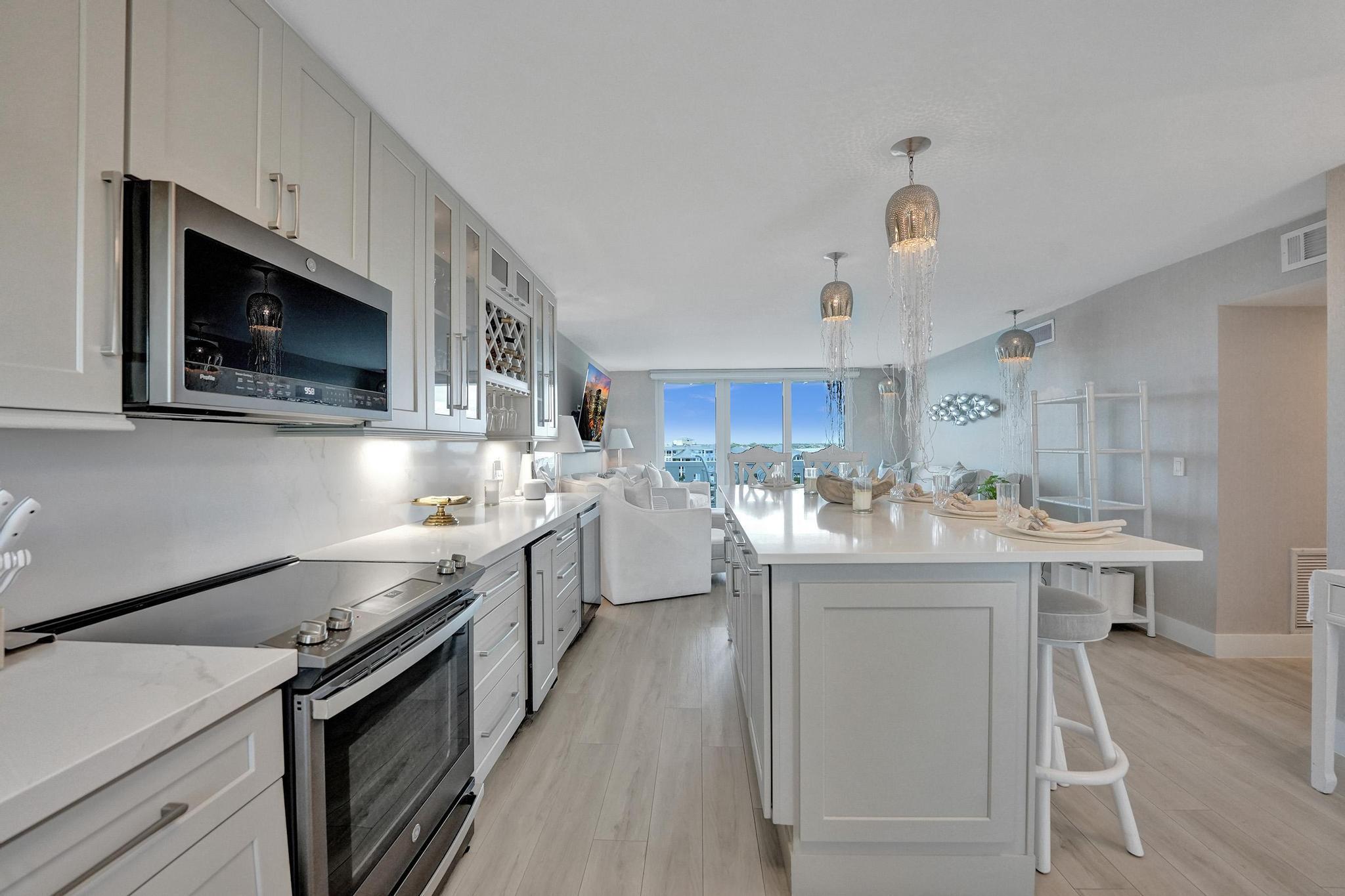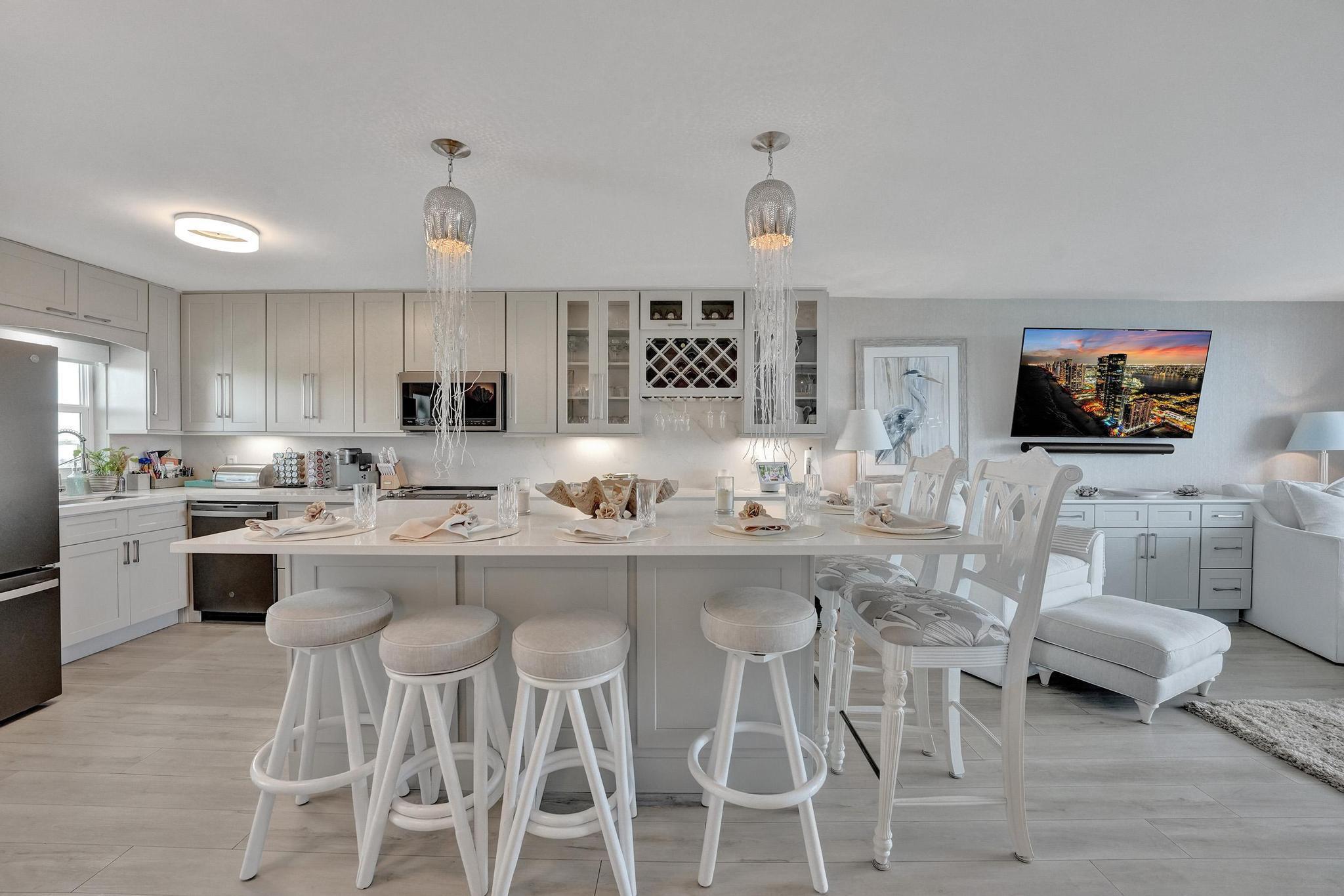 Live the Florida Dream in Style This stunningly renovated 2-bedroom, 2-bathroom condo offers breathtaking panoramic views of the Intracoastal Waterway and the Atlantic Ocean, blending the best of coastal living with modern elegance. Designed by the renowned Palm Beach designer, Jeanne Michelle, every detail of this residence has been meticulously crafted for both style and comfort. Step into a coastal modern oasis, fully furnished and turnkey, ready for immediate enjoyment. The spacious kitchen, perfect for entertaining, features a large island and striking jellyfish pendant lights, while grasscloth wallpaper and charming shell sconces create a welcoming atmosphere. With impact windows throughout and remote-controlled blinds, you'll enjoy both beautiful views and comfort.