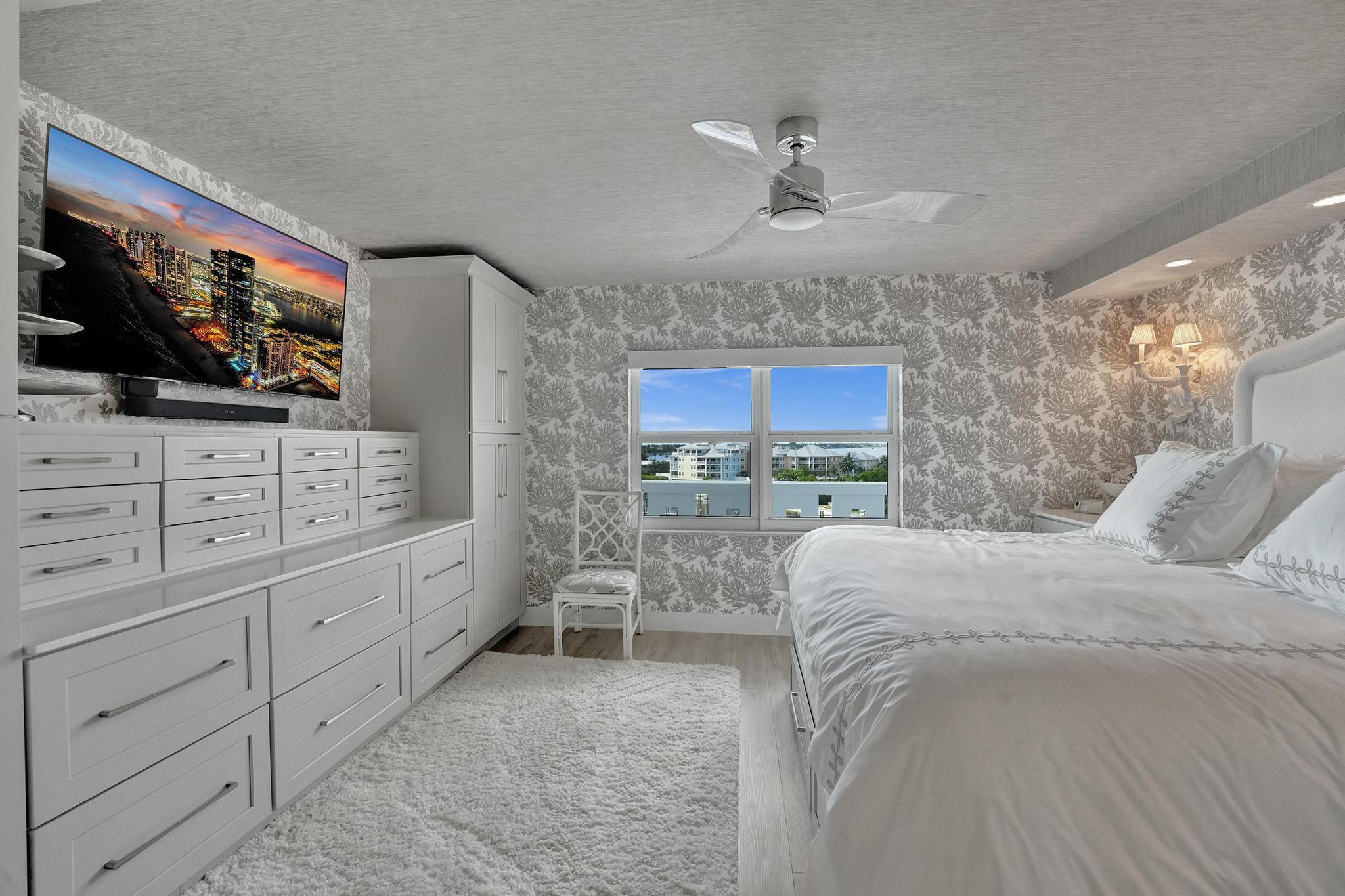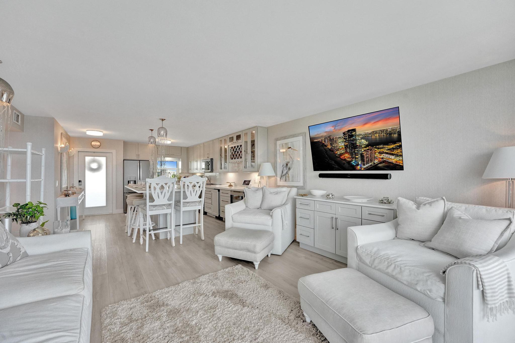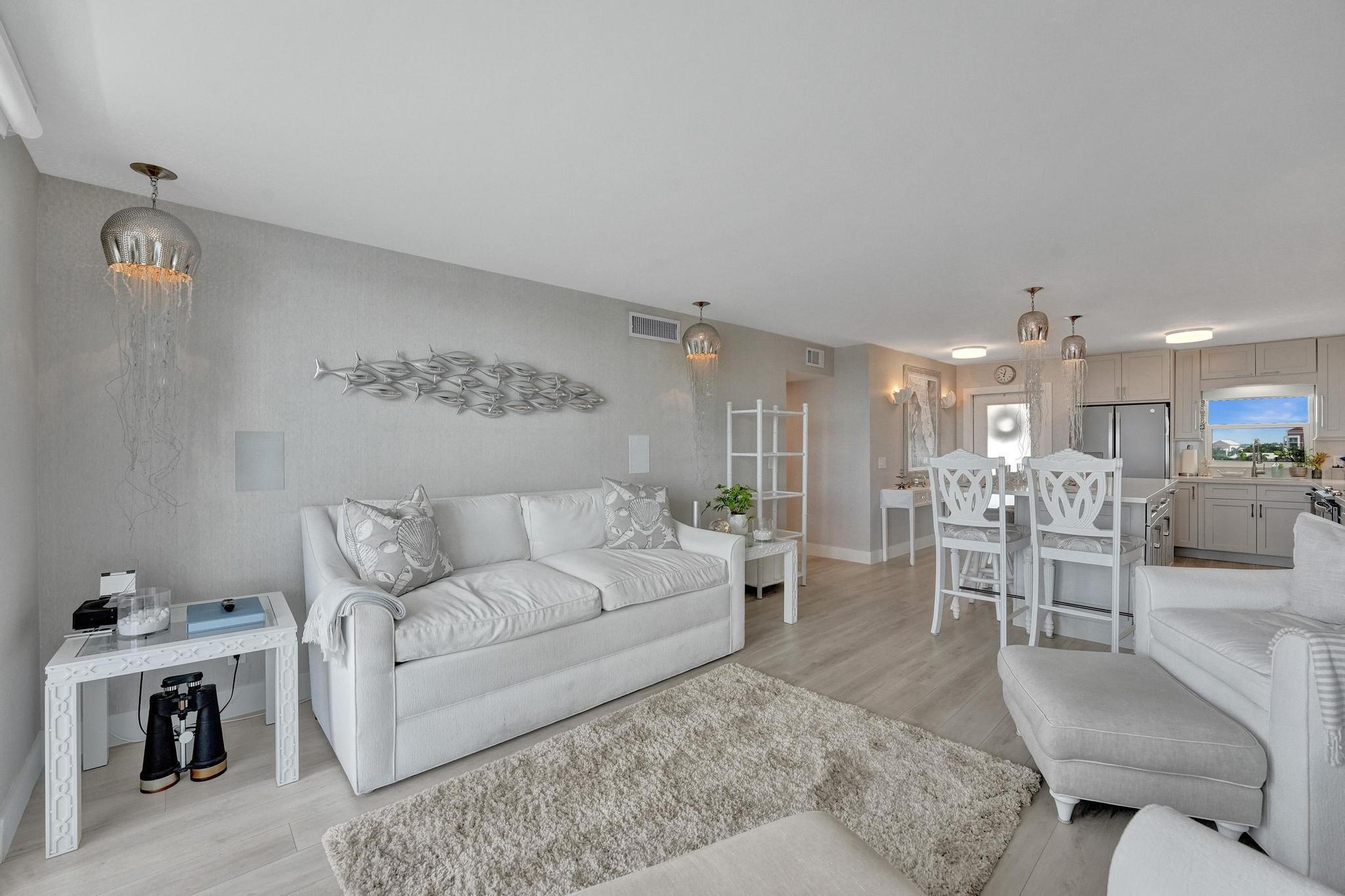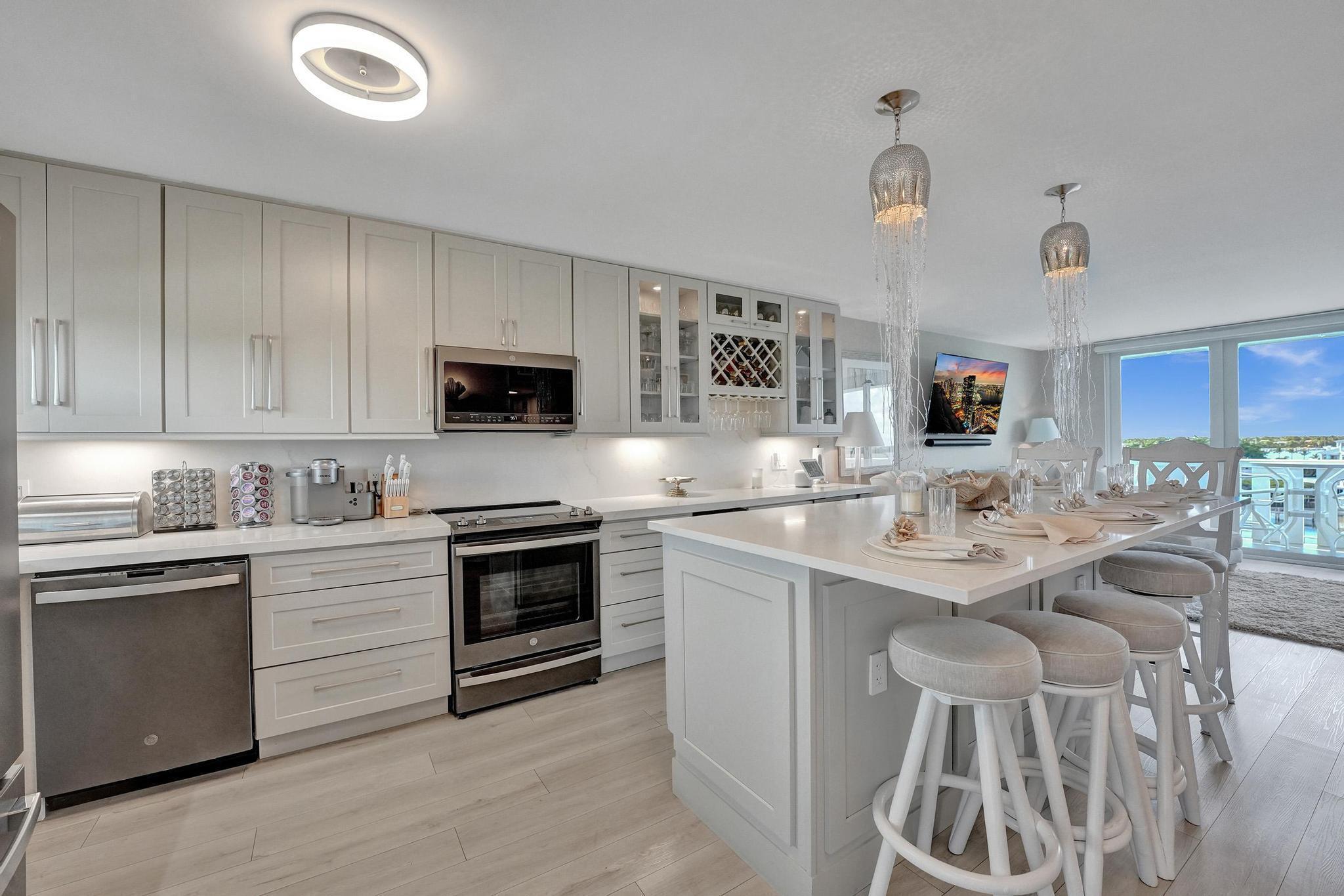 Live the Florida Dream in Style This stunningly renovated 2-bedroom, 2-bathroom condo offers breathtaking panoramic views of the Intracoastal Waterway and the Atlantic Ocean, blending the best of coastal living with modern elegance. Designed by the renowned Palm Beach designer, Jeanne Michelle, every detail of this residence has been meticulously crafted for both style and comfort. Step into a coastal modern oasis, fully furnished and turnkey, ready for immediate enjoyment. The spacious kitchen, perfect for entertaining, features a large island and striking jellyfish pendant lights, while grasscloth wallpaper and charming shell sconces create a welcoming atmosphere. With impact windows throughout and remote-controlled blinds, you'll enjoy both beautiful views and comfort.