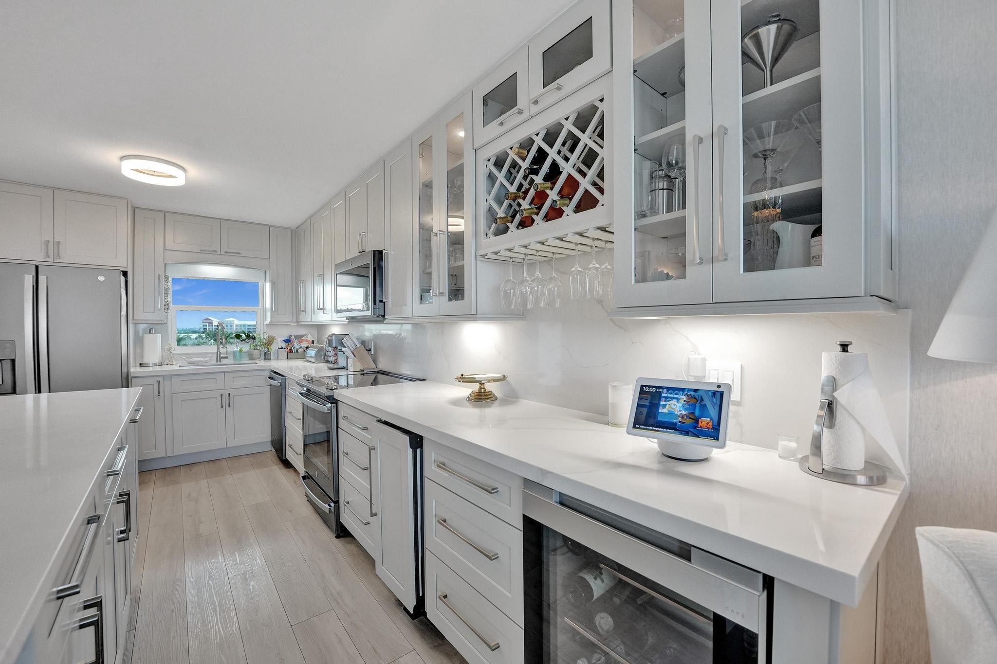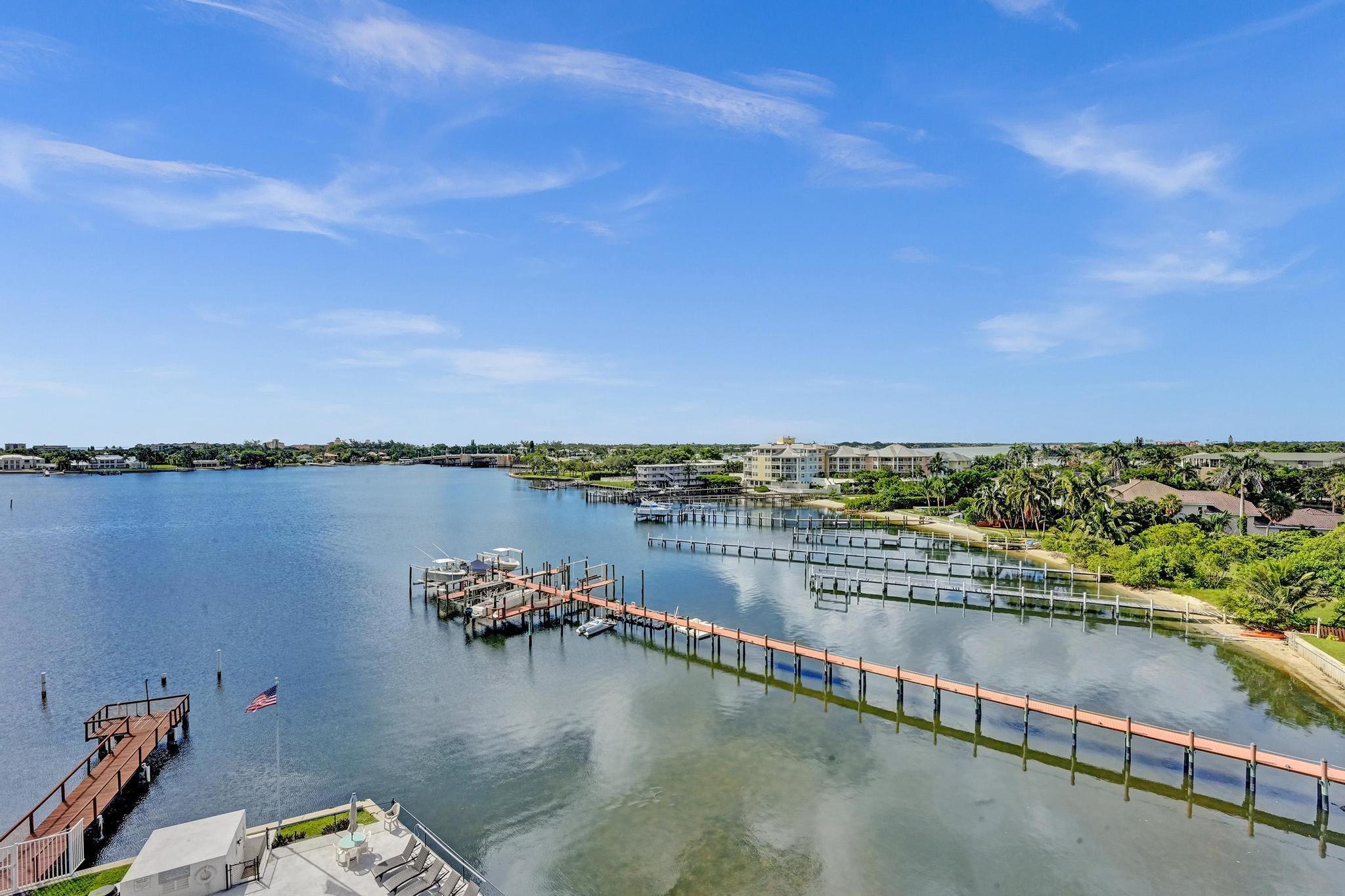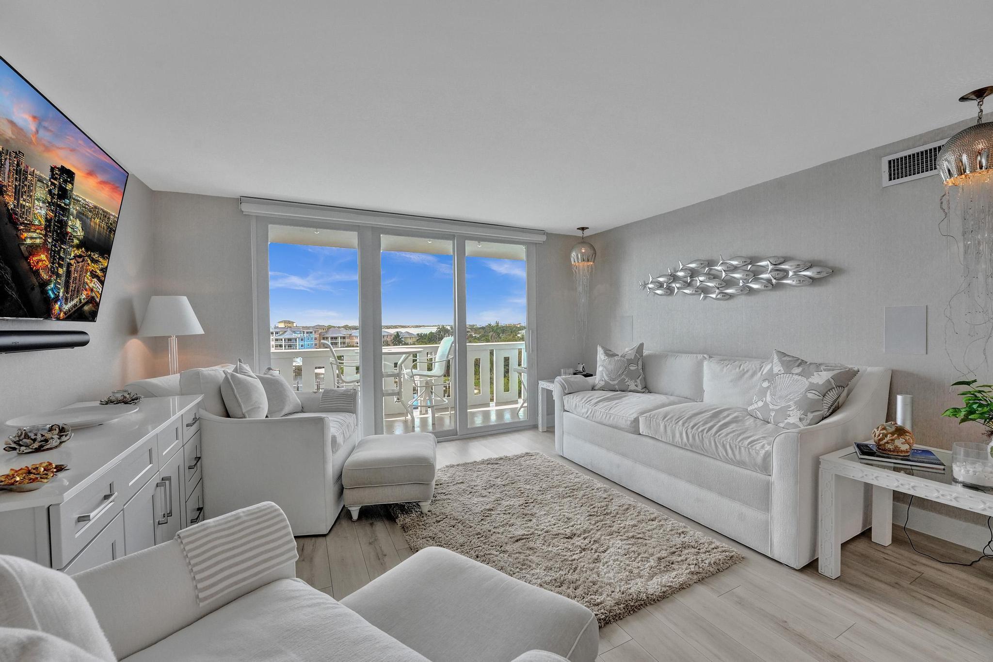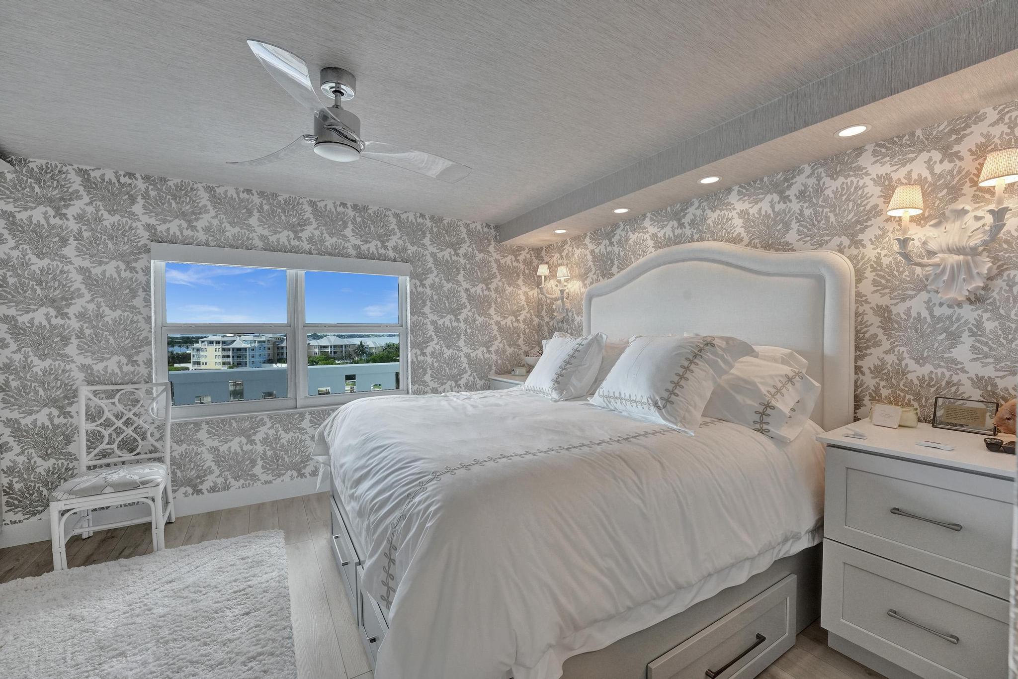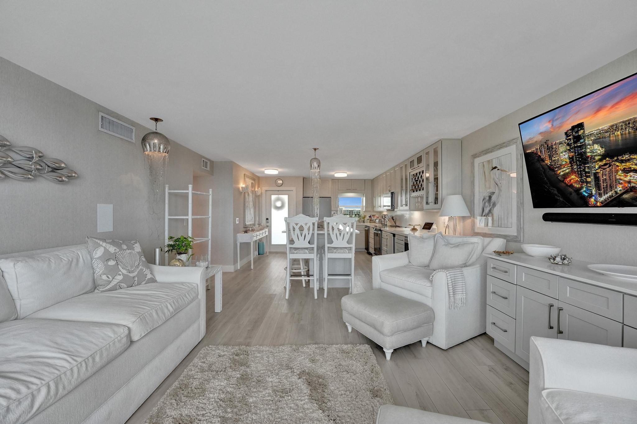 Live the Florida Dream in Style This stunningly renovated 2-bedroom, 2-bathroom condo offers breathtaking panoramic views of the Intracoastal Waterway and the Atlantic Ocean, blending the best of coastal living with modern elegance. Designed by the renowned Palm Beach designer, Jeanne Michelle, every detail of this residence has been meticulously crafted for both style and comfort. Step into a coastal modern oasis, fully furnished and turnkey, ready for immediate enjoyment. The spacious kitchen, perfect for entertaining, features a large island and striking jellyfish pendant lights, while grasscloth wallpaper and charming shell sconces create a welcoming atmosphere. With impact windows throughout and remote-controlled blinds, you'll enjoy both beautiful views and comfort.