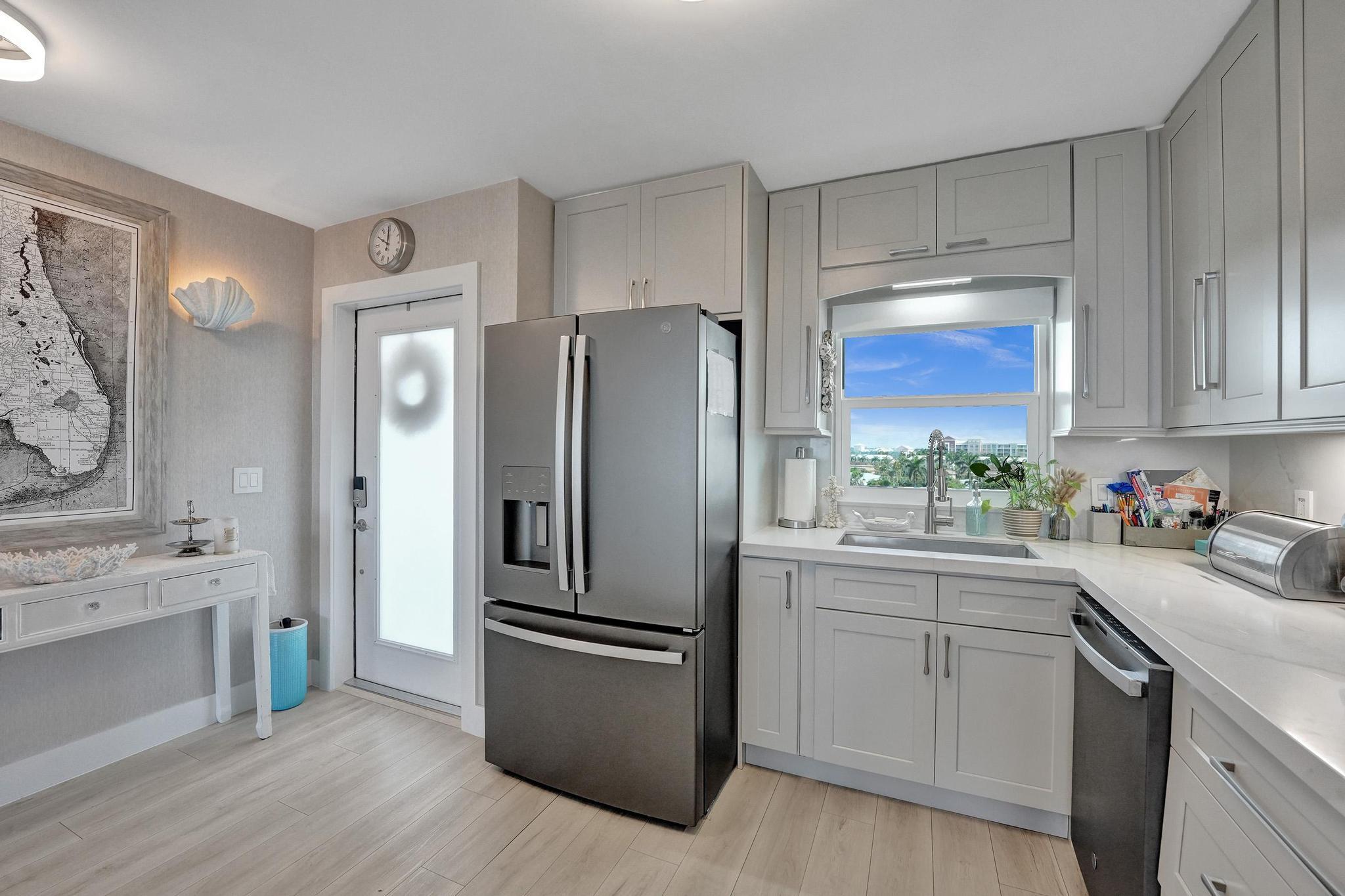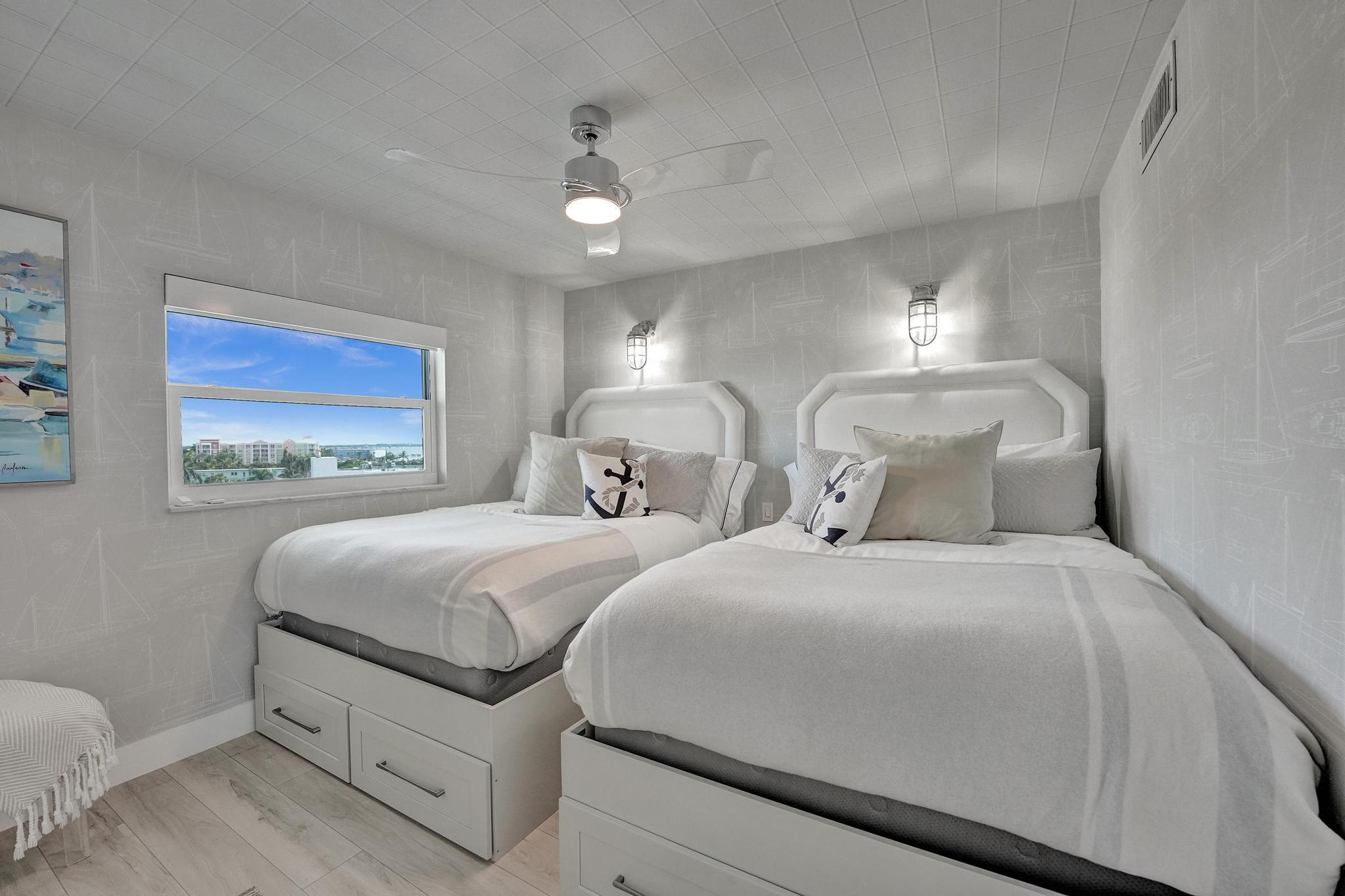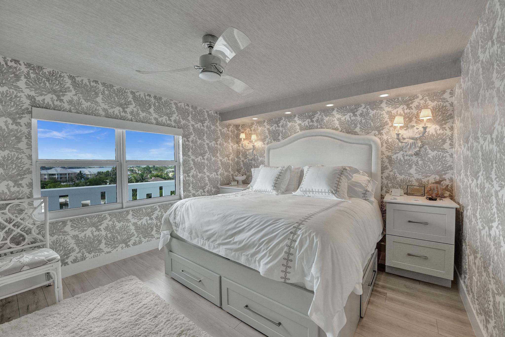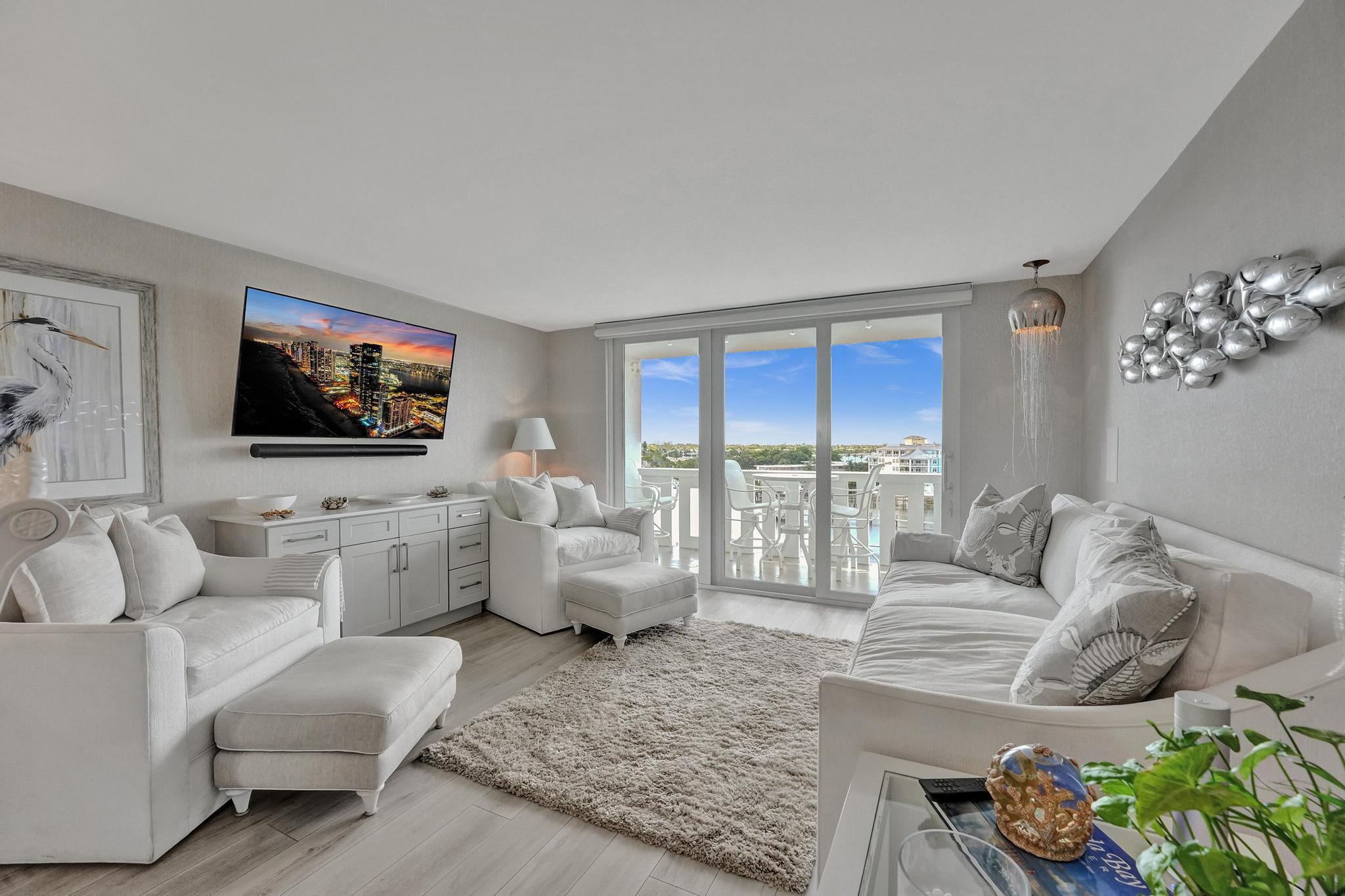 Live the Florida Dream in Style This stunningly renovated 2-bedroom, 2-bathroom condo offers breathtaking panoramic views of the Intracoastal Waterway and the Atlantic Ocean, blending the best of coastal living with modern elegance. Designed by the renowned Palm Beach designer, Jeanne Michelle, every detail of this residence has been meticulously crafted for both style and comfort. Step into a coastal modern oasis, fully furnished and turnkey, ready for immediate enjoyment. The spacious kitchen, perfect for entertaining, features a large island and striking jellyfish pendant lights, while grasscloth wallpaper and charming shell sconces create a welcoming atmosphere. With impact windows throughout and remote-controlled blinds, you'll enjoy both beautiful views and comfort.