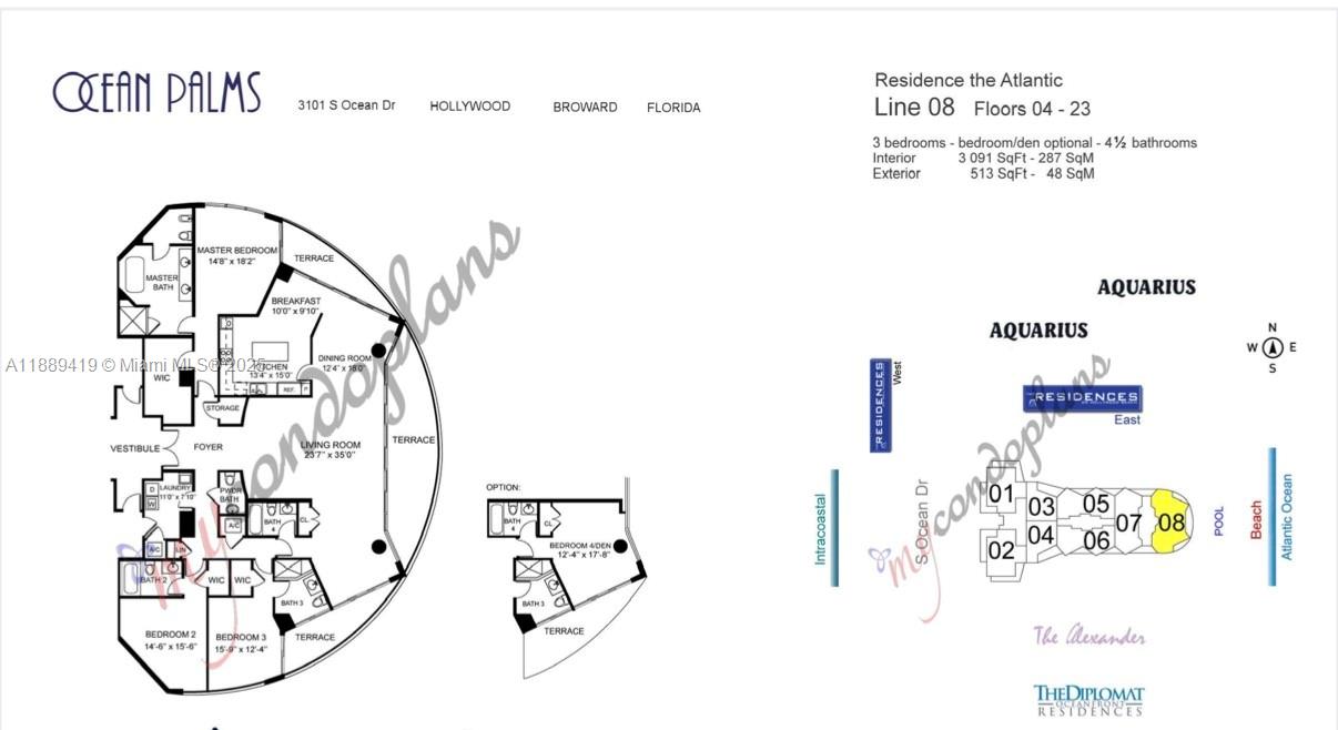 Completely remodeled direct oceanfront residence at Ocean Palms. 3 bedrooms plus den (convertible to office/4th bedroom), 4.5 baths, 3,091 sq. ft. interior + 513 sq. ft. balconies. Beautiful Italian slab tile floors throughout, custom bathrooms with European fixtures, master bath with double vanity, tub, glass shower, and walk-in closets in all bedrooms. Leicht German kitchen with custom cabinetry, quartz counters, Miele appliances incl. induction cooktop and retractable downdraft vent. Two new AC units. Three balconies with ocean, city & Intracoastal views. Amenities: resort-style pool, 2-story fitness center, spa, party & billiard rooms, movie theater, tennis court, BBQ area, 24/7 security, valet. Apartment includes 2 garage spaces & storage.