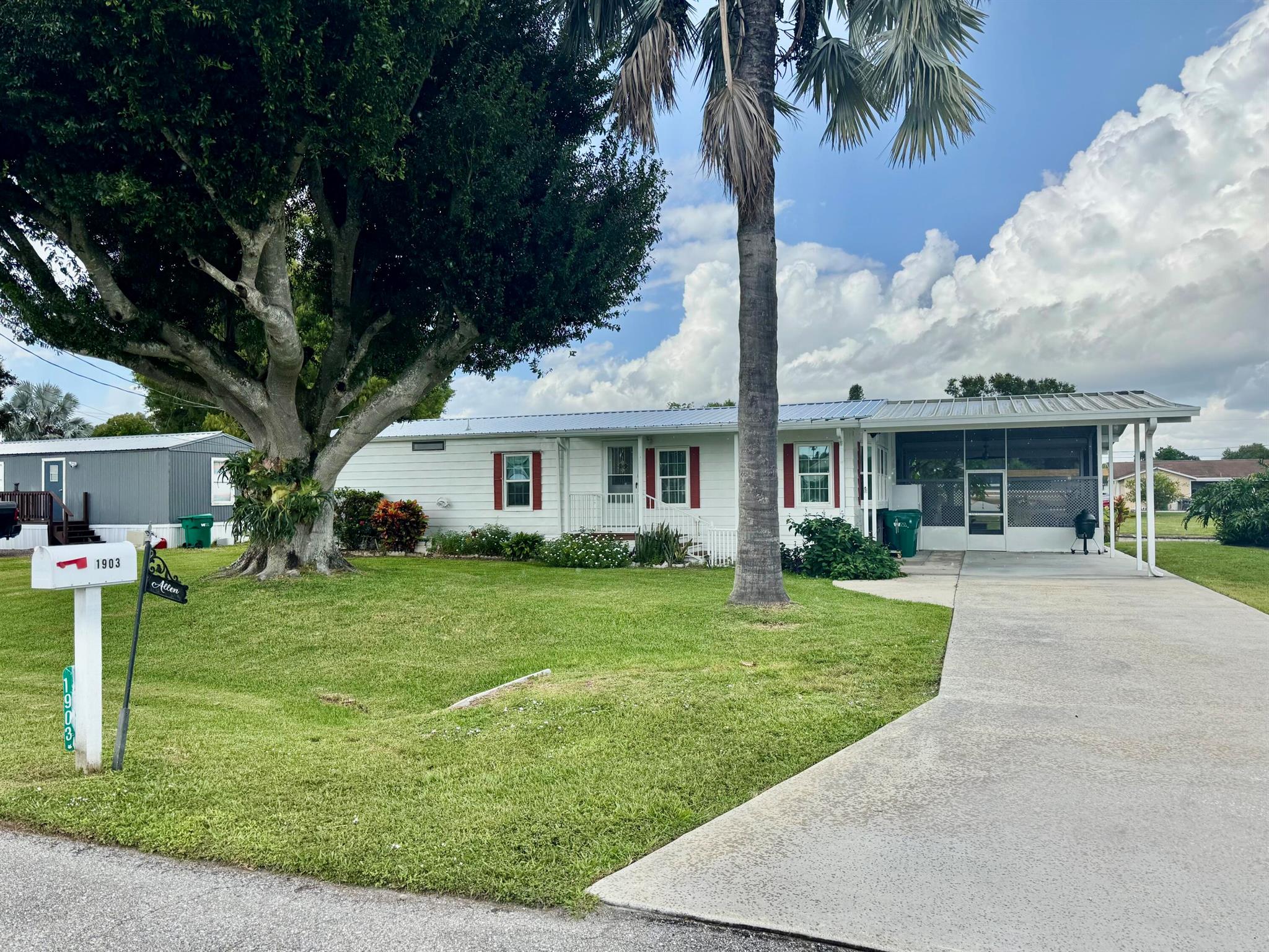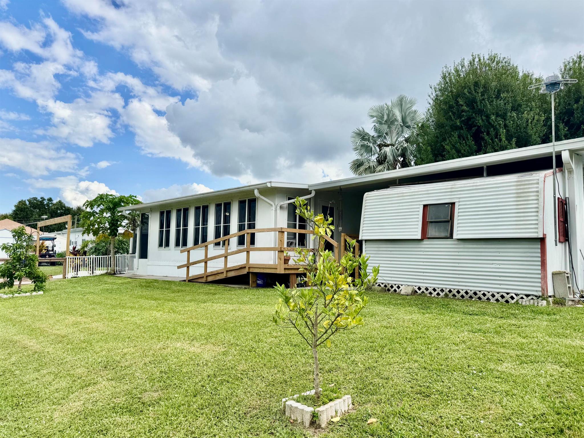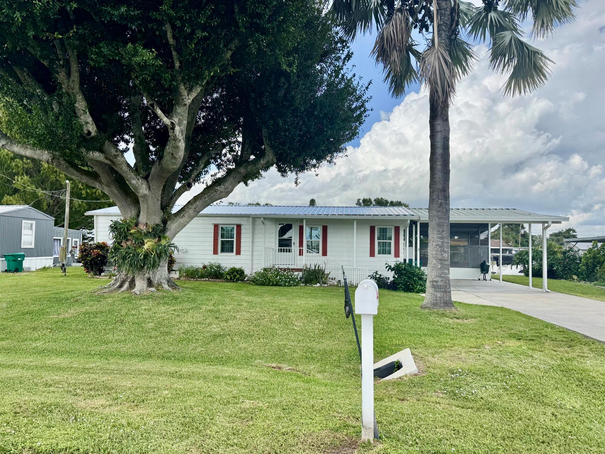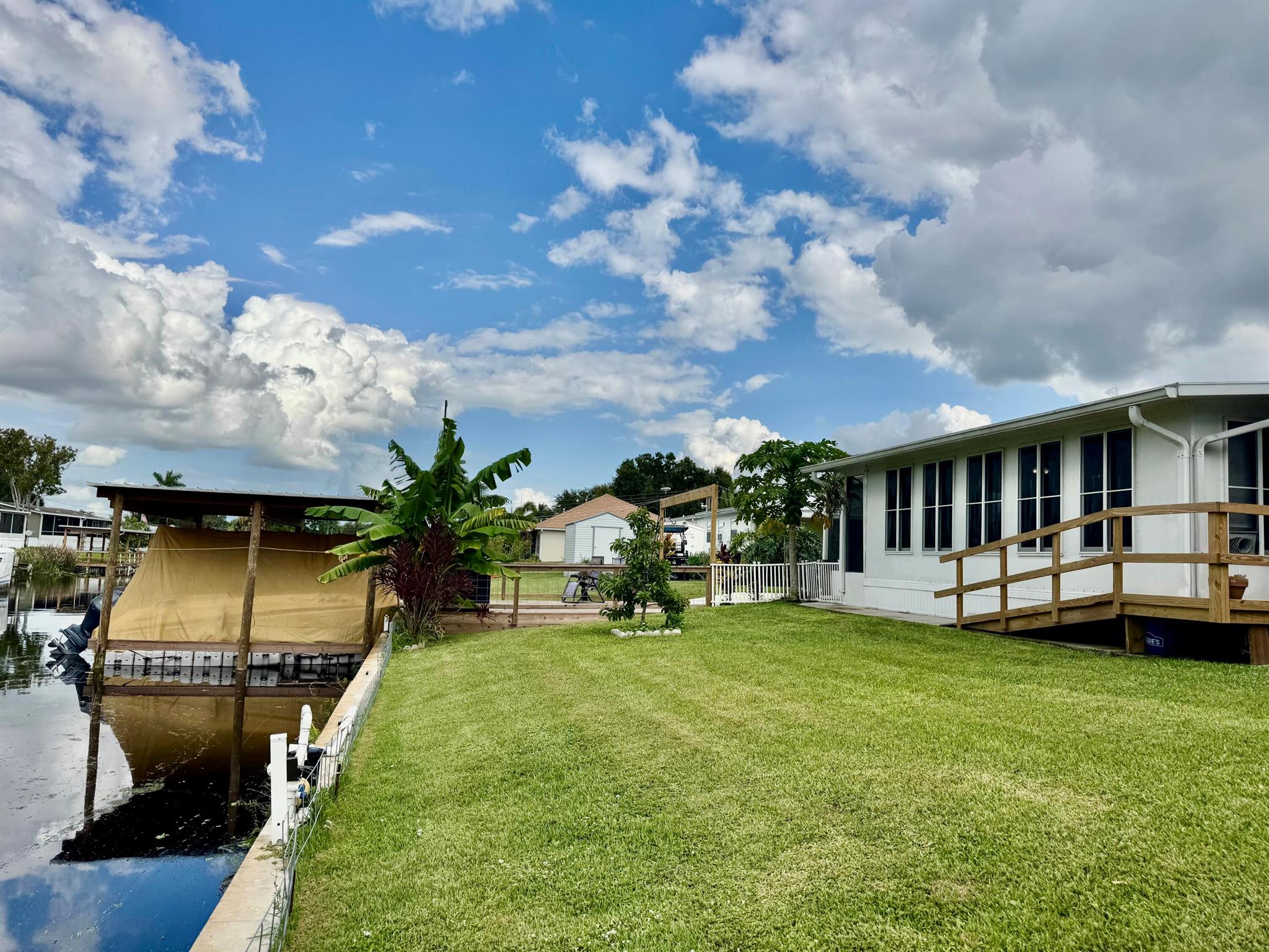 TAYLOR CREEK ISLES~Lake ''O'' access! Pristine 2Bd/ 2Ba DWMH w/ 2Carport. Beautiful open concept. Renovated Chef's dream kitchen, 9' island, cooktop, double oven, coffee bar, pullout shelves and lots of extras. 15x24 grand room, skylight, panoramic view of water. Master suite has double barn door walk in closet. Remodeled Baths. NEW LVP flooring. Lovely 17x14 screened Lanai.16x20 open patio with retractable awning. Back ramp access. Shed, Fenced. Papaya, banana, avocado and orange trees. Seawall, covered floating dock. PERFECTION at its FINEST! Dimensions are approximate, must measure for exact