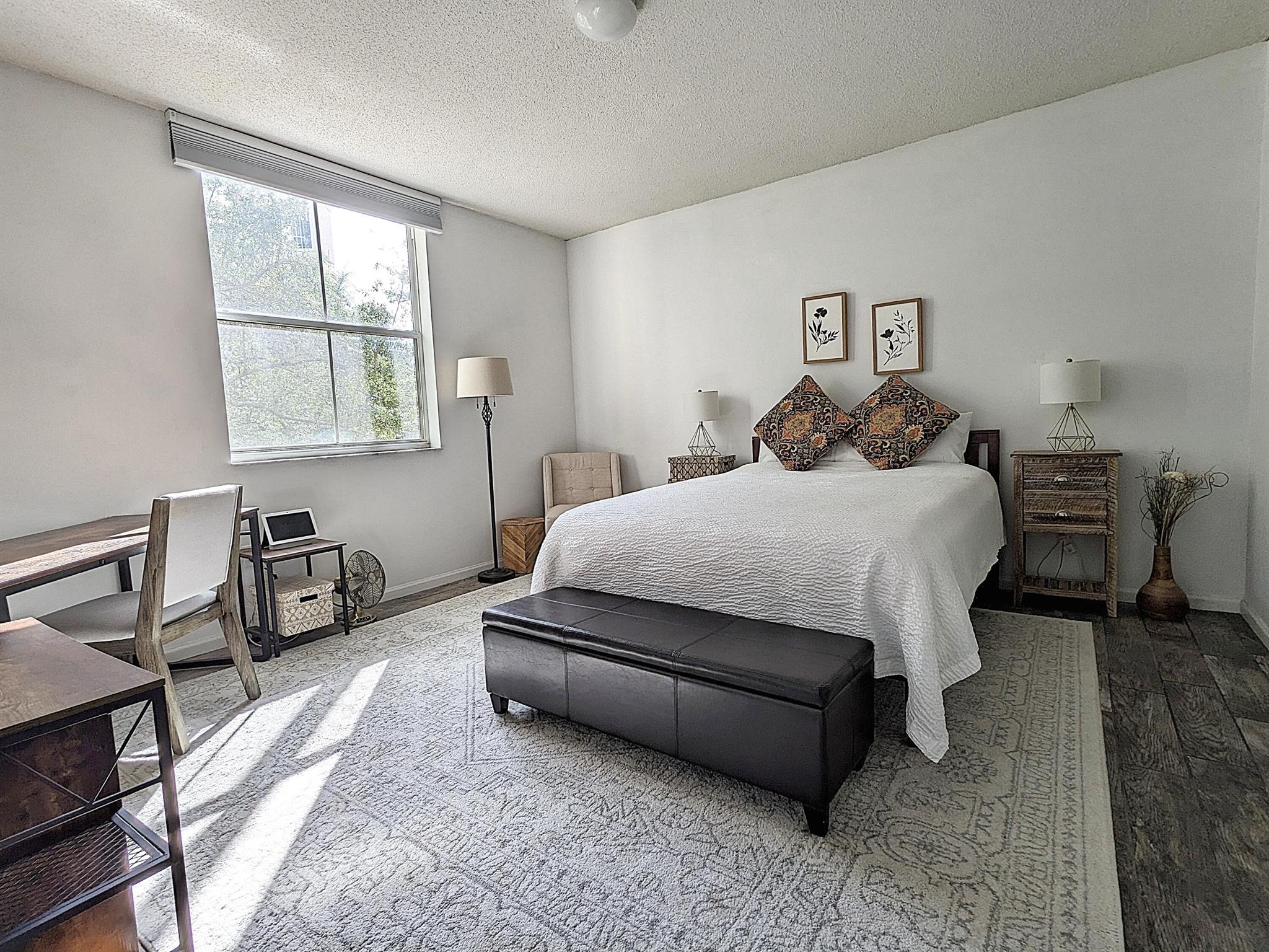 Experience the spaciousness of nearly 1300 sq ft - the largest floor plan in the Courtyards condo complex. This rare corner unit offers an entrance hallway, two large en-suite master bedrooms, large living room, separate dining area, laundry/pantry room, and ample storage with three walk-in closets and 2 linen closets. Turnkey with updated kitchen and bathrooms, lovely cabinets, granite countertops, stainless steel appliances, wood-look flooring throughout, a full-sized washer/dryer. It overlooks a serene, tree-lined interior courtyard and includes a secure parking space in the attached garage on the same level! The Courtyards community offers a concierge desk, gym,pool, spa, business center and more.