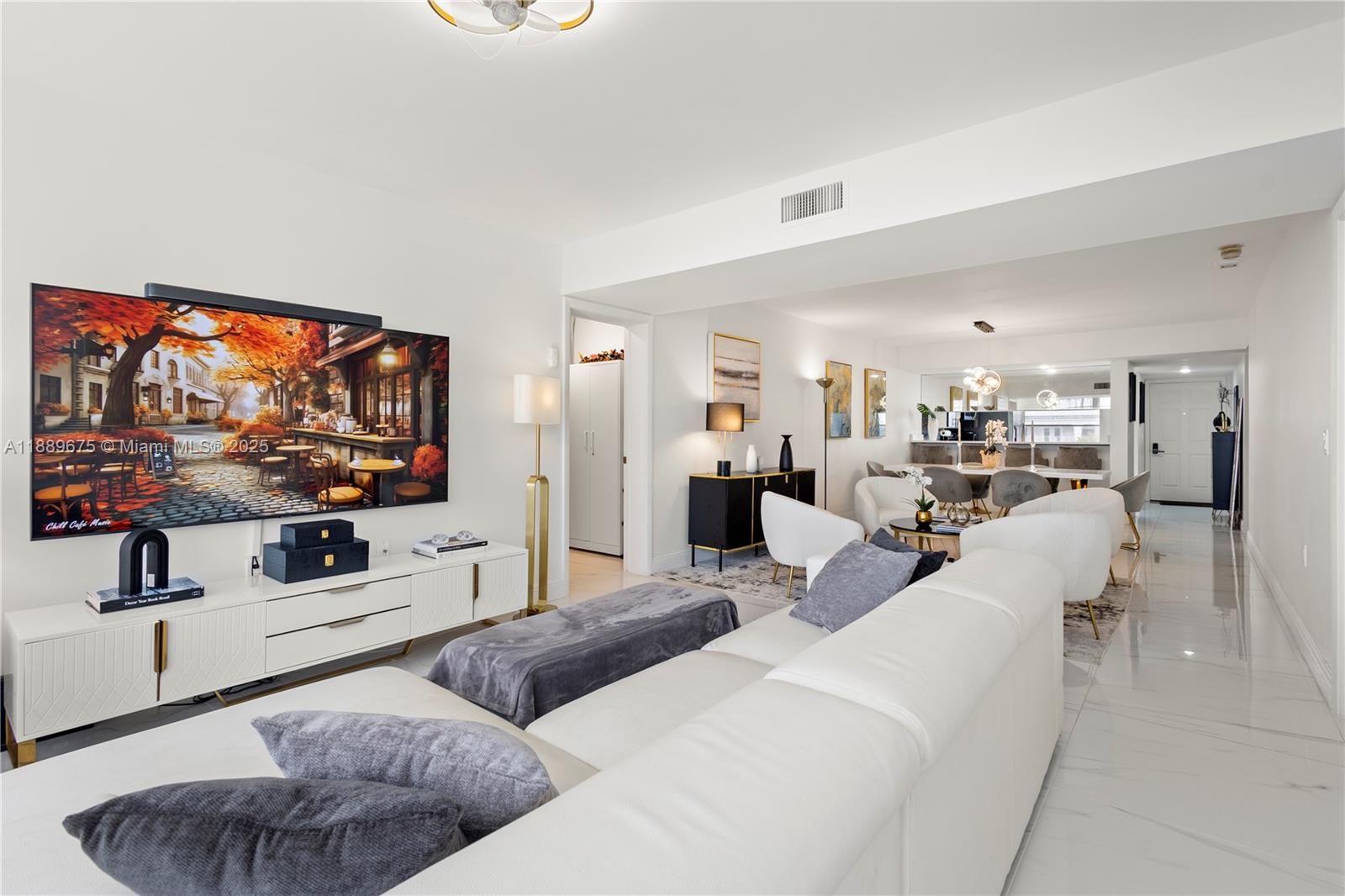 Beautiful 3 bed, 2 bath apt with 1,437 Sqf. Renovated with high-end materials and luxury details. It offers a large living room with Tv room, conversation room, dinning room and a bar for 4 people. It has 2 large bedrooms, great loundry area (new washing and dryer machines) whose annex was converted into a 3rd bedroom and also can be used as an office. High quality designer finishes throughout. All impact windows, 48x48 italian porcelain tile flooring throughout the apt, including the kitchen and bathrooms, smooth ceelings and wall painted in white with high quality paint for an easy cleaning. Must see!