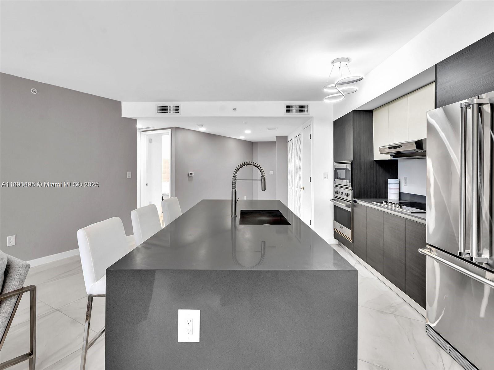 Experience exclusive island living in this one-of-a-kind lanai corner residence. This spacious unit features sleek European cabinetry, quartz countertops, and top-of-the-line Viking appliances. Bathrooms are finished with elegant marble flooring, includes a ground-level storage space and 2 assigned parking. Massive 479sf private balcony. Located in The O Residences, a boutique waterfront condominium offering resort-style amenities such as a sunset-facing pool and hot tub, cascading waterfall, spa with sauna and steam room, fitness center, bay front water deck with kayaking and paddle boarding, and an outdoor summer kitchen with barbecue. Just a short walk from the beach and world-renowned Bal Harbour Shops. Short-term rentals allowed.Seller paid assessment in full.