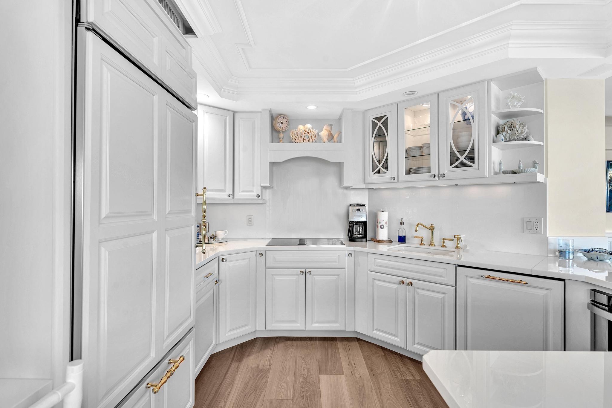A JEWEL BOX-Walk in and experience ultimate elegance done in Palm Beach Coastal with Gold Appointments-This designer unit was the builder's model featured in Florida Design Magazine-Spacious corner unit has expansive views of the Lake and The Boca Resort accented by beautiful gardens and Pool views ! Large Living room has 2 seating areas-Magnificent Open Gourmet Kitchen done in exquisite white includes a sub-zero refrigerator-Dining Room facing the Water captures tranquility ! Over-sized bedrooms , and a separate Laundry room with a sink- This is a one-of-a-kind unit on Lake Boca ! You have never seen one like before ! Unit is furnished, Turn Key ! Service Animals allowed.