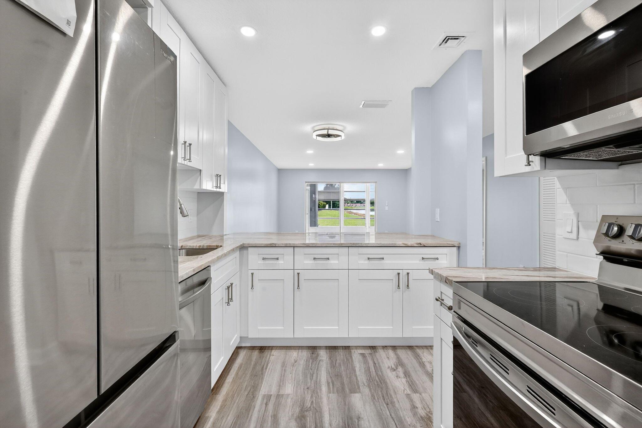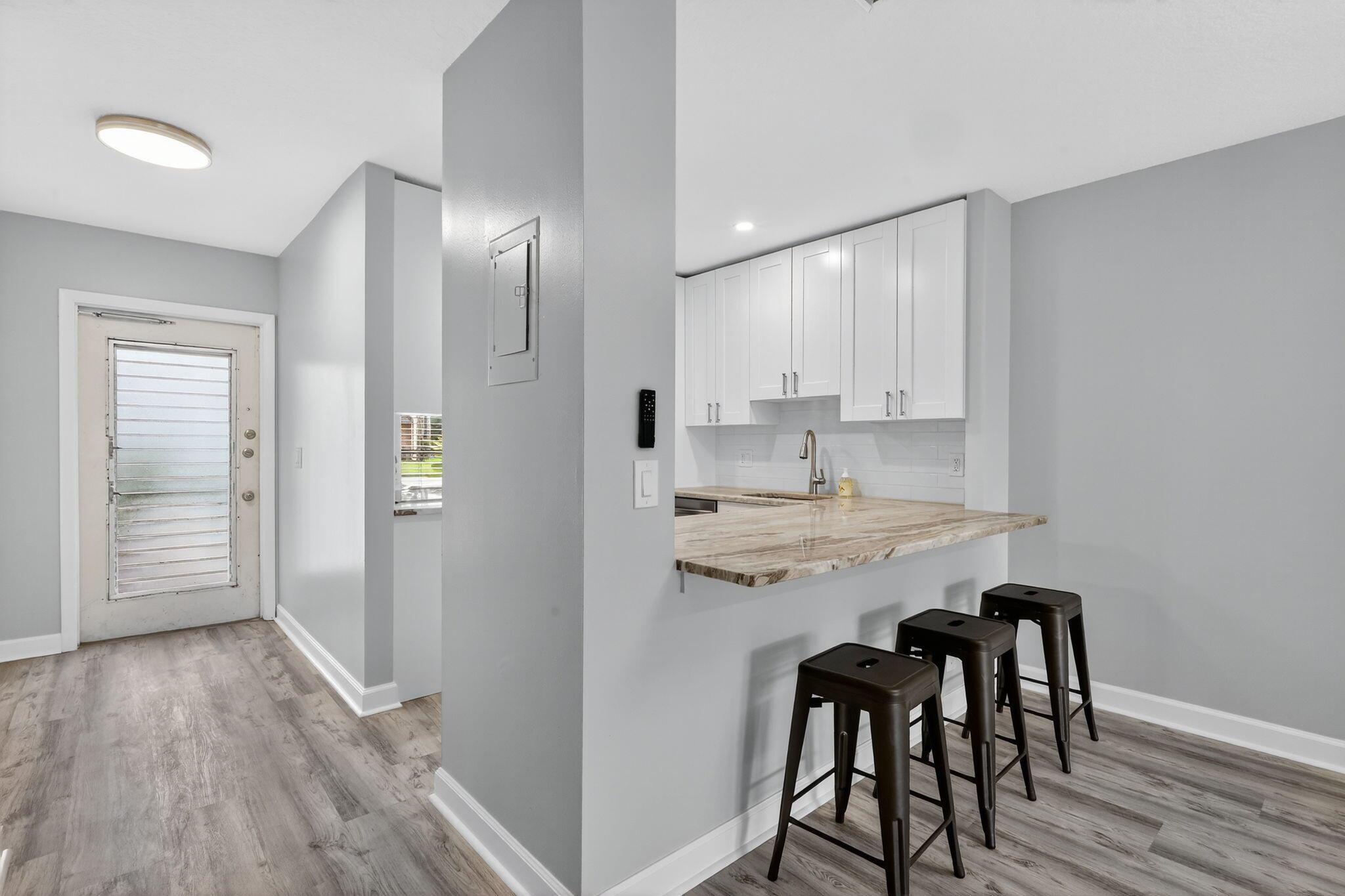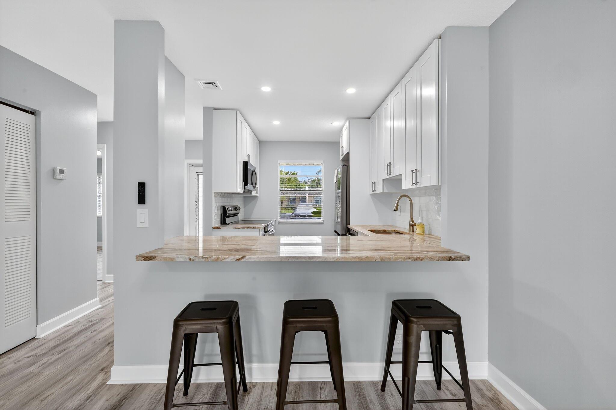 Completely remodeled 2 Bedroom, 2 Bath one story villa. Brand new kitchen with brand new appliances. Bathroom redone. New paint and No popcorn on the ceilings. New washer / dryer and fixtures. Super clean and super cute! 55 plus community.