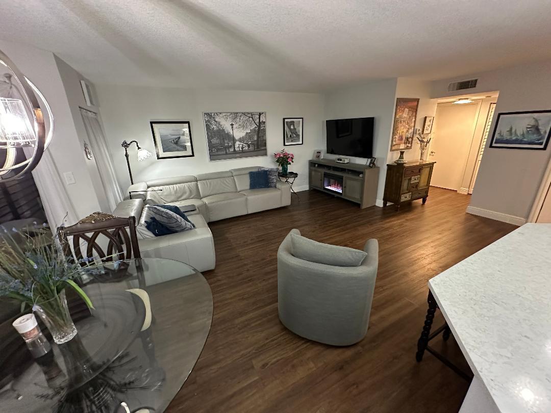Camino Real Village-A desirable place to call home. Spacious 2/2, all ages, manned gate, 2nd floor w/elevator. 1550 s.f. incl. screened-in patio, water view. Sliding doors open onto patio from dining and bedroom. A.C. only 4 years old, no popcorn, vinyl plank floors, open concept, quartz counter, Whirlpool appliances, full size washer/dryer. Lg. master b.r. suite w/walk in closet and 2nd closet. Guest bedroom has double doors. Condo passed milestone inspection, no assessments, fees not increasing. Mo. fee inc. internet, cable tv, water, roof, reserves. Gym room, 4 htd. pools, 2 tennis courts, pickleball, b.b.q. grills. A rated schools, 5 miles to the beach, close to shopping, I95. No trucks. Can lease after 3 years. Clean, well maintained. Priced To Sell, Motivated Seller.