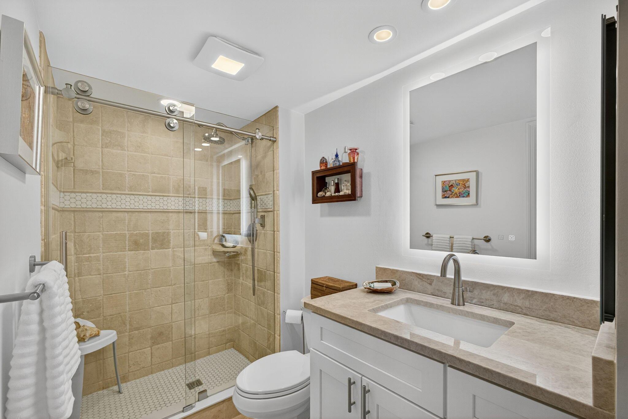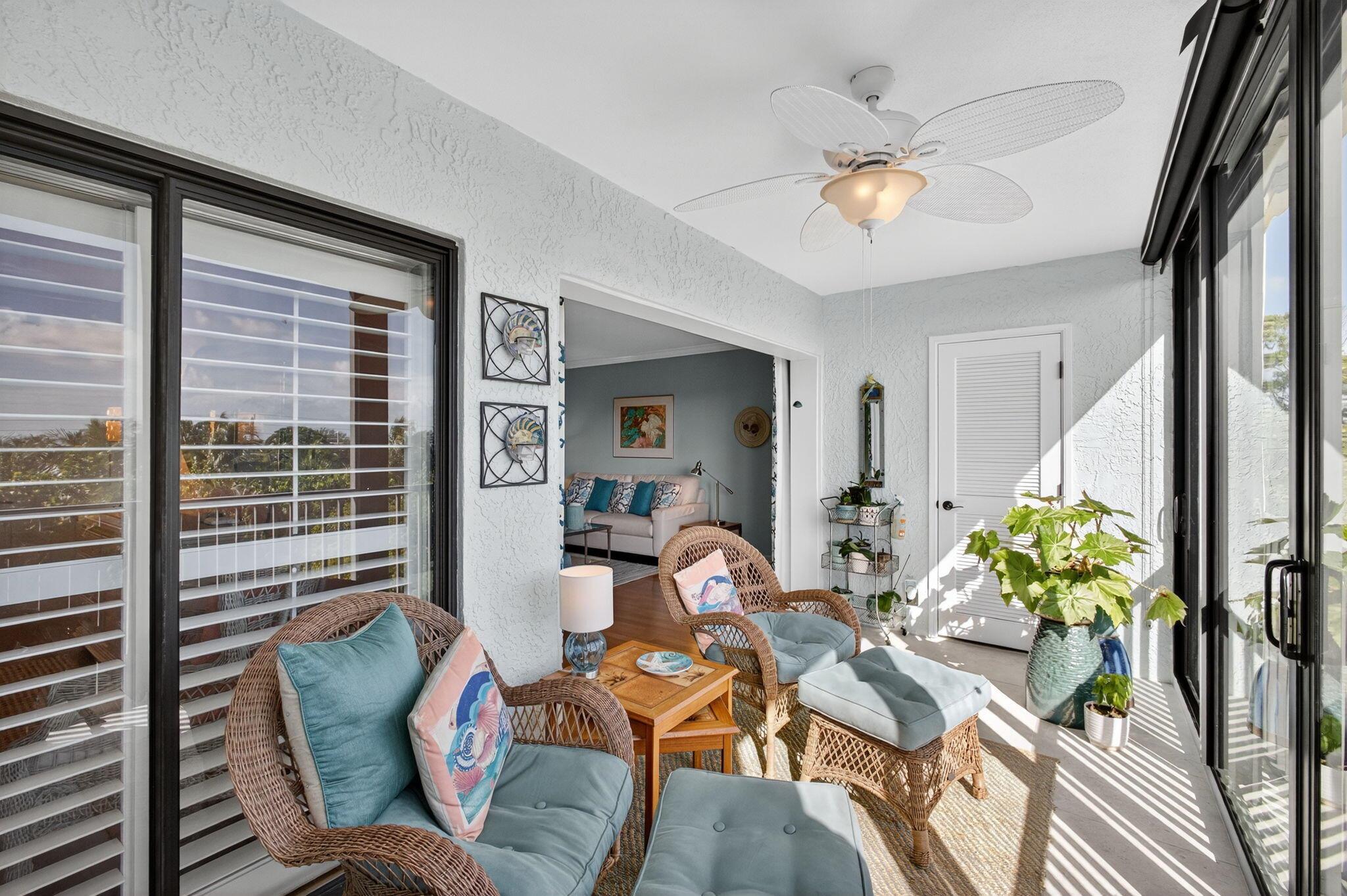 Walk to the turquoise waters of Jupiter Beach from the beautifully renovated & updated penthouse condo in the seaside community of Ocean Parks. Relax on the screened & impact glass enclosed lanai, now a comfortable sun room that offers additional living space & constant ocean breezes. Lovely redesigned kitchen offers an open floor plan with great views, additional solid wood cabinetry. built-in office area, SS appliances, custom backsplash. Both baths updated w/ walk-in showers, tiled floors, new vanities, lights, fixtures & mirrors. Custom walk-in closet in primary; closet organizer in guest; all wood & tile flooring; impact glass complete; plantation shutters; crown molding; custom shades & storage closet in sunroom; ceiling fans; Carport ''BB''; NEW A/C & water heater; full sized W/D,