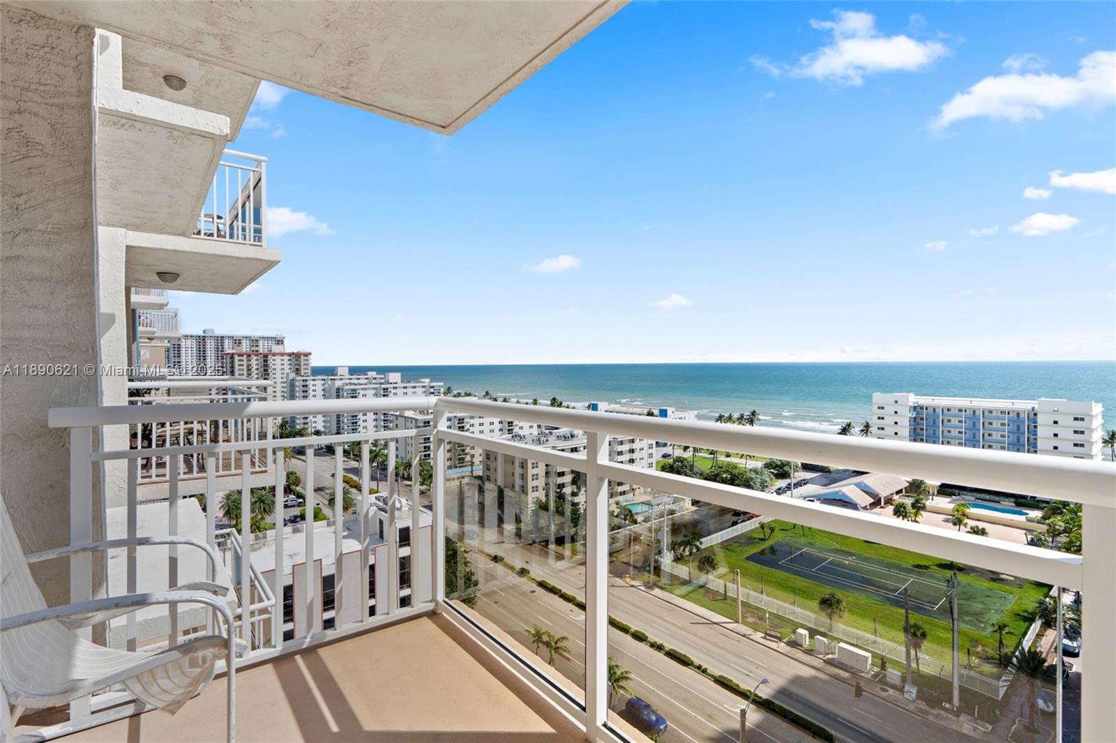 ACT NOW! Experience spectacular ocean views from this 15th-floor home in the sky. This spacious 2-bedroom, 2-bath residence offers dazzling sunrises and an open living area framed by a wall of floor to ceiling windows for a breathtaking view. The primary suite features a generous walk in closet and a beautifully updated bath. Enjoy lovely laminate wood floors throughout, in unit storage closet, and a large glass balcony with hurricane impact doors. The kitchen and guest bath are ready for your personal design flair.. Amenities include a well-equipped fitness center, heated pool, 24-hour security, on-site manager, bike and storage lockers. Just steps from the ocean, minutes to the Hollywood Broadwalk, and only 15 minutes from the airport. Small pet welcome.