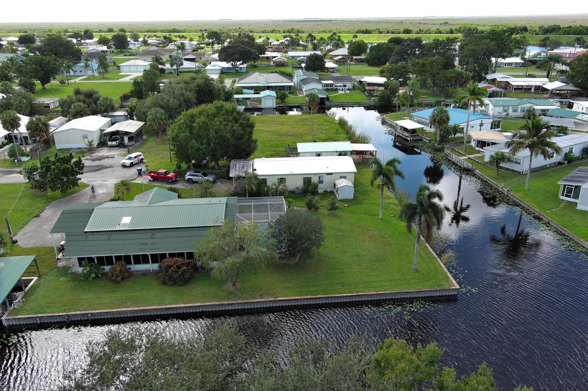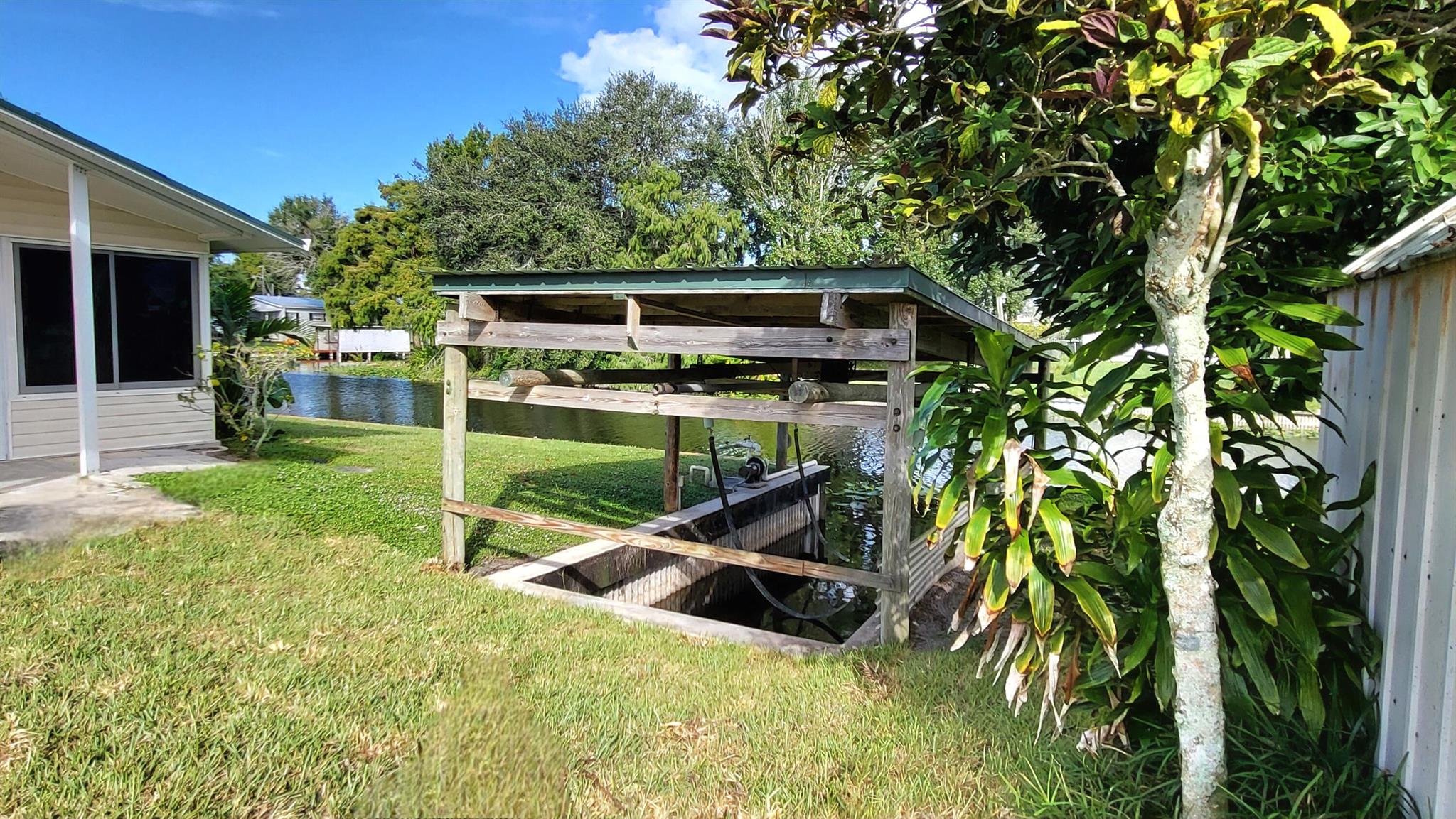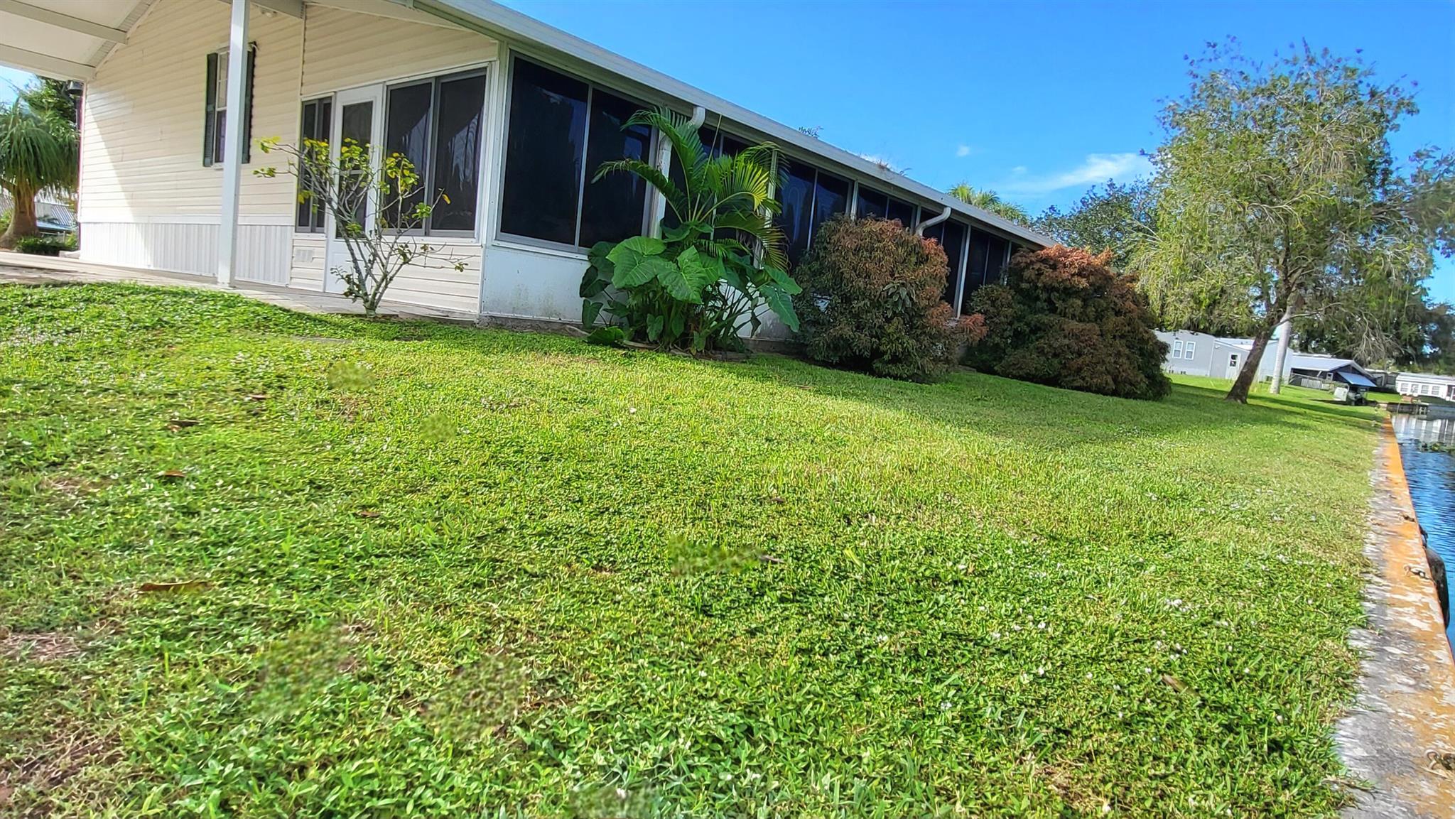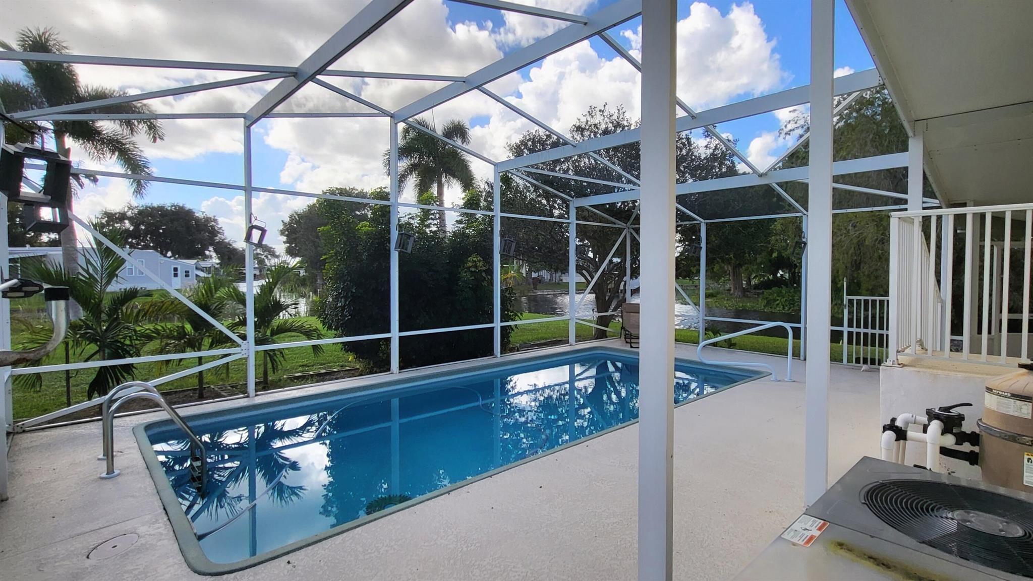 WATERFRONT POOL HOME sprawling over .26 acres situated on a cul-de-sac and converging canals. LAKE OKEECHHOBEE ACCESS. Relax or exercise in the lavishly inviting 12x24 sparkling pool with non-skid, cool-coated surface under a fully enclosed patio with bona fide privacy. Any boat will appreciate the electric lift shaded under the boat slip, before a day of leisure or fishing on Lake Okeechobee. Rest-assure the impressive 220 ft of strong seawall will last a lifetime. FULL RV hookup (30/50-amp, dump & water. Zoned irrigation will keep landscaping and green & lush. Take in the calming view of the waterfront from the 12x45 Florida Room (mini-split AC). Appreciate the ample soft-close kitchen cabinets, granite countertops and updated baths. Roof 2018. No HOA. No flood zone. Avocado trees too!
