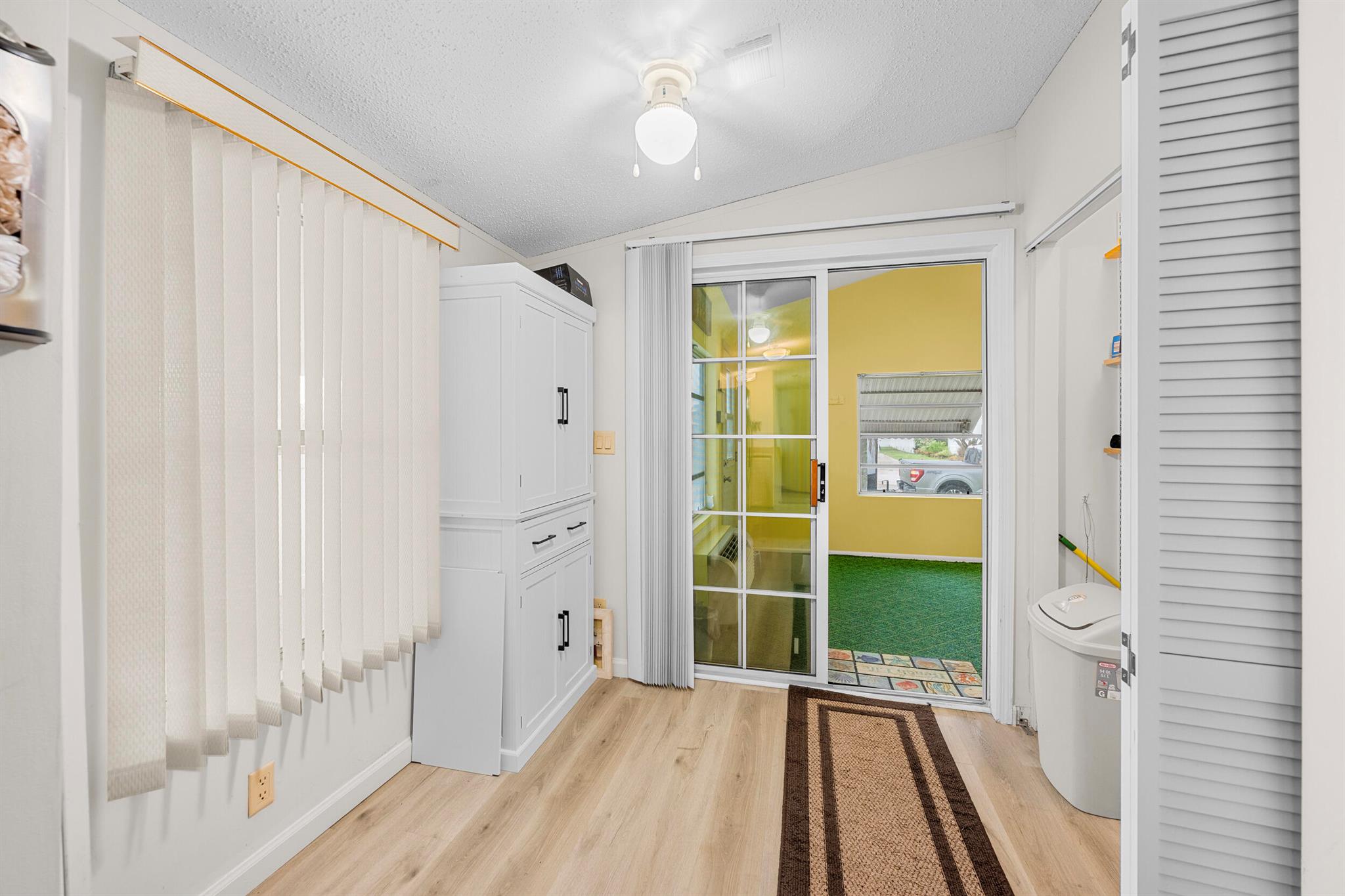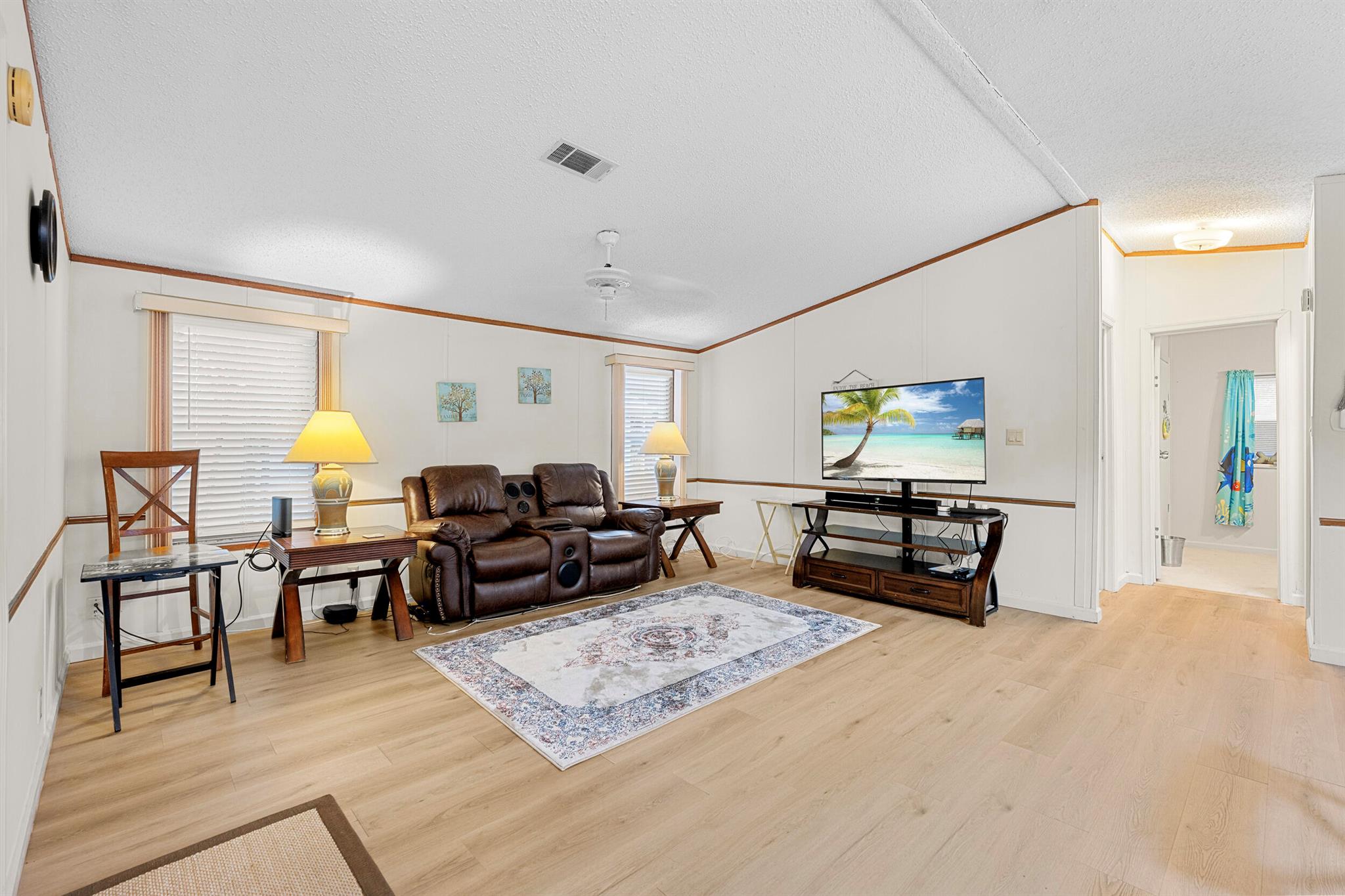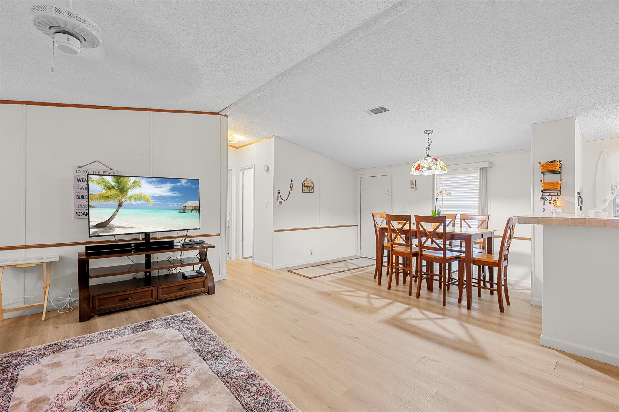 FHA approved, land owned, and Hometown Heroes eligible --NO HOA! 3BR/2BA manufactured home built in 1996 with 1,127 sq ft of living area plus a 231 sq ft enclosed A/C room (231 sq ft) 140 sq ft workshop. Updates include new roof (2024), new privacy fence (2024), new hot water heater (2023), water system 2023. CITY AND SEWER WATER! Updated kitchen, vinyl plank flooring in main living areas, and a split floor plan with a bright, open layout. The enclosed bonus room offers flexible space for an office, hobby room, or guest area. Pets allowed and plenty of outdoor space to enjoy. Located in Ridgeway, a land-owned community close to downtown Hobe Sound, beautiful beaches, Jonathan Dickinson State Park, shopping, dining, and quick access to US-1 and I-95. Coastal living with no lot rental!