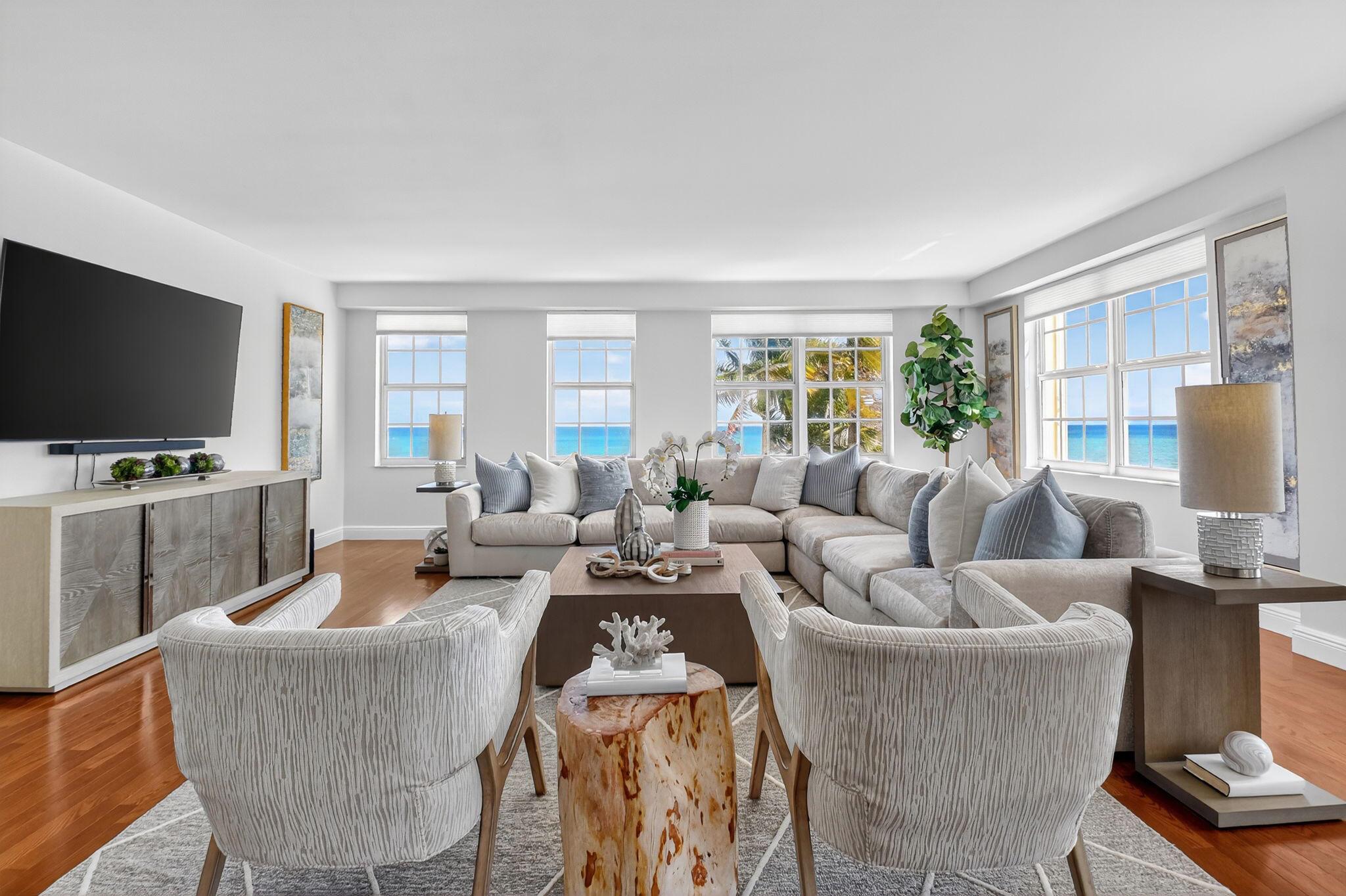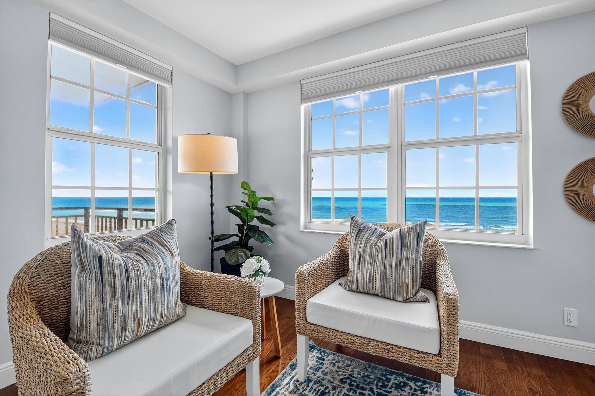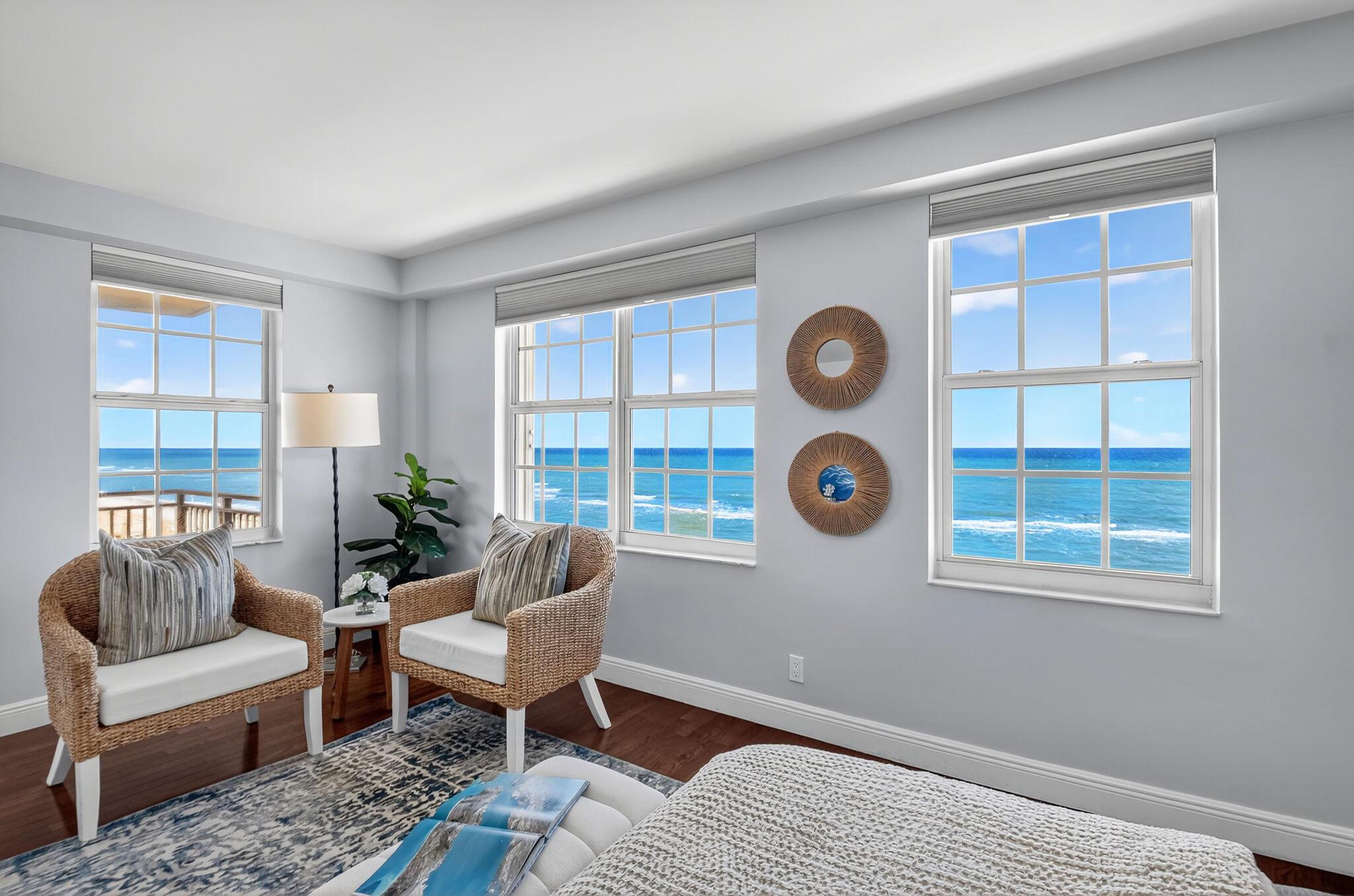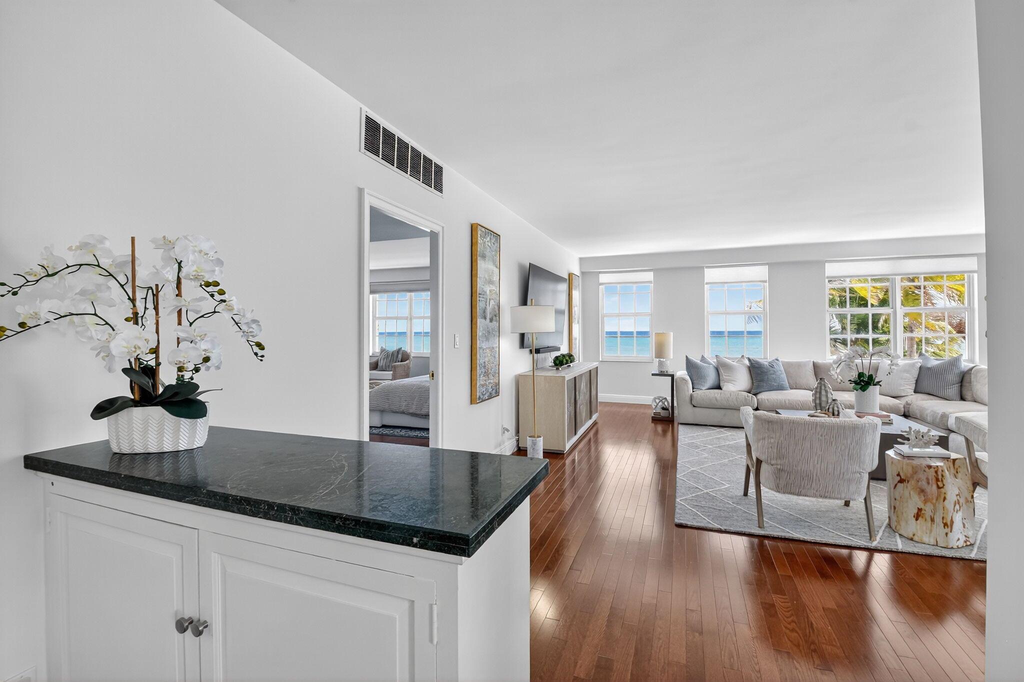 Wake up to the rhythm of the waves and endless Atlantic views in this spectacular Palm Beach oceanfront residence, where every room feels connected to the sea. The moment you enter, you're greeted by unobstructed views of the Atlantic Ocean that fill the home with light and serenity. With windows showcasing nothing but turquoise water, it feels as though you're floating aboard a private cruise ship.The expansive open-concept floorplan is ideal for entertaining, with a spacious living and dining area that opens to a generous oceanfront terrace, perfect for morning coffee, sunset cocktails, or simply watching the waves roll in. The fully renovated kitchen features custom cabinetry, quartz countertops, & premium stainless-steel appliances, while all three bathrooms have been beautifully