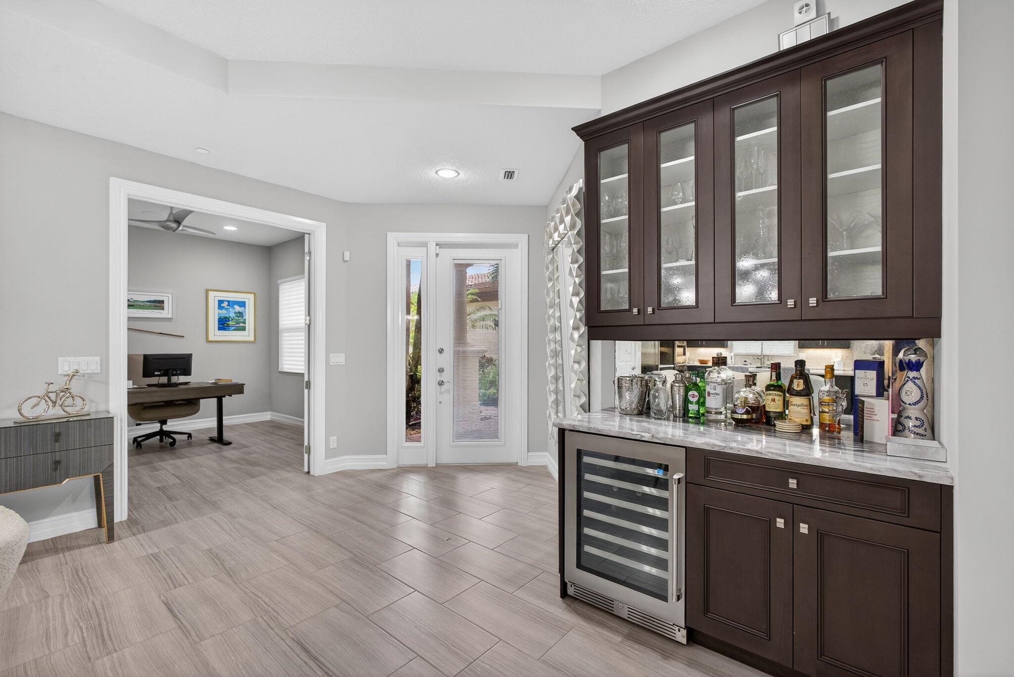 FULL GOLF MEMBERSHIP AVAILABLE IMMEDIATELY! Brand new to the market, this beautifully upgraded Toll Brothers Pesaro model is ideally situated on the ground floor with stunning golf course views. The designer-enhanced interior features a spacious open layout, beginning with a welcoming foyer that flows into a formal dining area and expansive great room including a custom bar with a newly installed wine fridge and a remote control fireplace feature creating the perfect ambience for relaxing and entertaining! The gourmet kitchen is a chef's dream, showcasing a newly expanded 10' center island quartz countertop, brand-new JennAir cooktop, Fulgor Milano luxury appliances, with access to the screened in lanai.