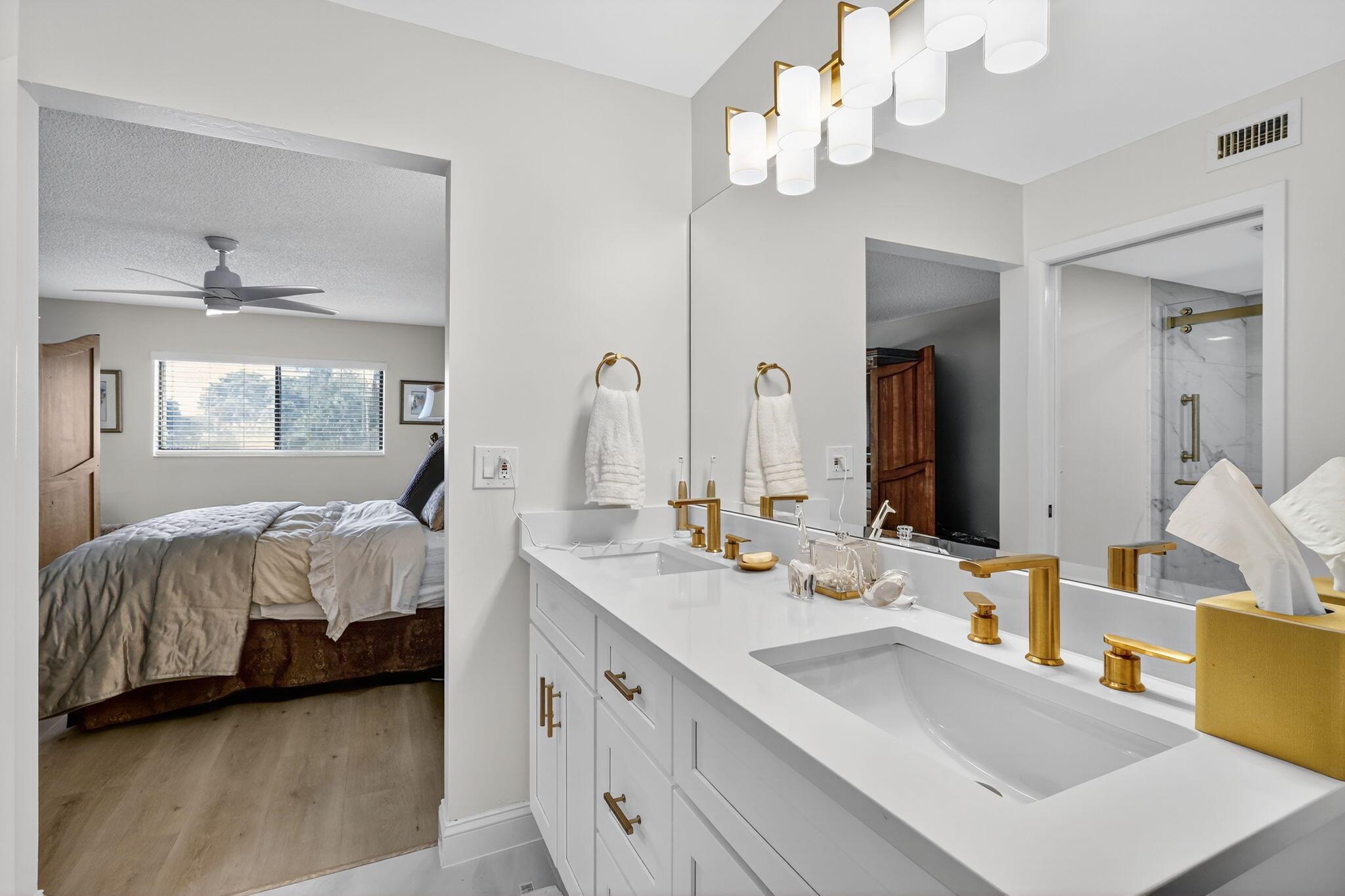 Enjoy this beautifully Watersedge updated 1st floor corner unit with a wrap-around water view in the vibrant community of Lakes of Delray. The location is ideal. 2 bedrooms, 2 baths. Luxurious wood flooring throughout the living area. A spacious kitchen with a cozy and convenient breakfast area and new blinds. The master bedroom has brand new wood-look floors. New ceiling fan and blinds also in the master. The primary bath was just completely renovated with dual sinks, new porcelain tile floors, quartz counters and contemporary cabinetry. The enclosed patio overlooks the tranquil lake and grassy expanse. The Lakes of Delray is an active community with a wide array of activities, clubs and entertainment.