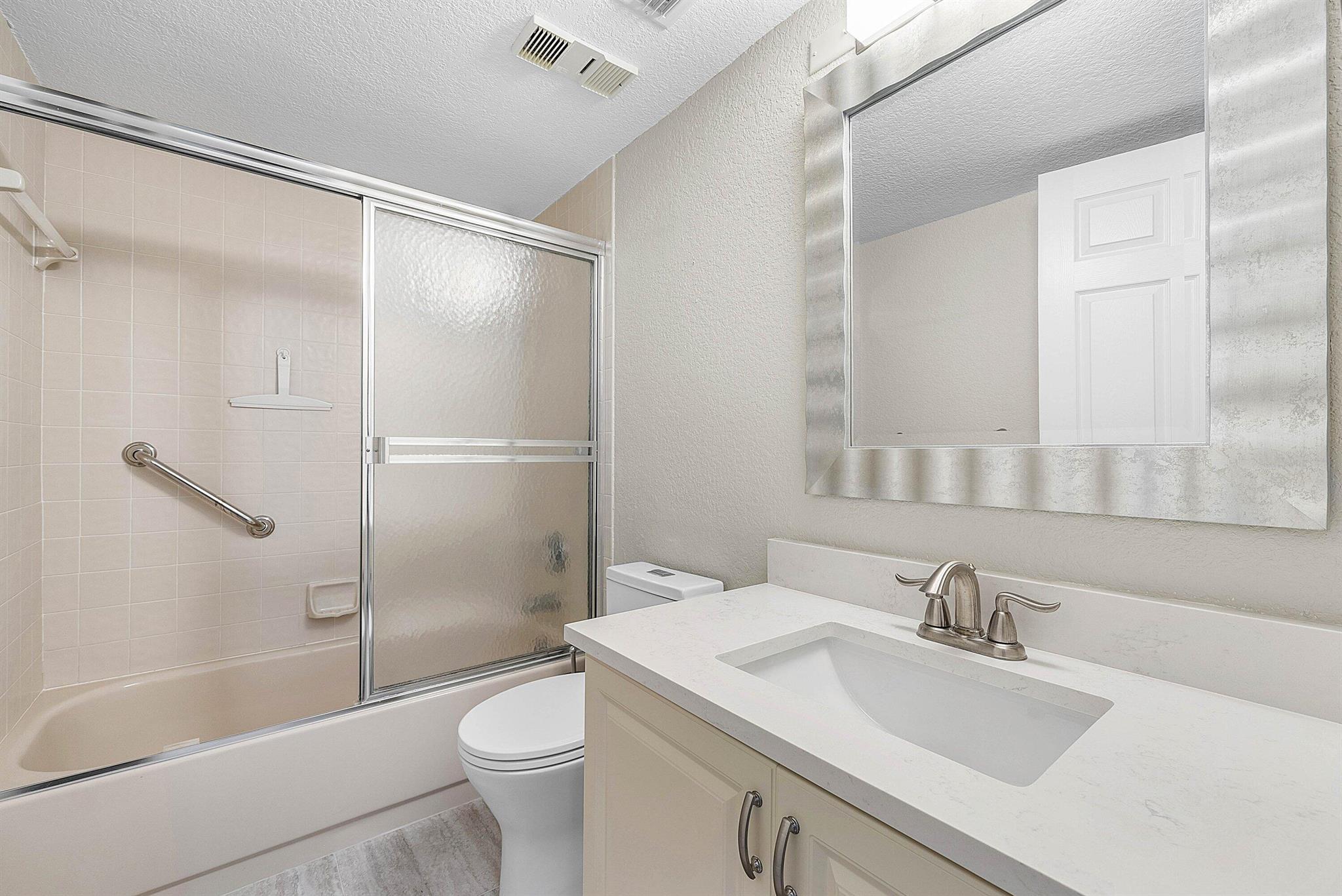 Discover this stunning condo with breathtaking lake and golf course views. This residence features two bedrooms with en suite bathrooms, a den, and a powder room. Enjoy an open ambiance with porcelain tile flooring, fresh paint, smooth ceilings with crown molding, and modern updates including a newer AC system and tankless water heater. The kitchen boasts elegant wood cabinetry, quartz countertops, and a glass tile backsplash, opening into the dining area. Ample storage with large closets and an attached storage room. Two balconies--one enclosed with glass, the other screened with electric storm shutters. Located in the gated Boca Pointe community, offering easy access to shopping, dining, parks, and more. Club membership optional.