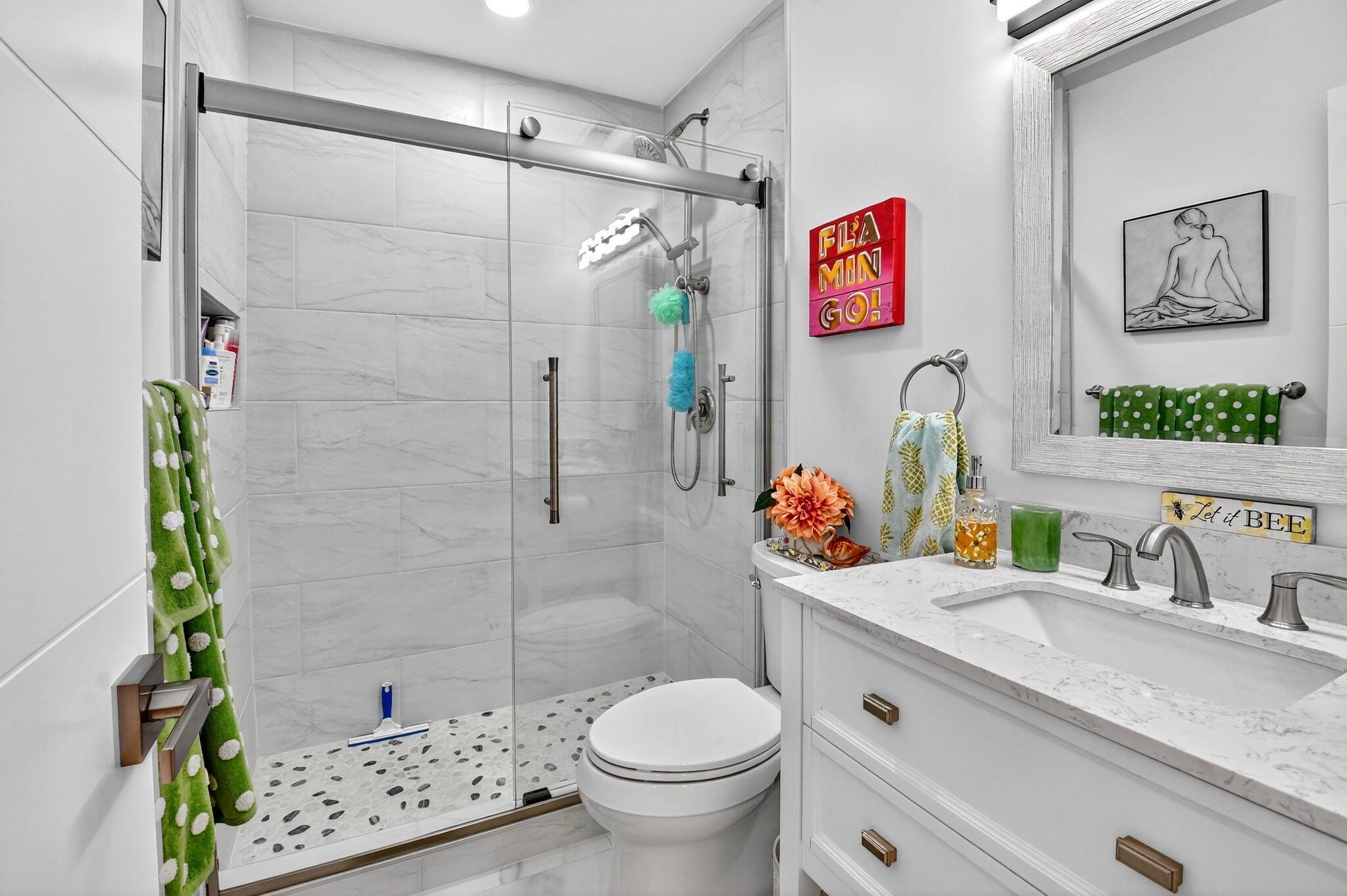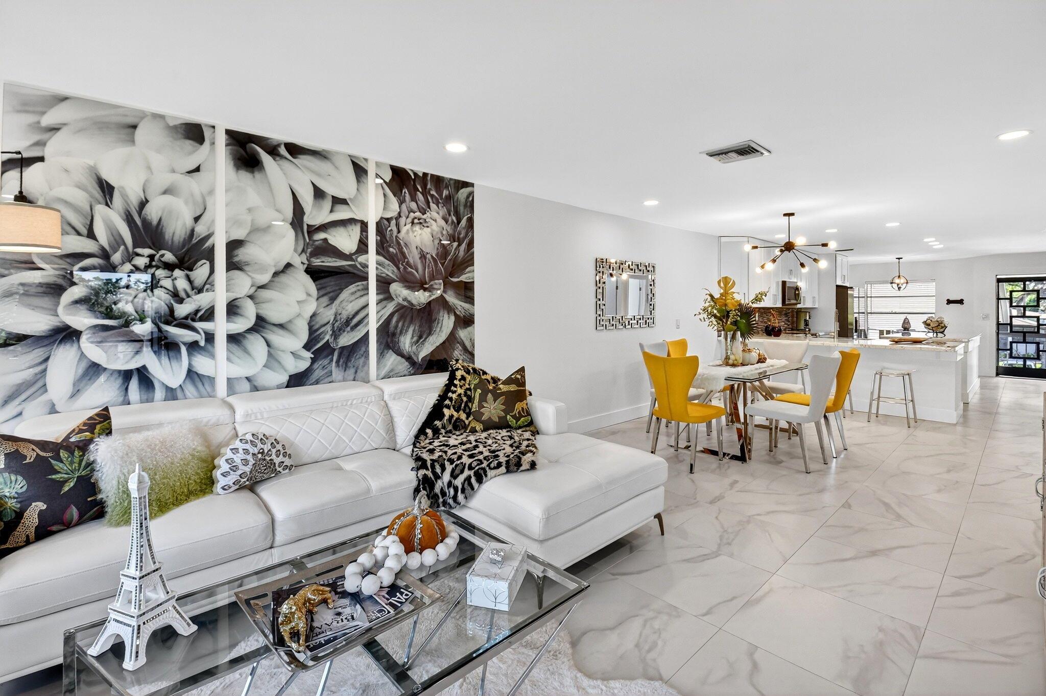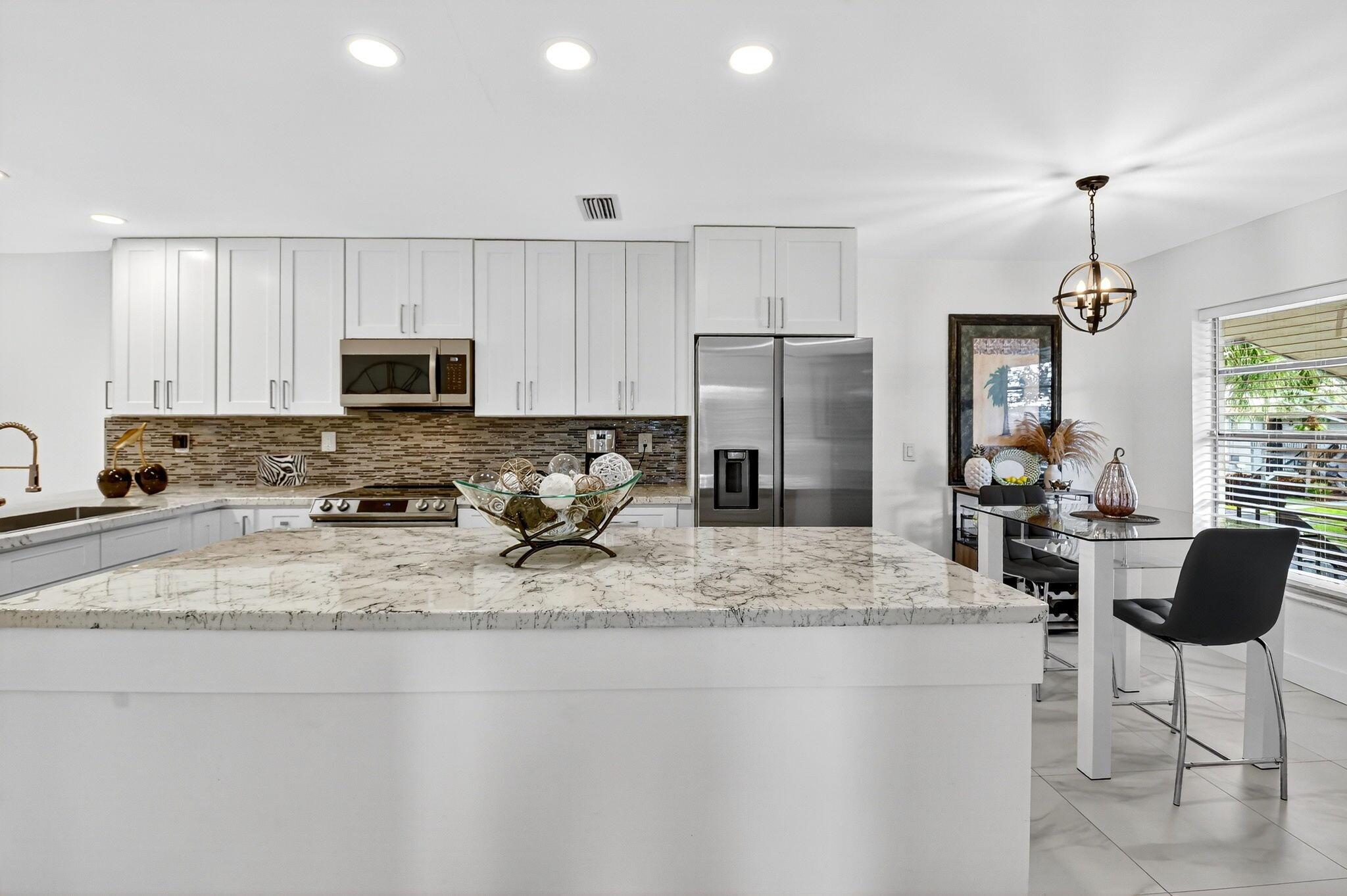 Step into luxury living with this recently and beautifully renovated corner 2 bed, 2-bath condo in the desirable Palm Greens community of Delray Beach. Bathed in natural light from its corner location, this turnkey residence has been reimagined with high-end design, top-tier finishes, and modern elegance throughout. The open-concept layout showcases beautiful large-format tile flooring, sleek pocket ceiling lighting, and an effortless flow ideal for both everyday living and entertaining. At the heart of the home sits an oversized kitchen island, perfect for gatherings, complemented by a chef's kitchen featuring high-end appliances, premium fixtures, and custom cabinetry.