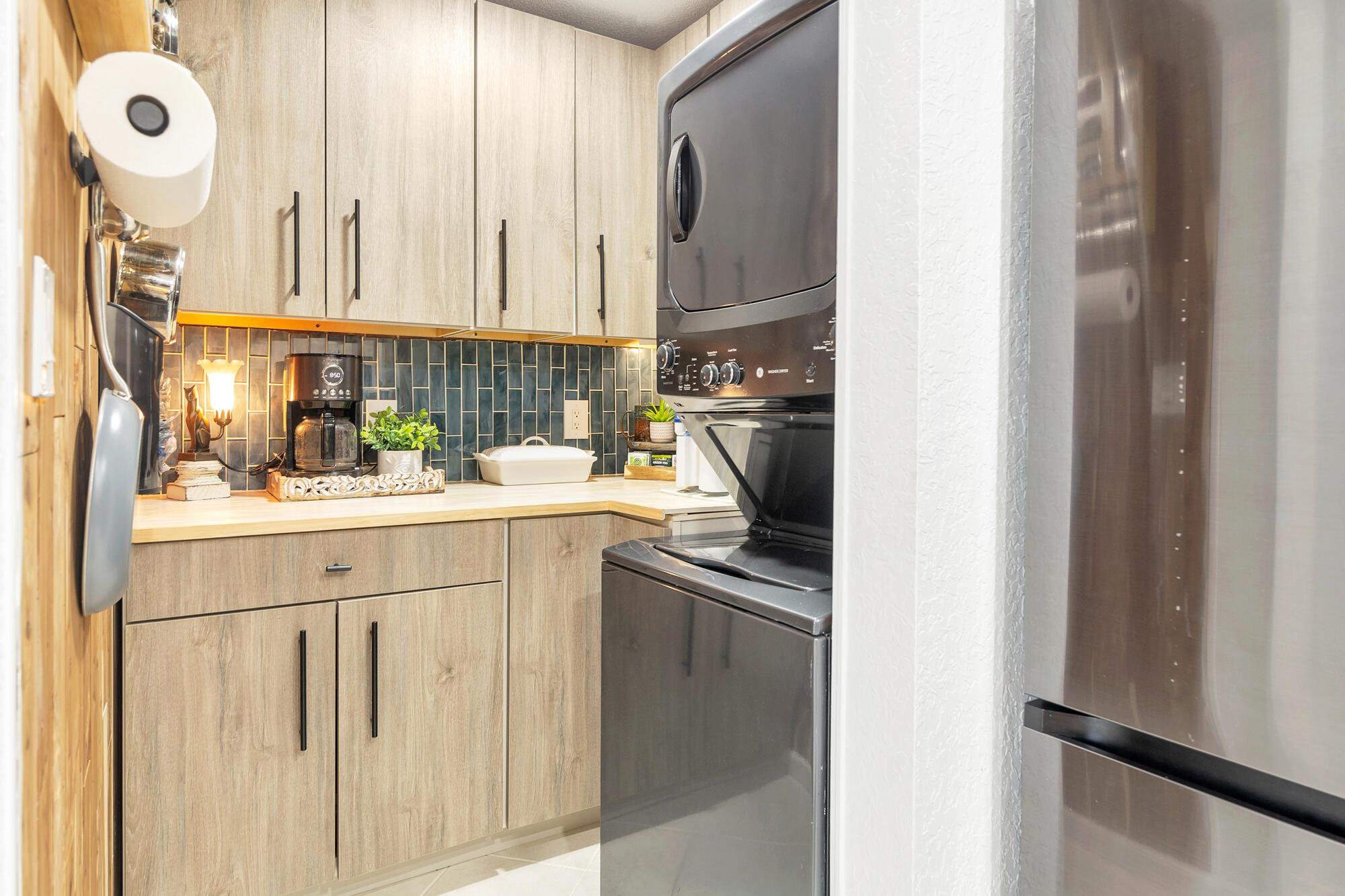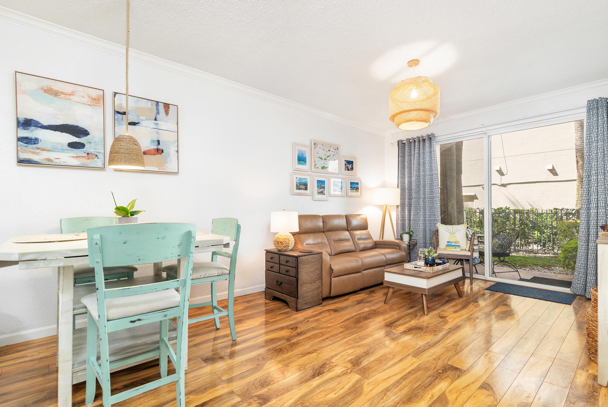 Stunning and oversized 1-bedroom, 1-bathroom condo featuring impact doors and windows throughout, offering furnished/ turnkey! Beautifully updated living space in the only gated community on Flagler Drive. This unit includes a first-floor parking space, providing convenient and easy access to your home. The owners have thoughtfully renovated the home, kitchen and walk-in laundry area they added custom built-in cabinetry for extra storage and a sleek, modern finish. Enjoy the comfort of private, quiet condo living with a yard area just off your patio--perfect for relaxing or entertaining. Recent upgrades include 2022 stainless steel appliances: dishwasher, oven, microwave, washer, and dryer. Investors welcome- no rental restrictions, building allows immediate leasing after closing.